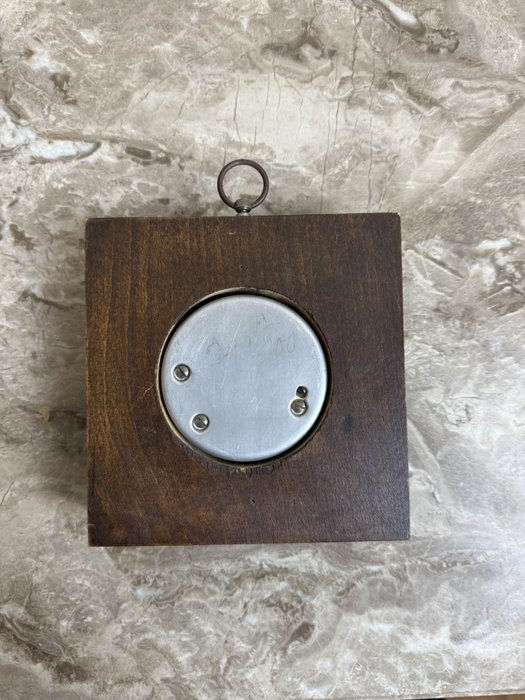 Malý barometr s čelním sklem a bílým číselníkem, na kterém najdeme francouzské nápisy jako „PLUIE“ nebo „BEAU“. Přístroj je zasazen do kovového rámečku a dřevěné podložky s kovovým očkem pro zavěšení.590 Kč