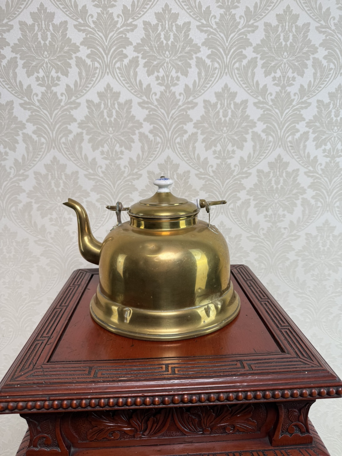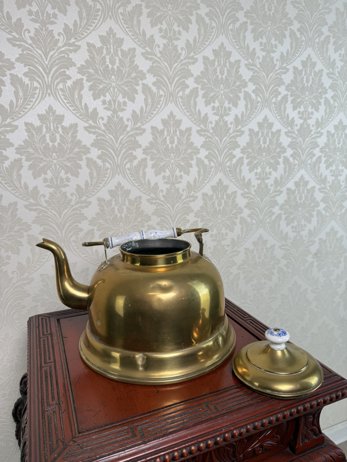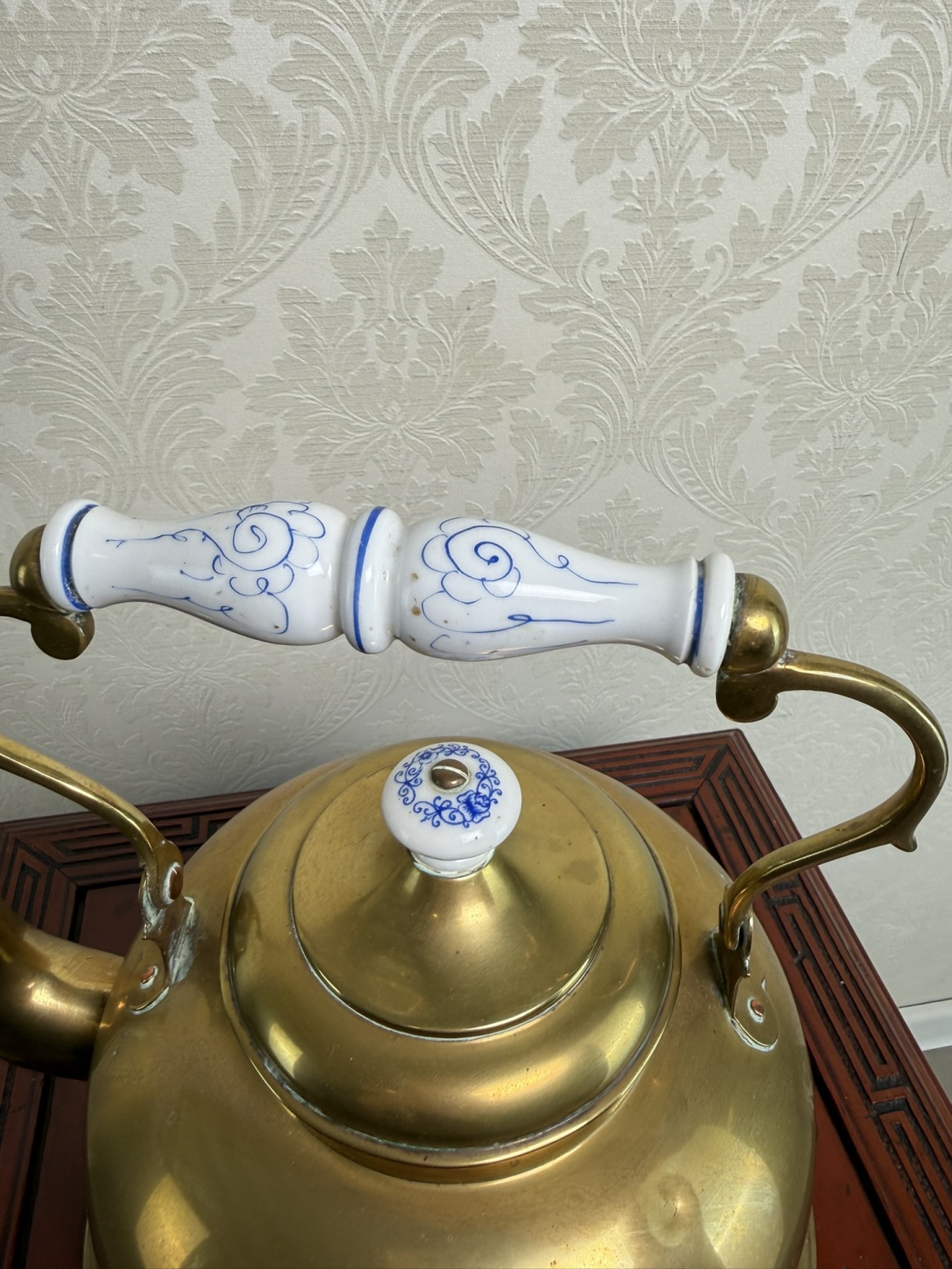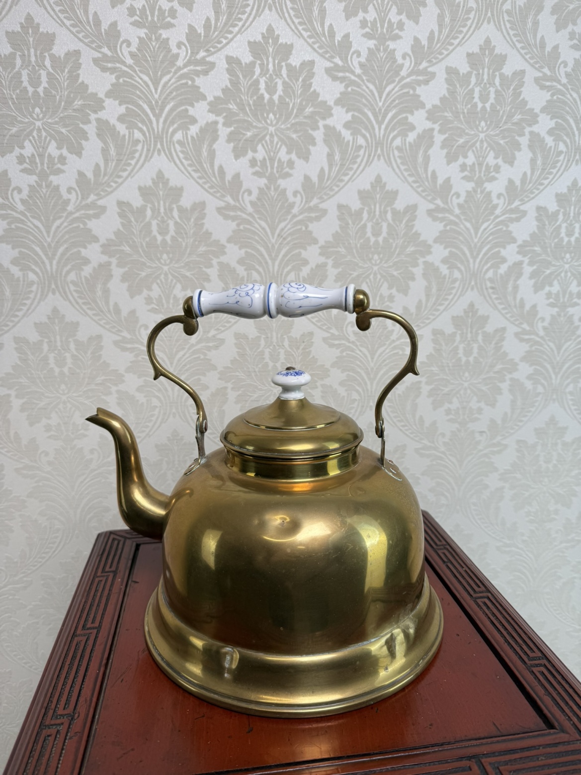 Mosazná konvice s bílými porcelánovými prvky s modrým dekorem, typickým pro dobové řemeslné zpracování. Otočné držadlo a porcelánová úchytka dodávají nádobě estetický i praktický charakter.2 180 Kč