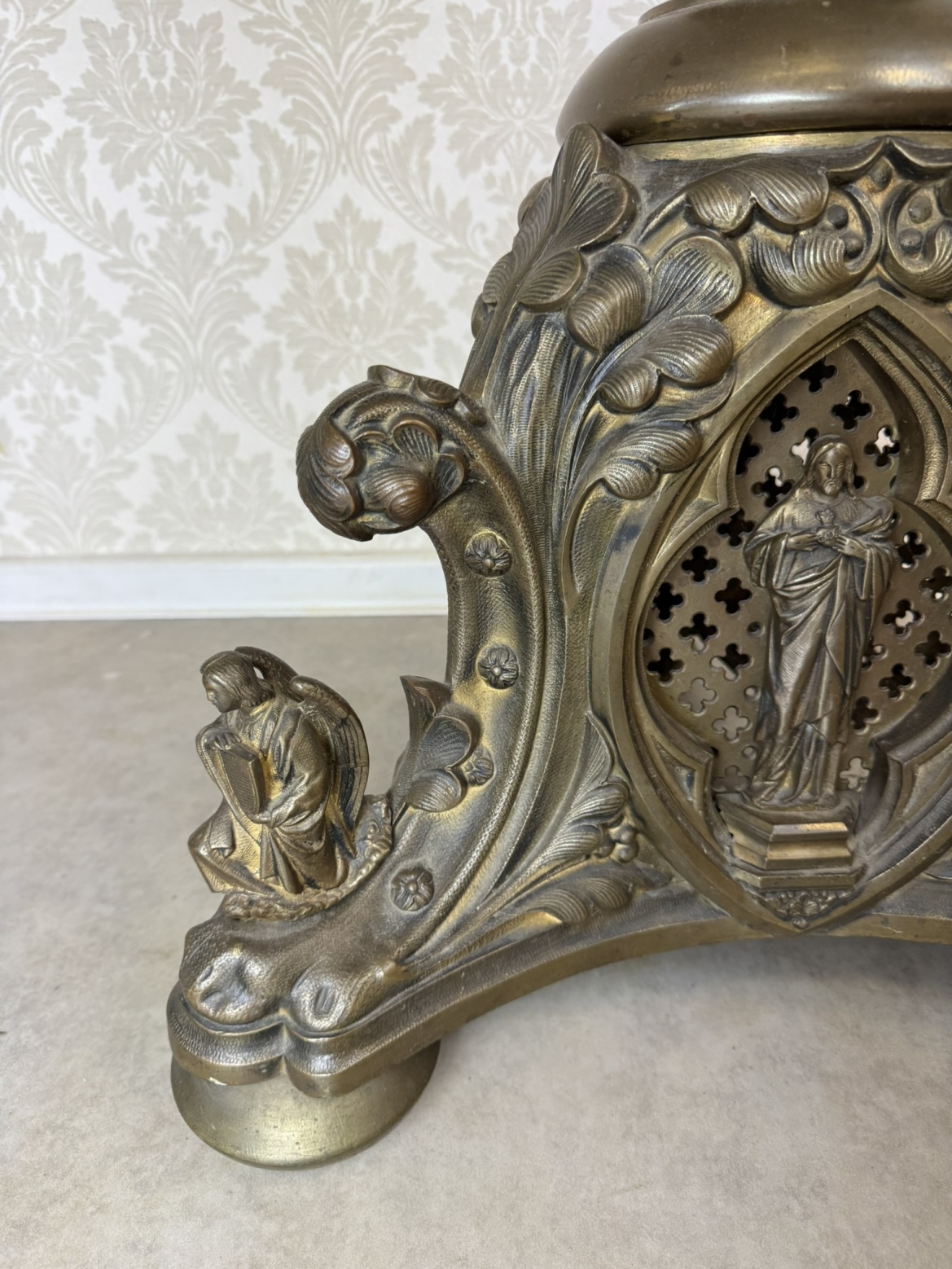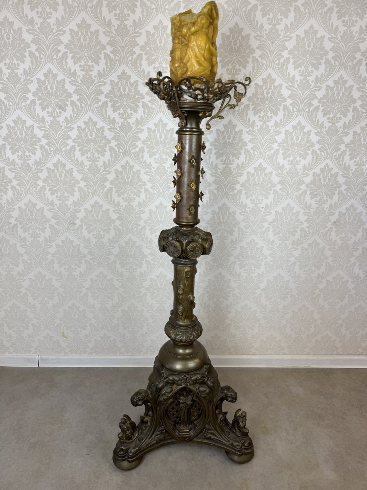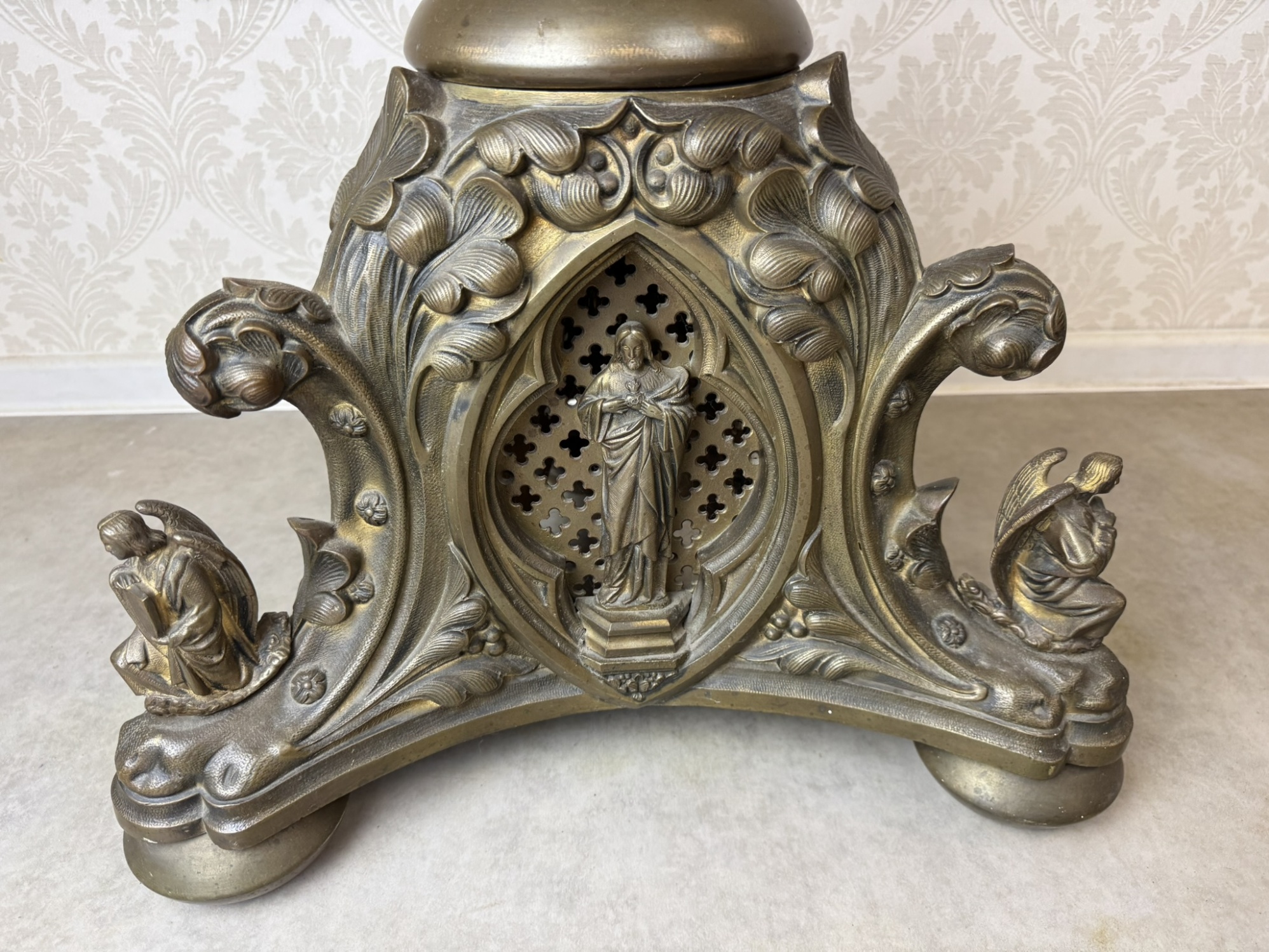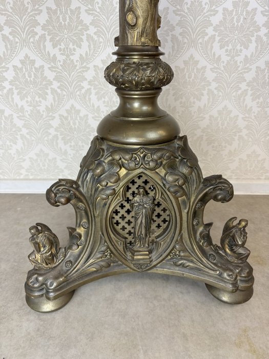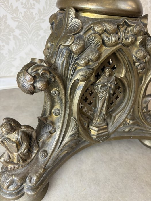 Velký stojanový svícen z patinované litiny, zdobený motivy andělů a světců. Tříramenná základna nese reliéfní medailony se stylizovanými postavami, středový dřík je osazen květinovou výzdobou a vrcholí dekorativním držákem na svíci.42 350 Kč