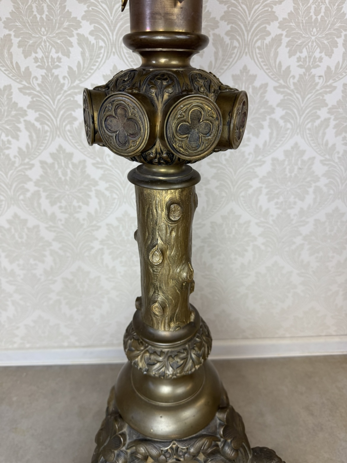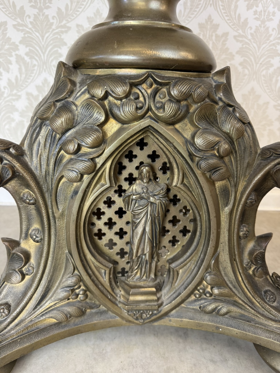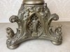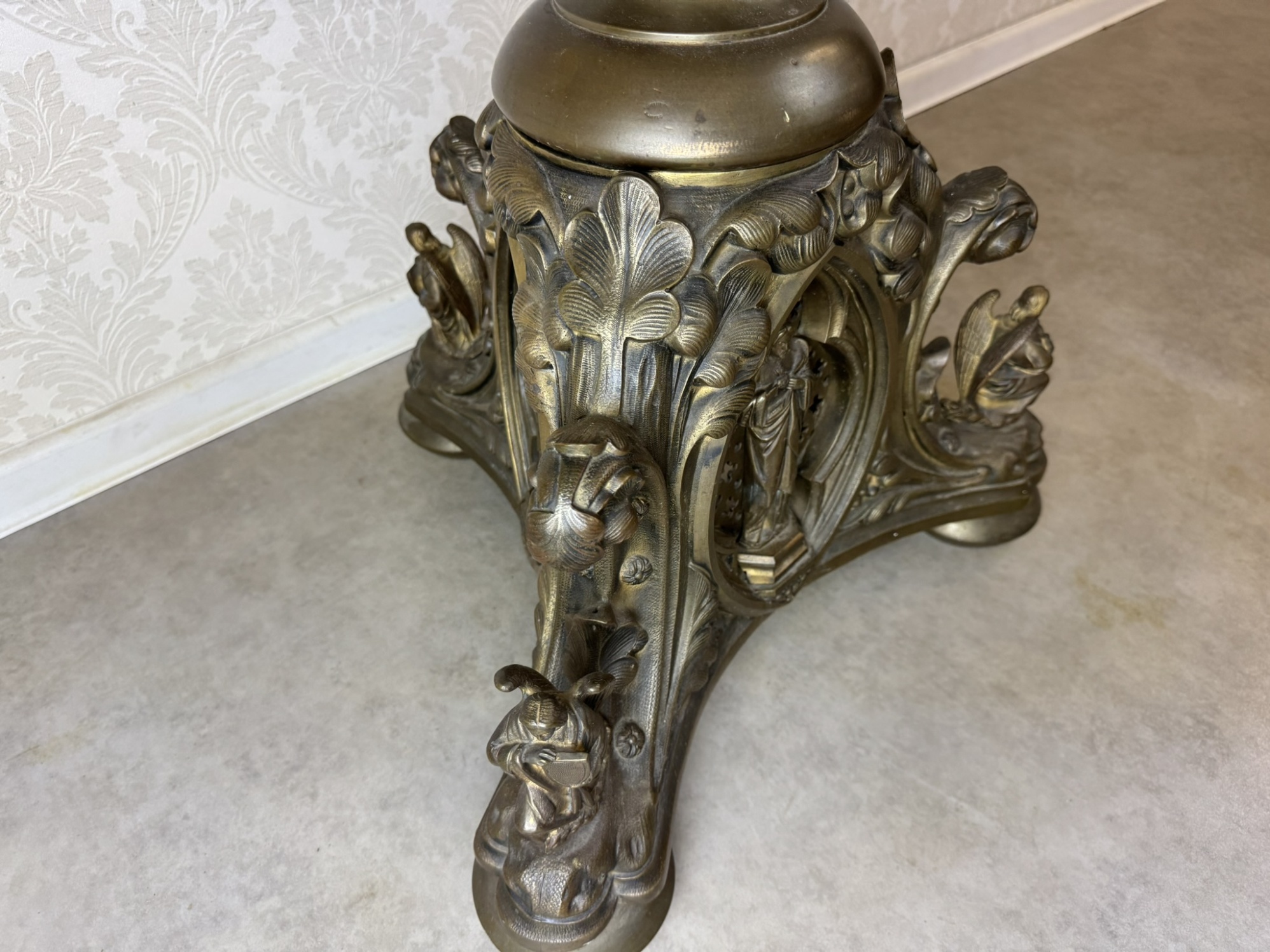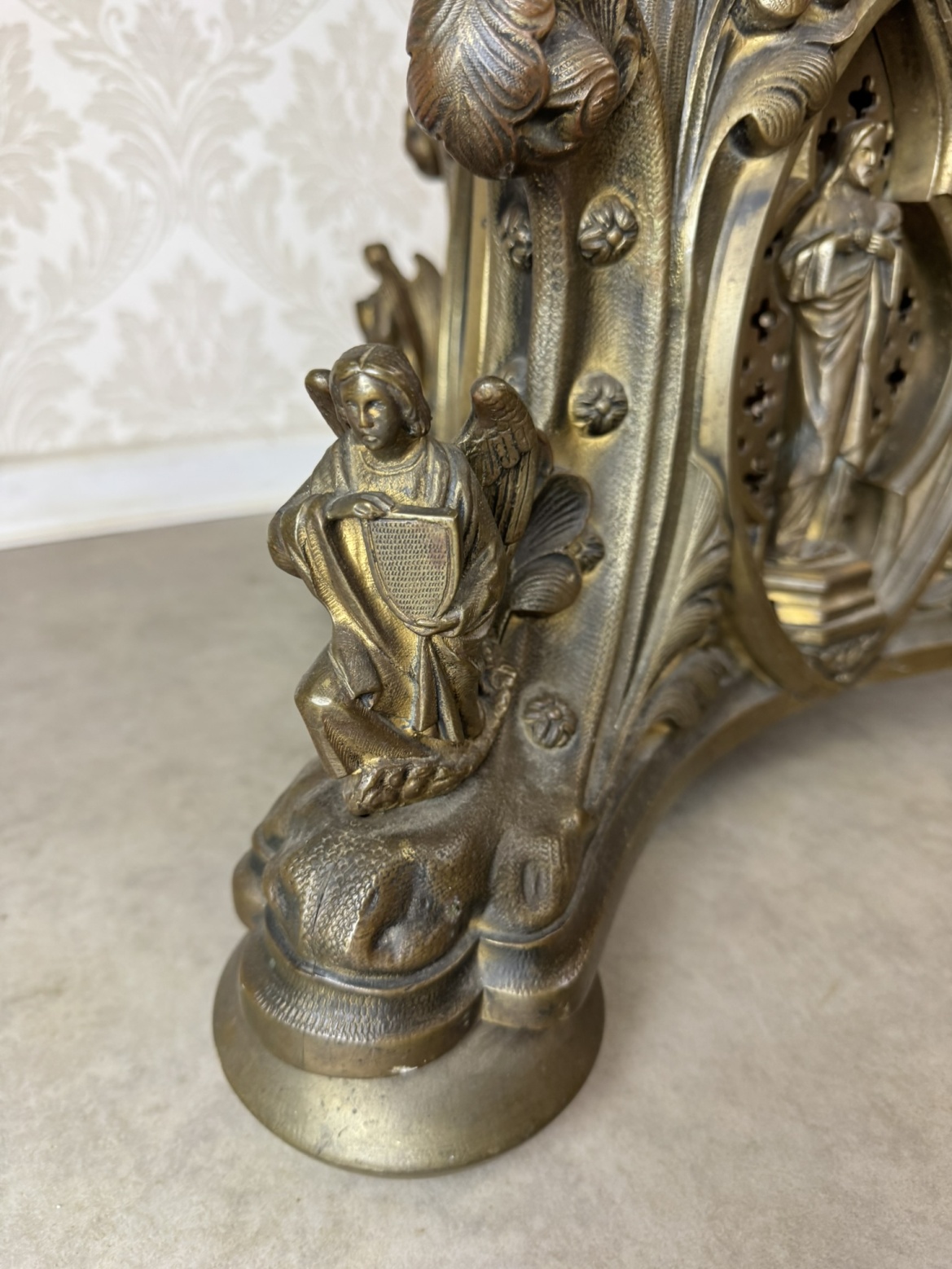 Velký stojanový svícen z patinované litiny, zdobený motivy andělů a světců. Tříramenná základna nese reliéfní medailony se stylizovanými postavami, středový dřík je osazen květinovou výzdobou a vrcholí dekorativním držákem na svíci.42 350 Kč