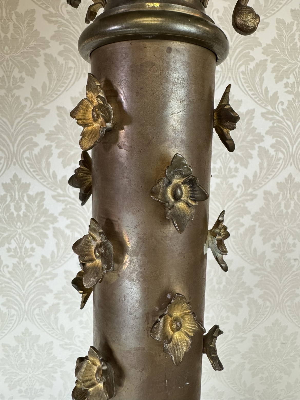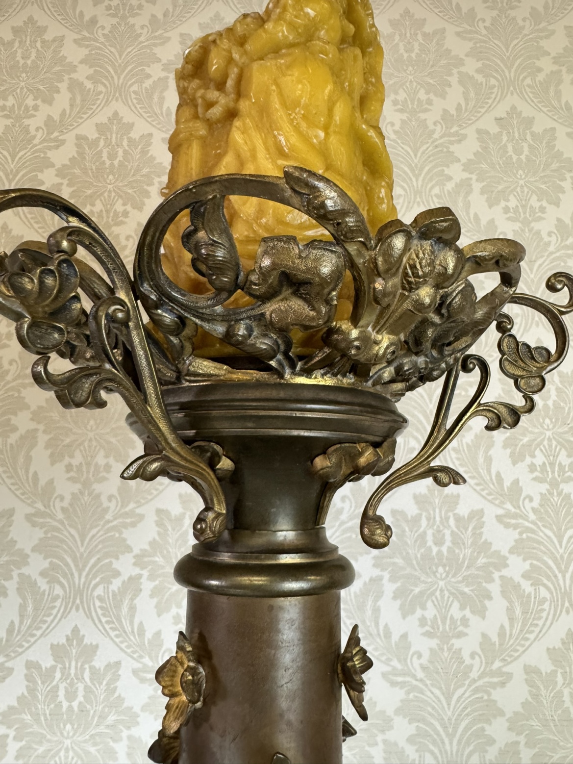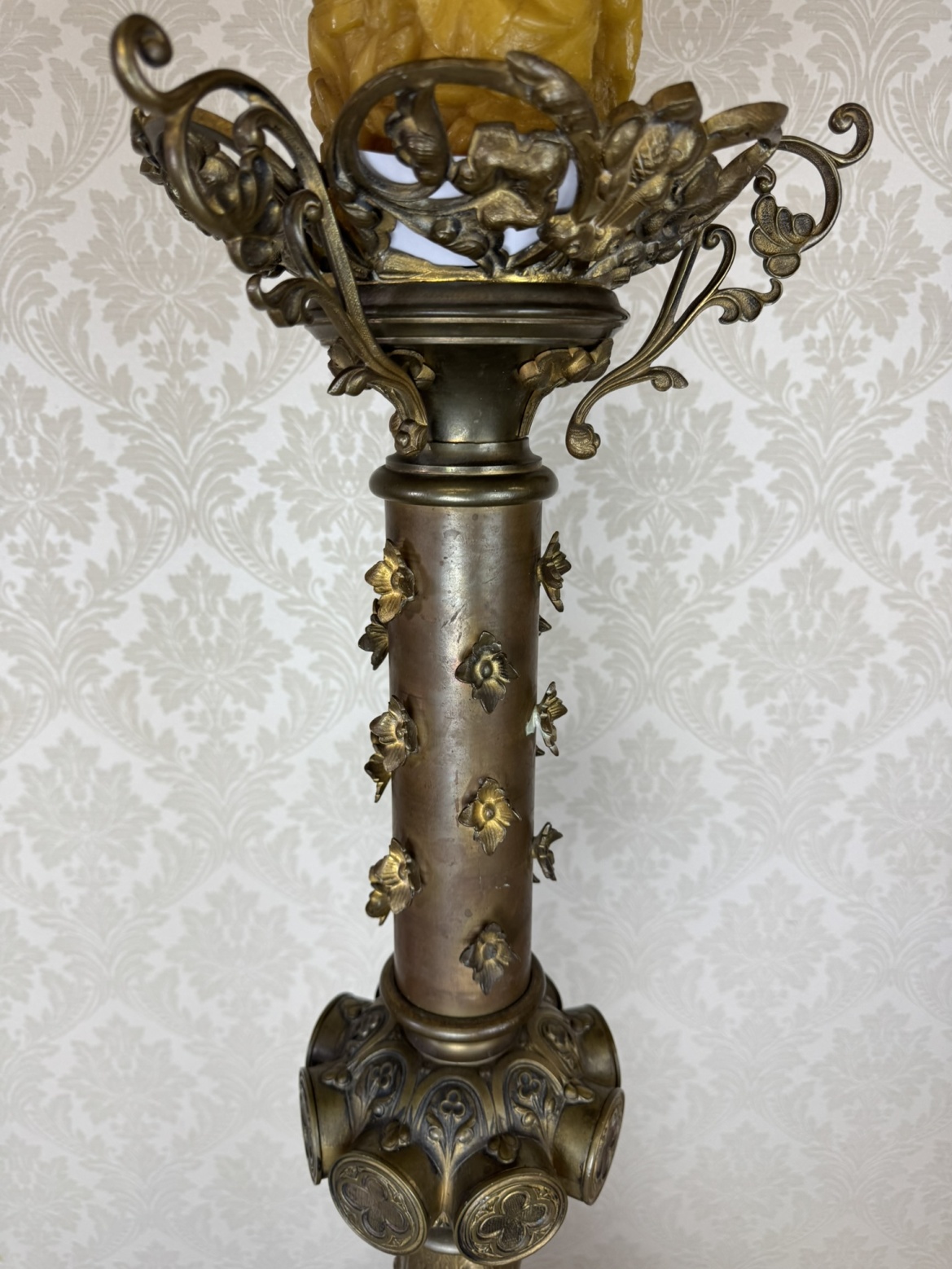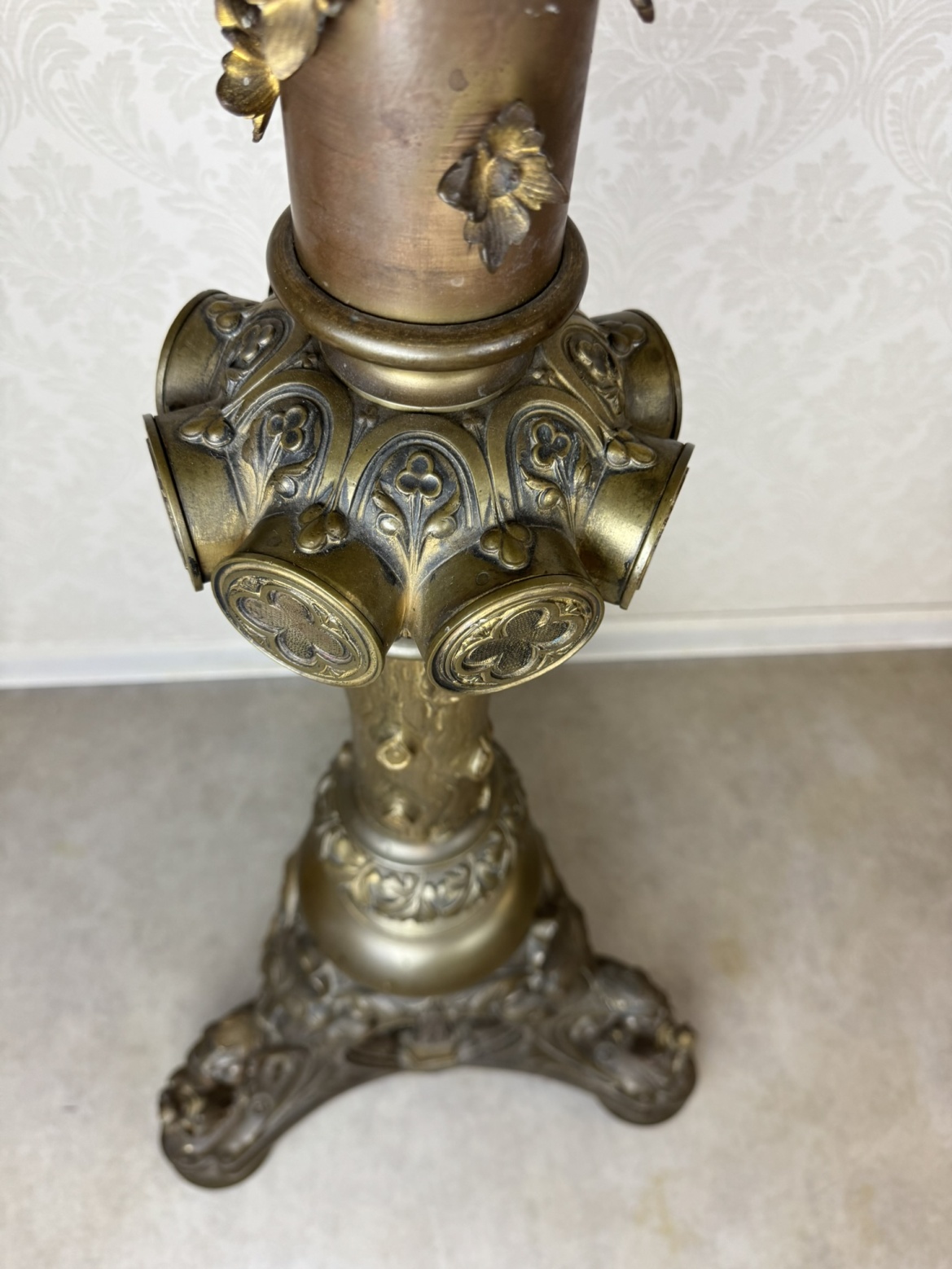 Velký stojanový svícen z patinované litiny, zdobený motivy andělů a světců. Tříramenná základna nese reliéfní medailony se stylizovanými postavami, středový dřík je osazen květinovou výzdobou a vrcholí dekorativním držákem na svíci.42 350 Kč