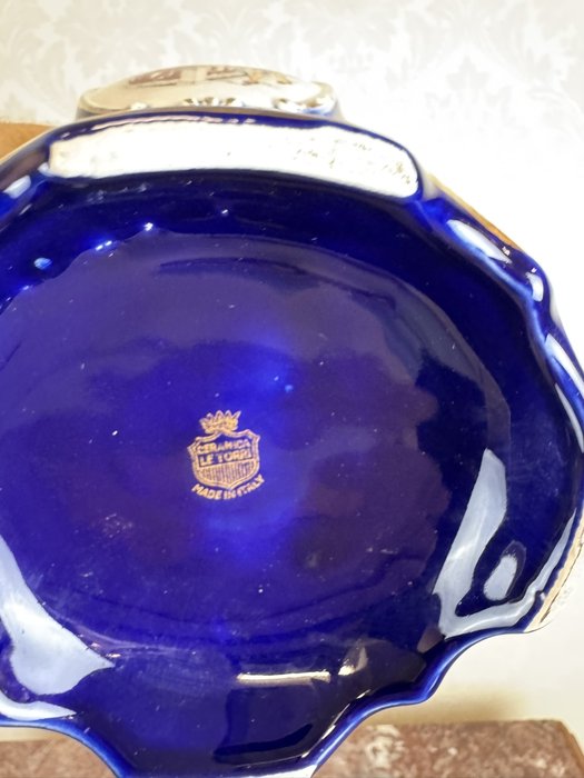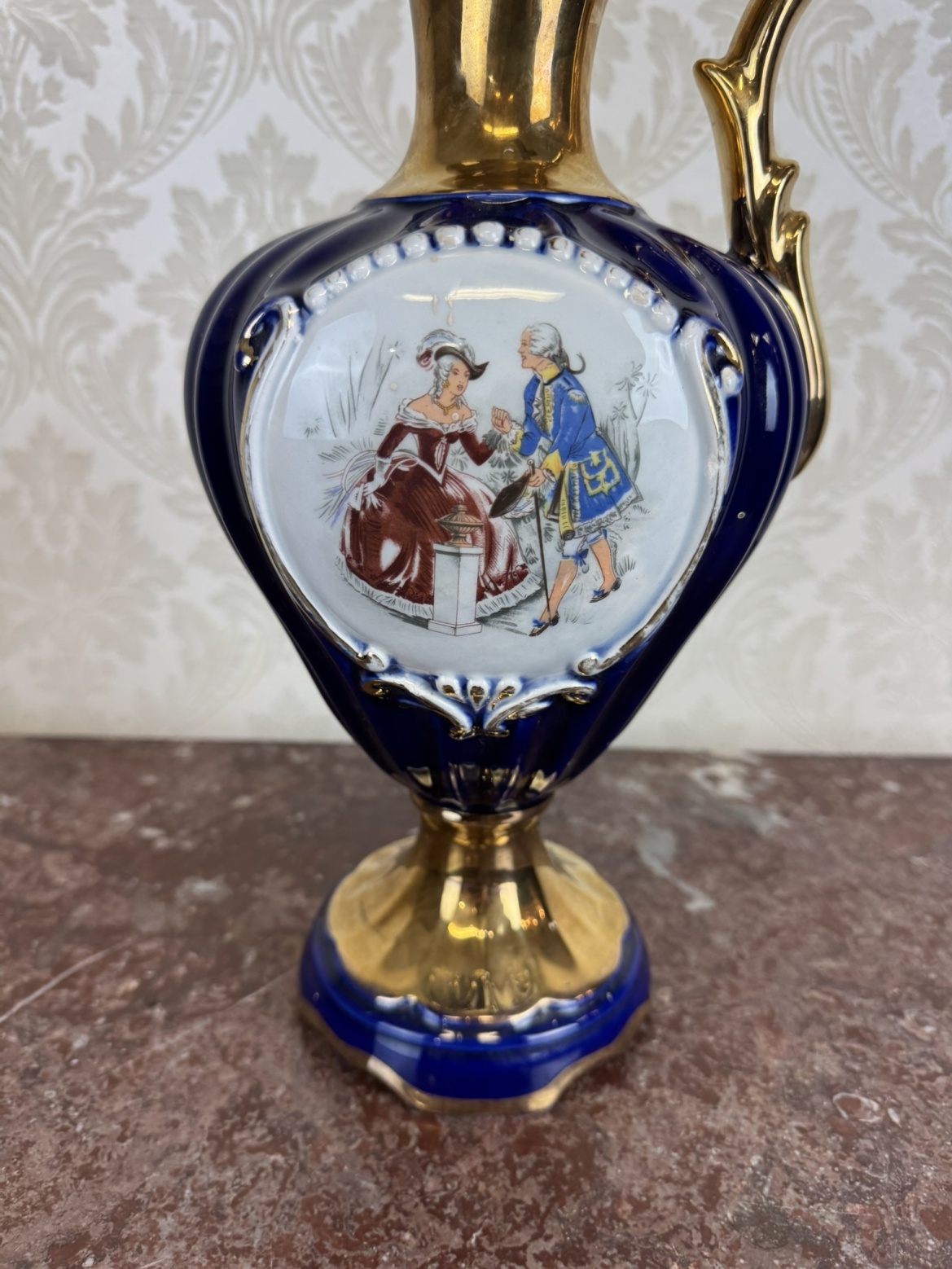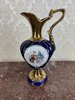 Váza z kobaltově modrého porcelánu má zlatě glazované hrdlo, ucho a podstavec. Na přední straně je oválná medailonová malba s rokokovou galantní scénou muže a ženy, lemovaná plastickými perlami v bílém provedení.1 180 Kč
