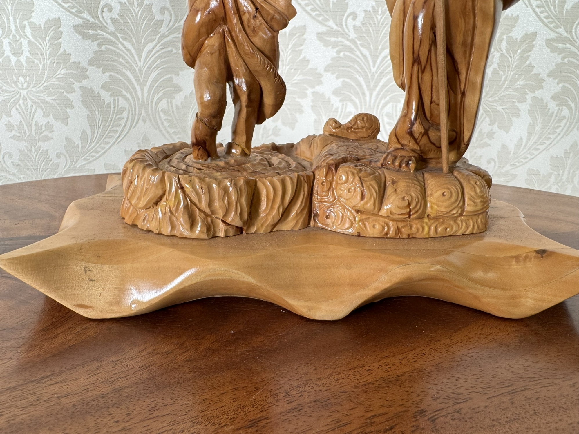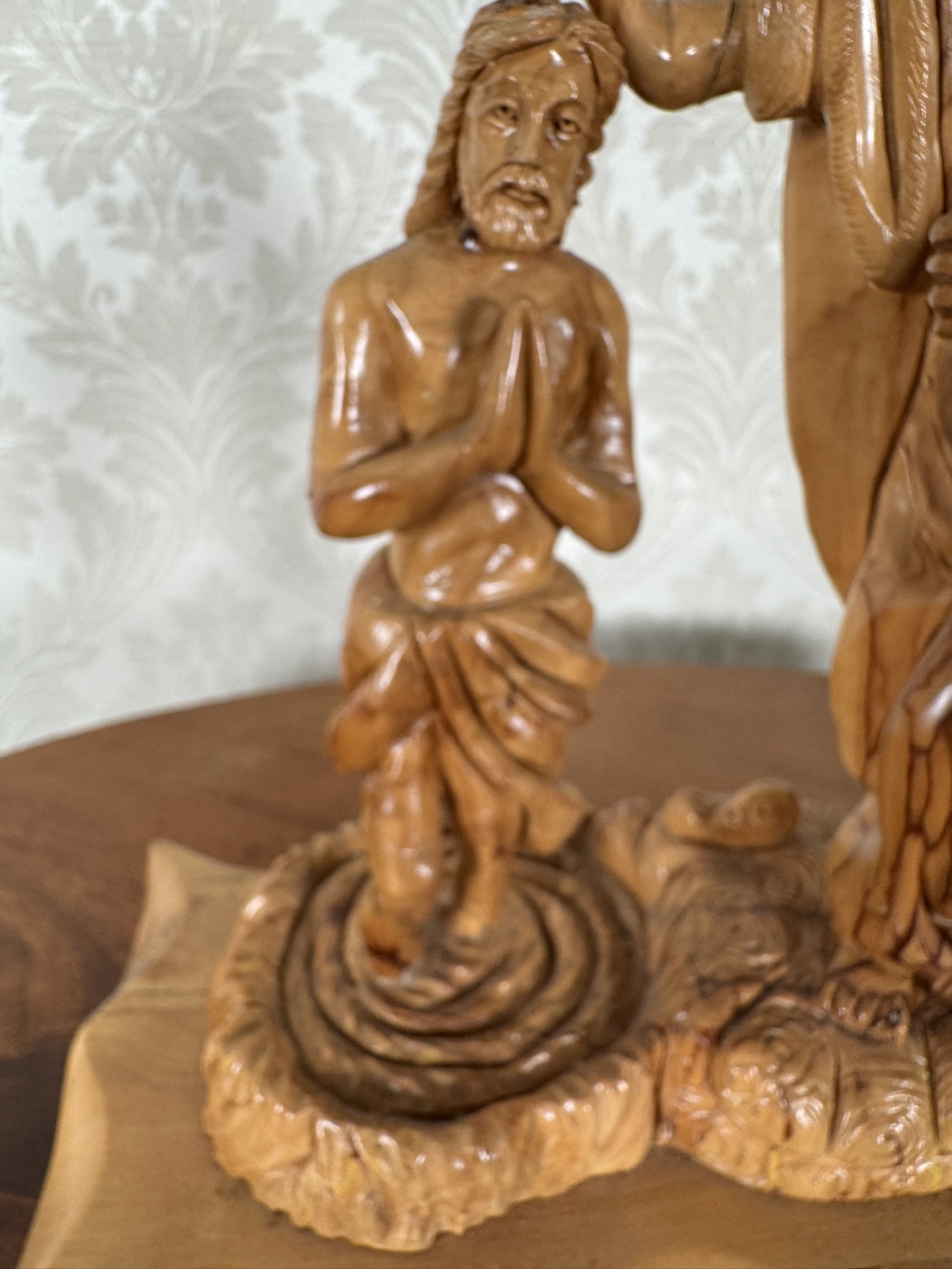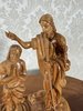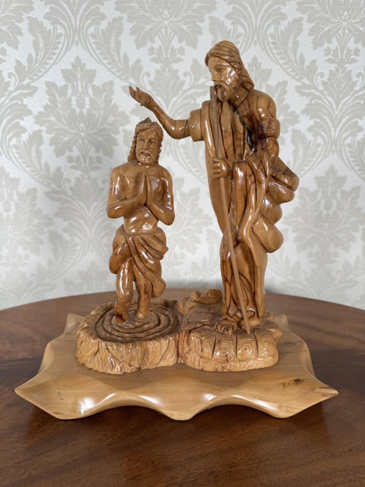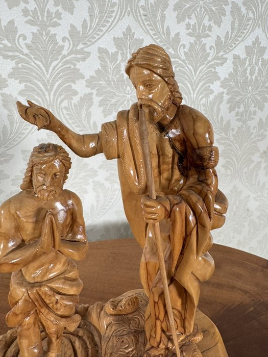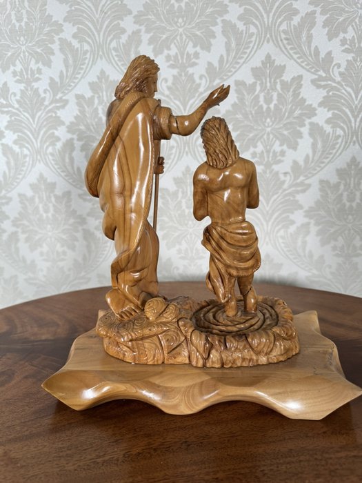 Ručně vyřezávaná dřevěná plastika znázorňující biblický výjev křtu Ježíše Krista Janem Křtitelem. Kompozice vyniká výraznou kresbou dřeva, detailní mimikou a jemně tvarovaným podstavcem připomínajícím hladinu vody.2 480 Kč