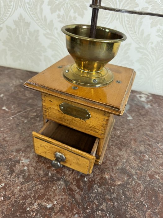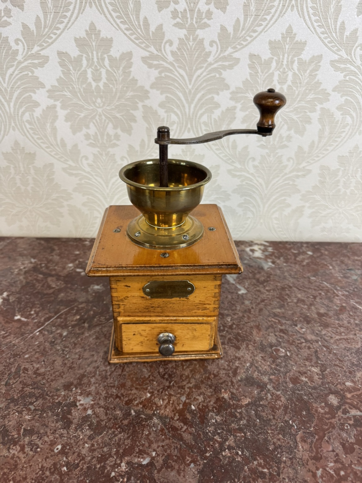 Ruční mlýnek na kávu s dřevěnou kostkou, mosaznou násypkou a ocelovou kličkou s dřevěnou rukojetí. Spodní část doplňuje zásuvka na mletou kávu s kulatým kovovým úchytem.1 150 Kč