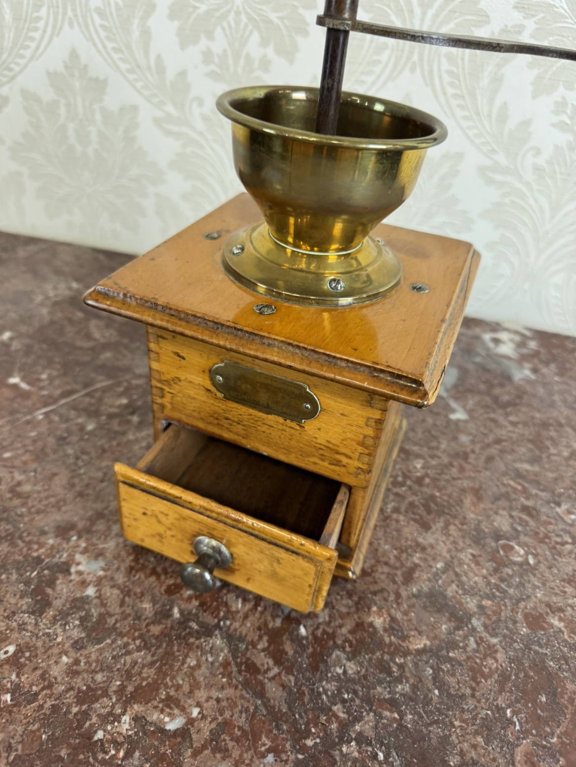 Dřevěný mlýnek na kávu s mosaznou násypkou a zásuvkou - f239