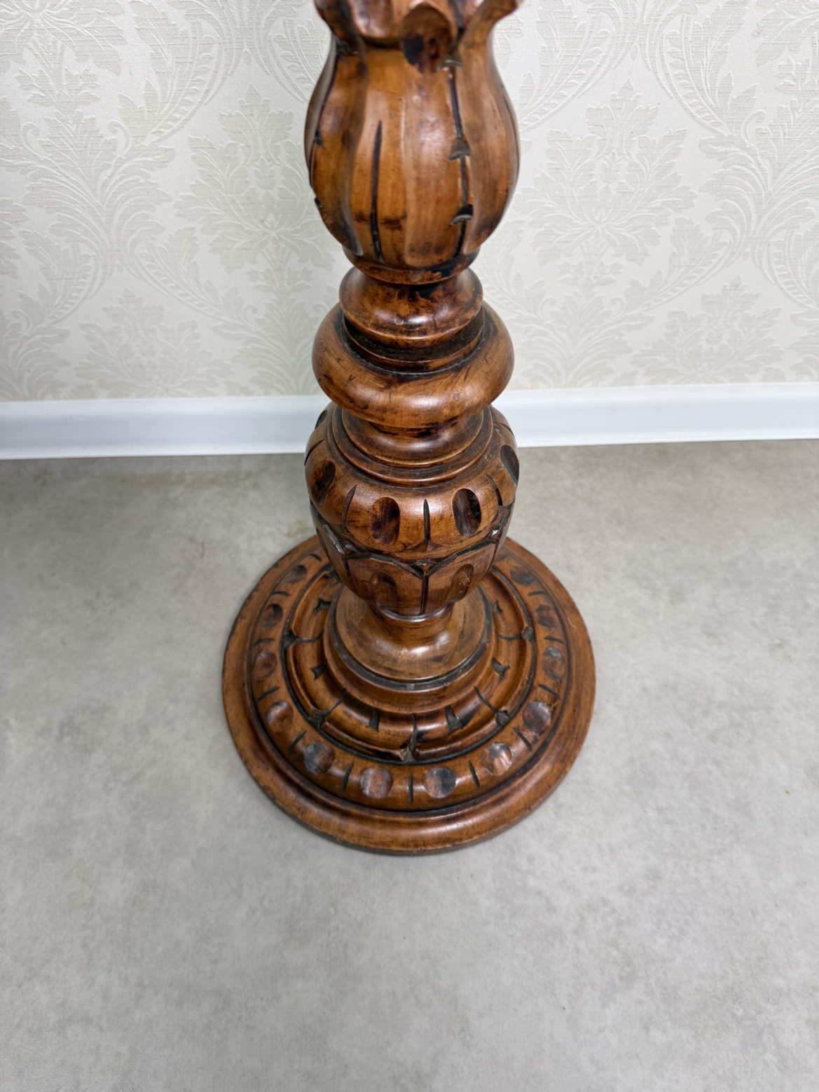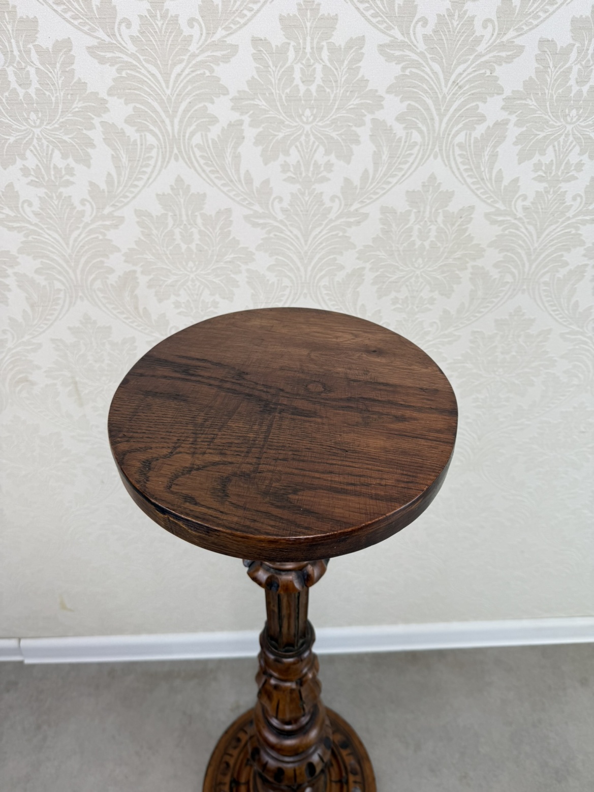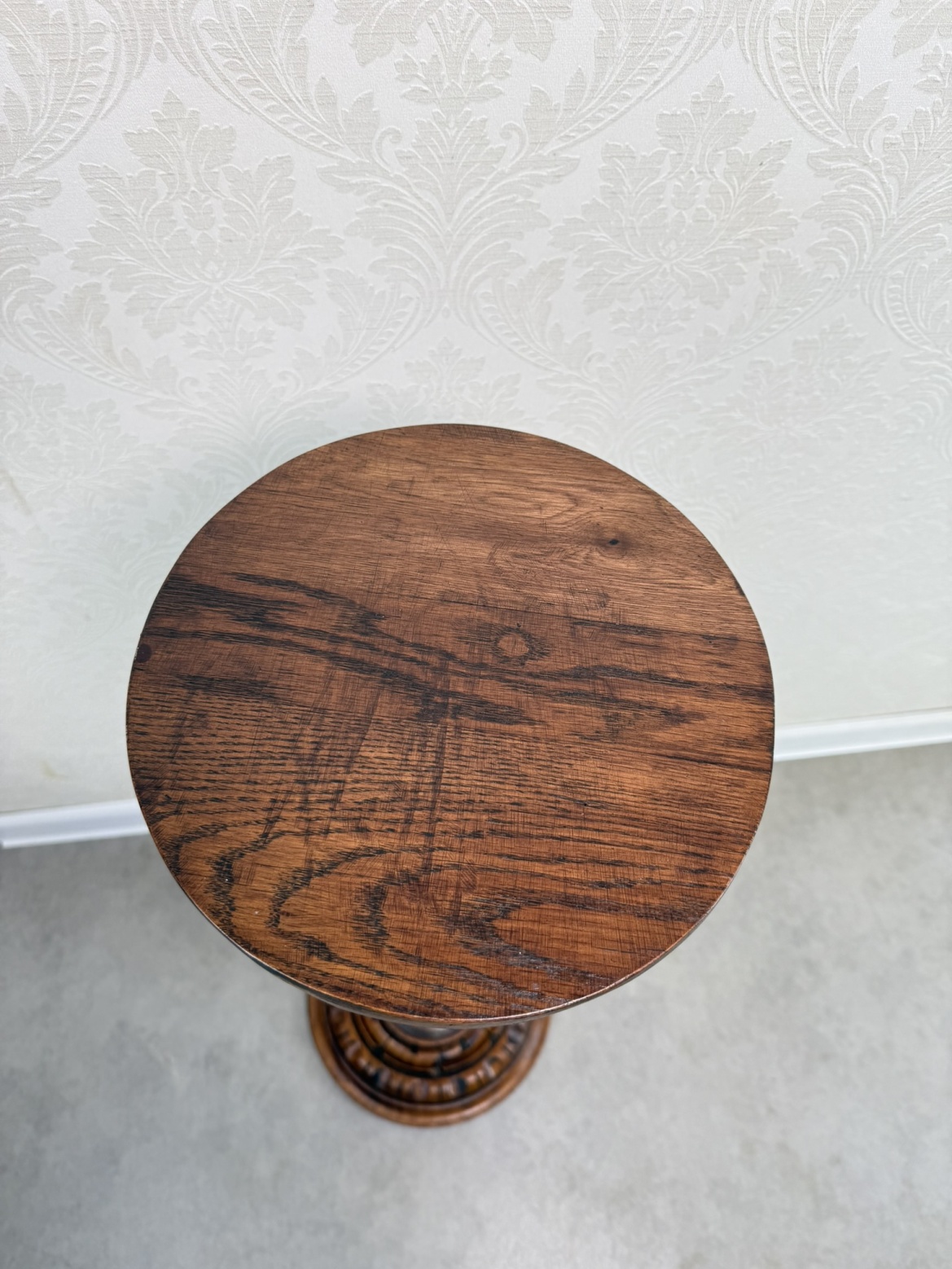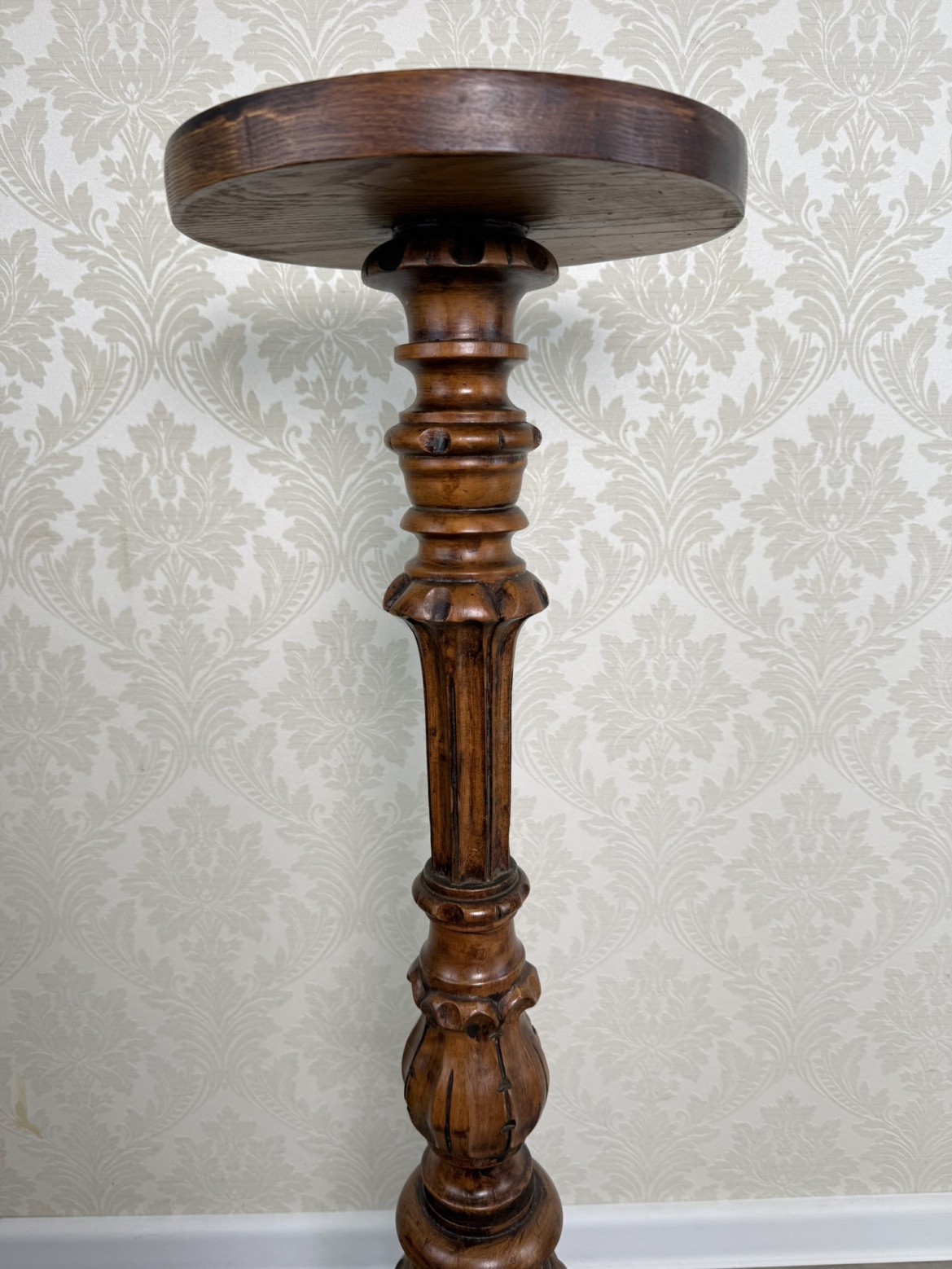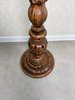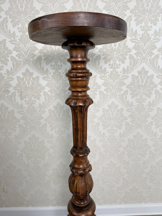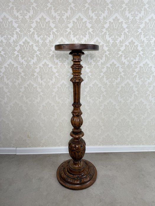 Dřevěný podstavec se soustruženou nohou s plastickými detaily a širší profilovanou základnou. Kulatá horní deska vhodná pro umístění sošky, květináče nebo jiné dekorace. Povrch nese jemnou patinu, která zvýrazňuje kresbu dřeva i drobné řezbované prvky.5 980 Kč