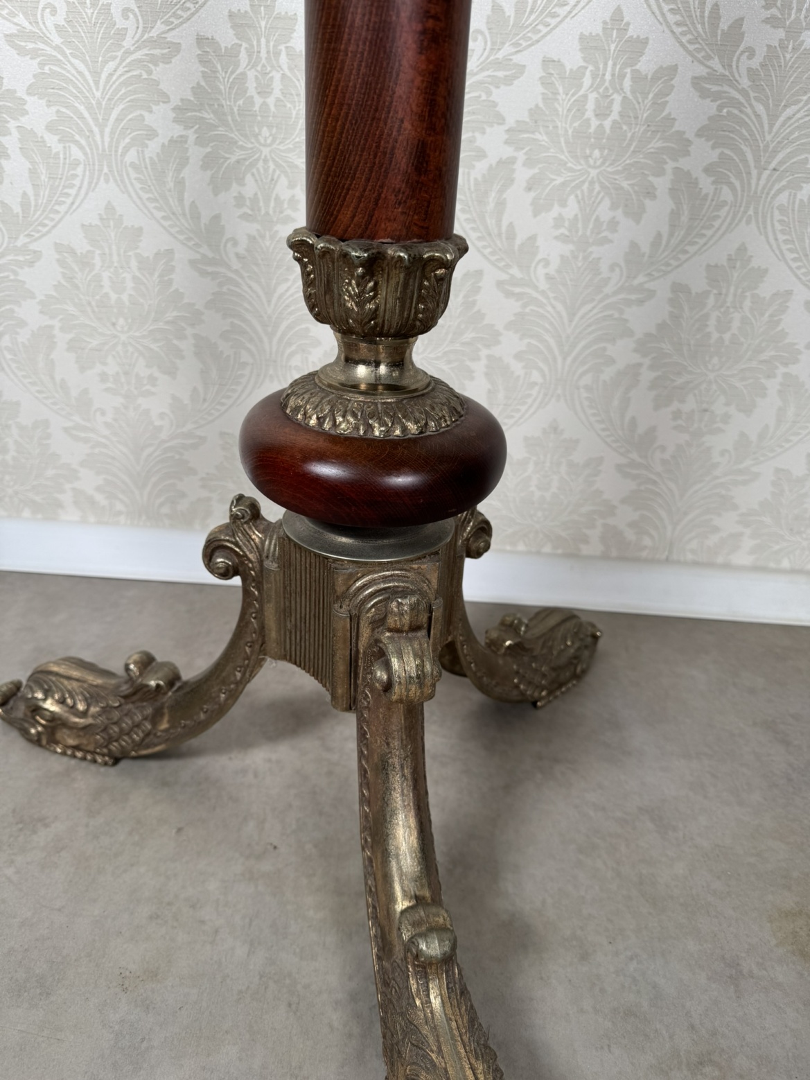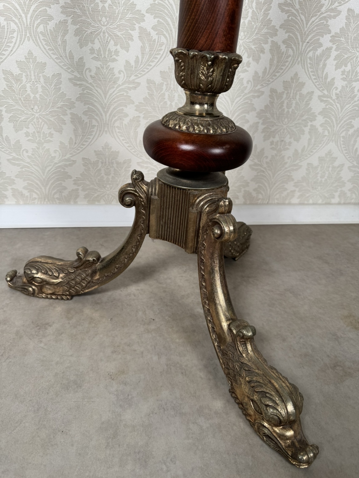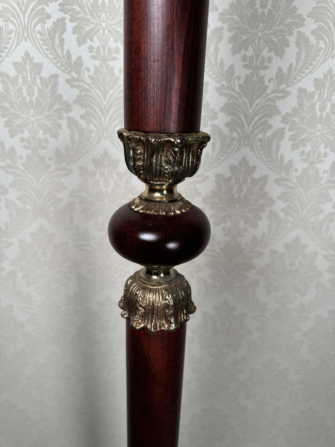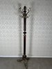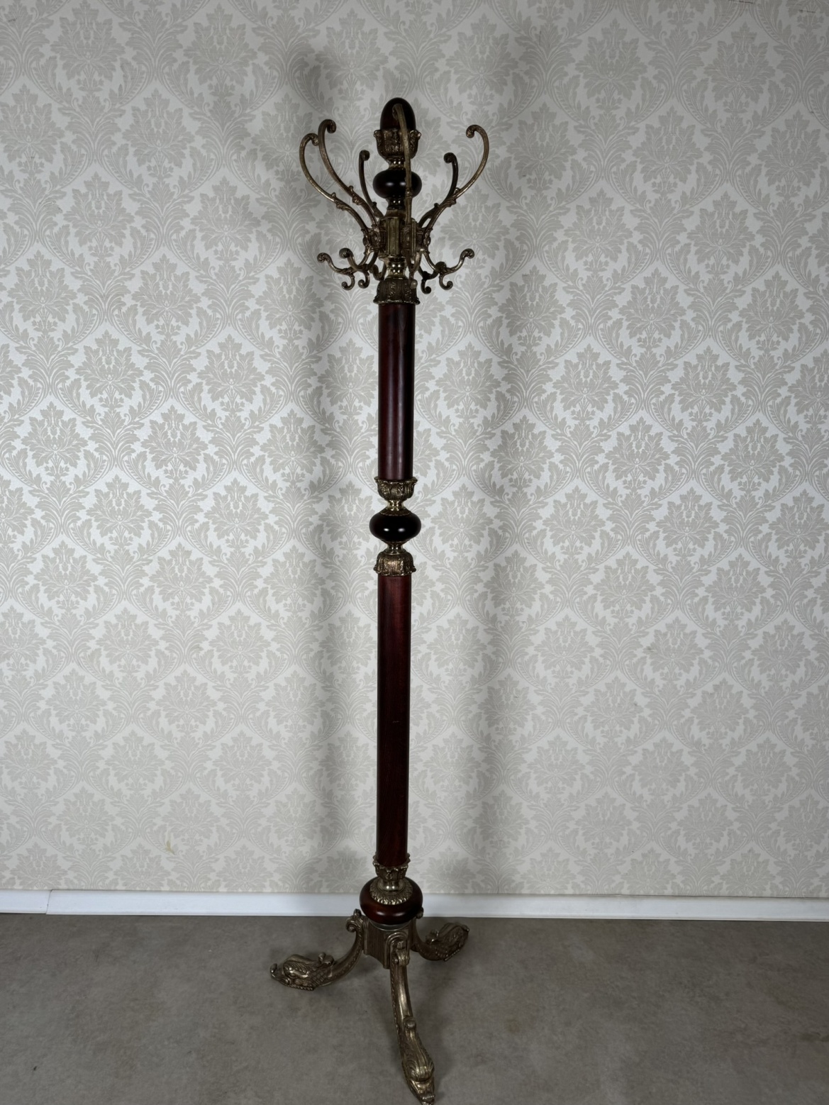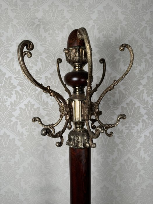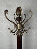 Reprezentativní věšák kombinující tmavě mořený dřevěný sloup s bohatě zdobenými kovovými prvky. Vrchní část je osazena několika háky s florálními detaily, zakončení nese akantové hlavice a finial. Spodní tříramenná základna je formována do tvaru dračích hlav.8 980 Kč