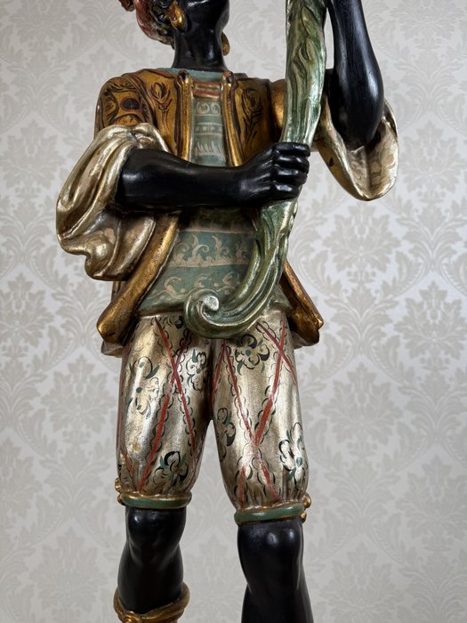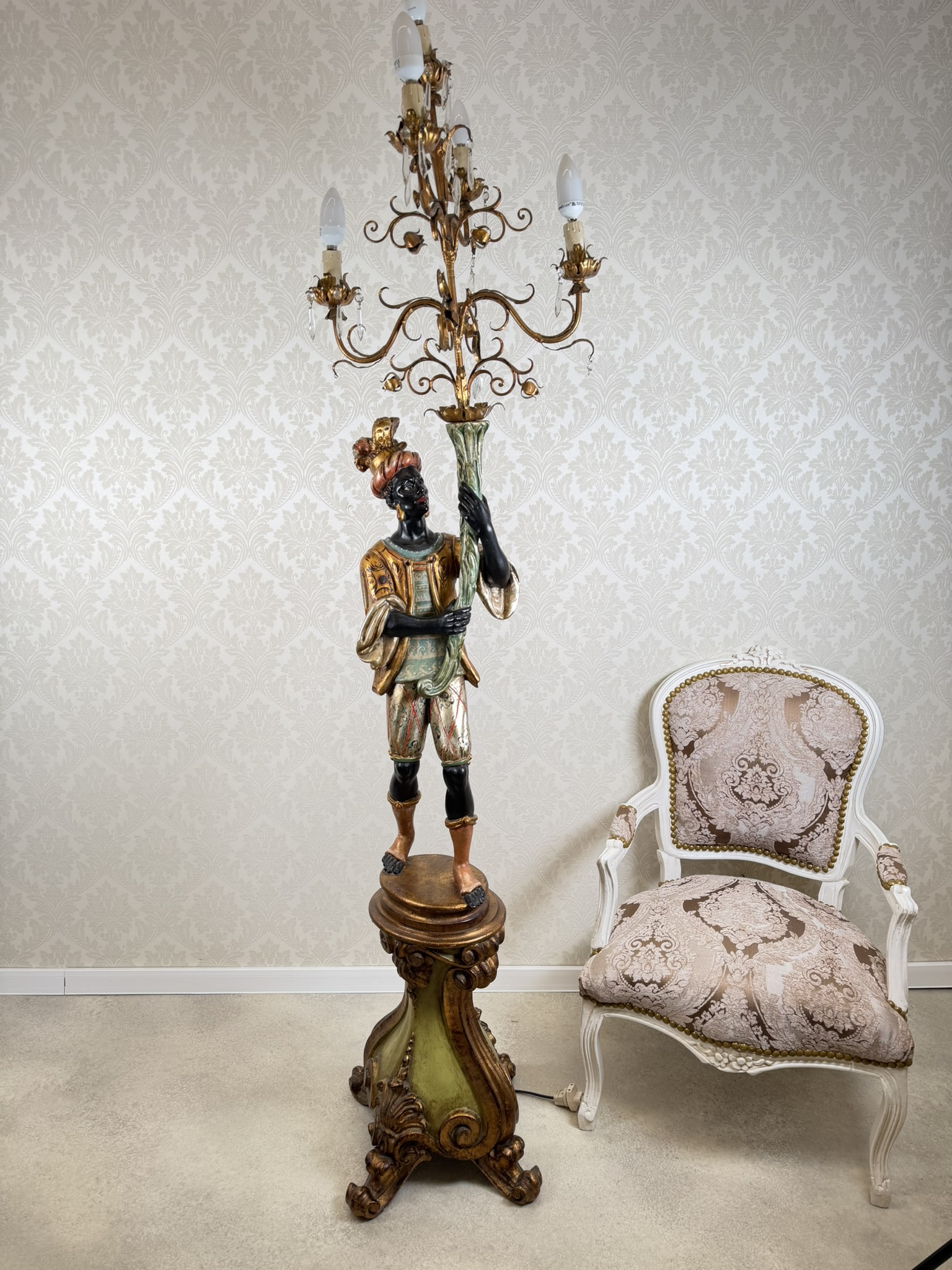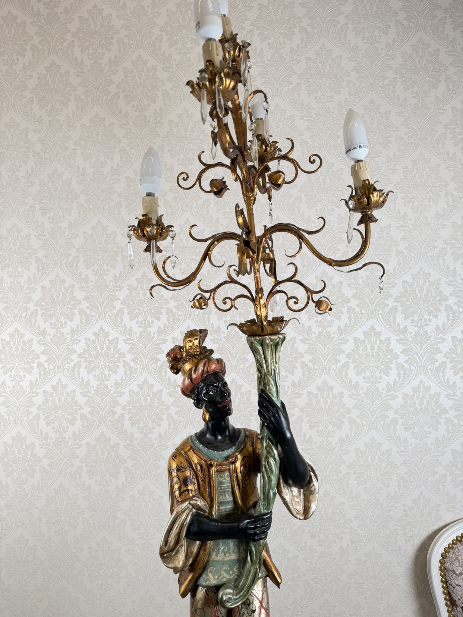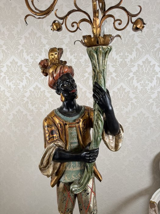Zobrazuje postavu muže v orientálním oděvu, který drží bohatě zdobený lustr s pěti funkčními světly. Ručně malované detaily na oděvu a těle postavy. Podstavec lampy je propracovaný s barokními ornamenty, které dodávají celé lampě majestátní vzhled.39 850 Kč
