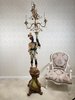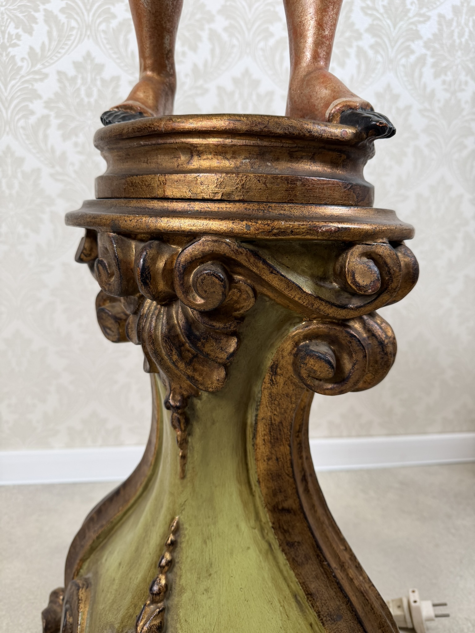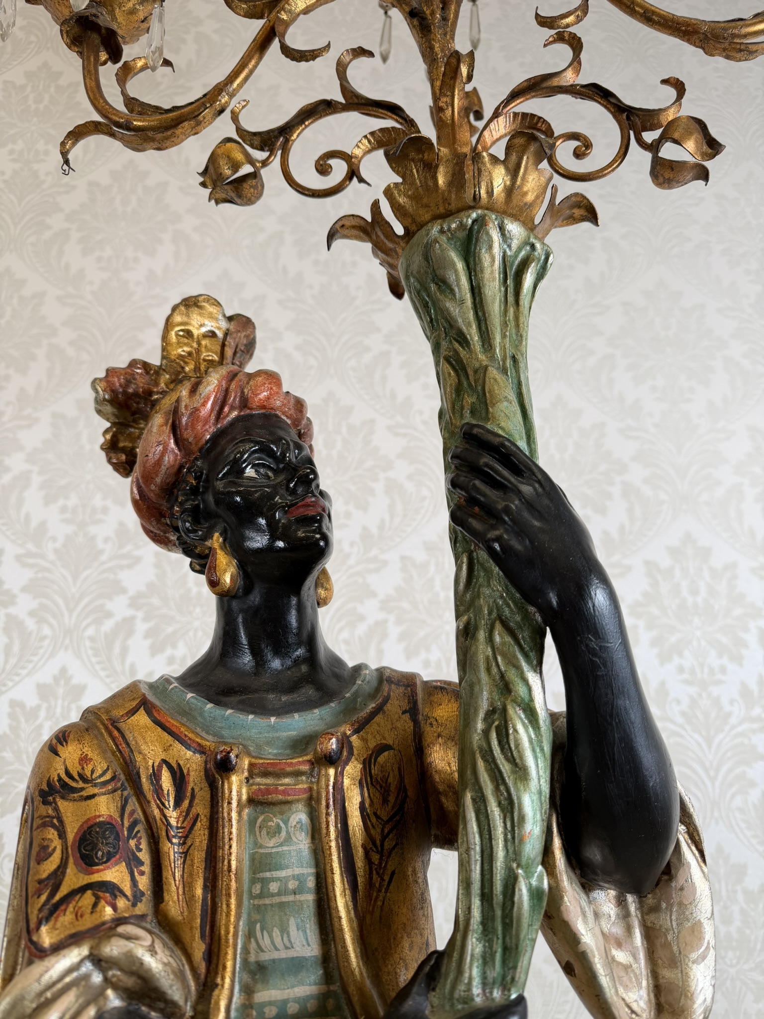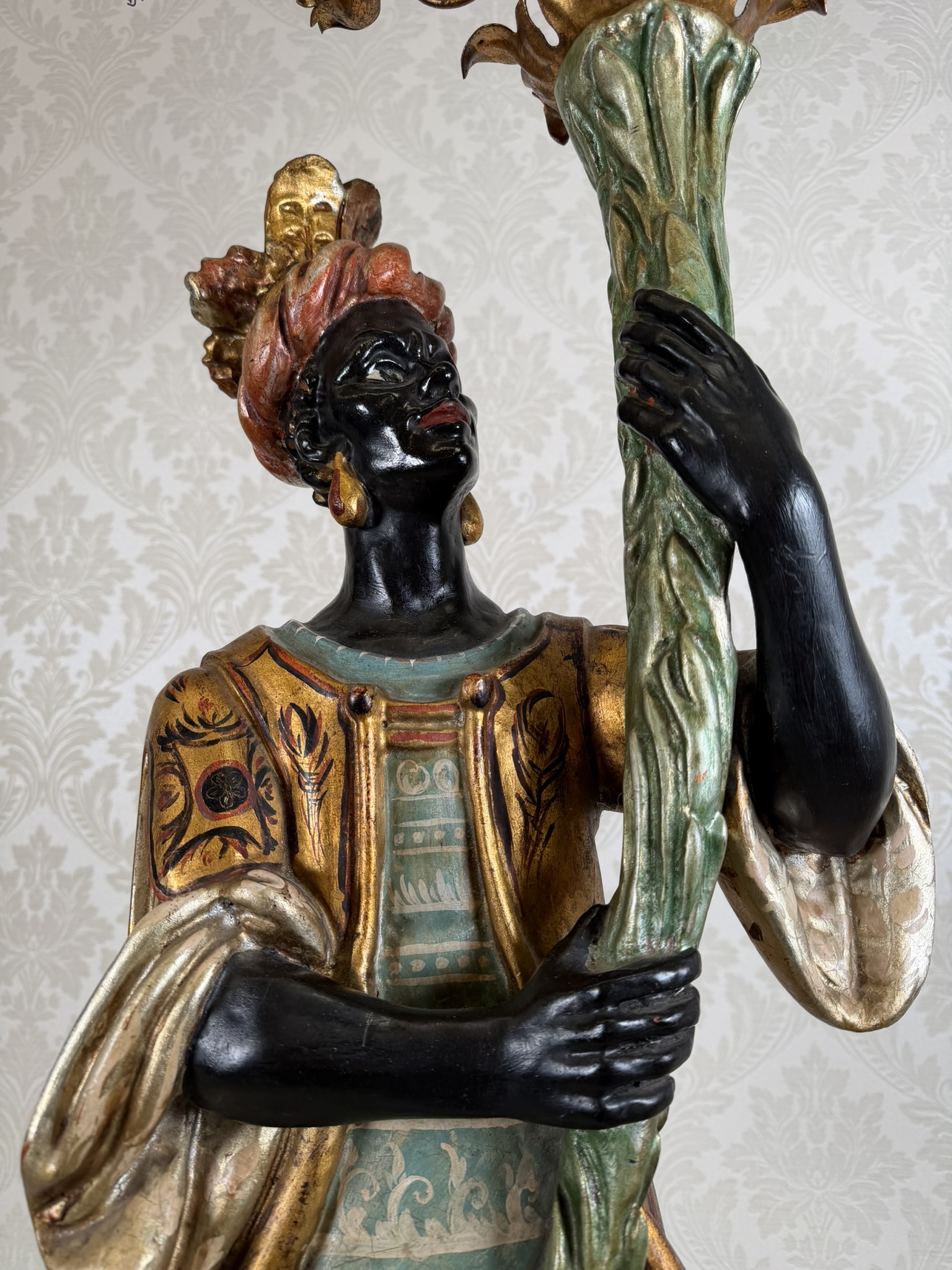 Zobrazuje postavu muže v orientálním oděvu, který drží bohatě zdobený lustr s pěti funkčními světly. Ručně malované detaily na oděvu a těle postavy. Podstavec lampy je propracovaný s barokními ornamenty, které dodávají celé lampě majestátní vzhled.39 850 Kč