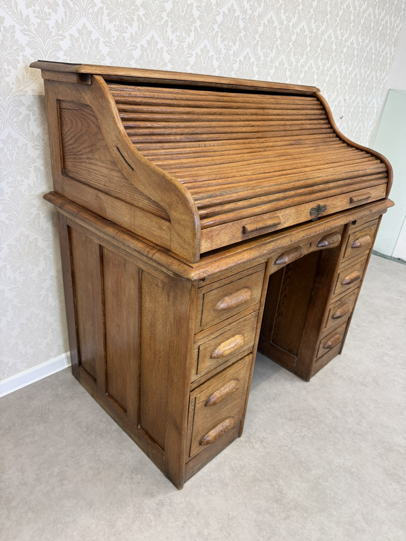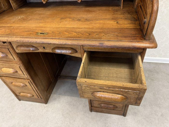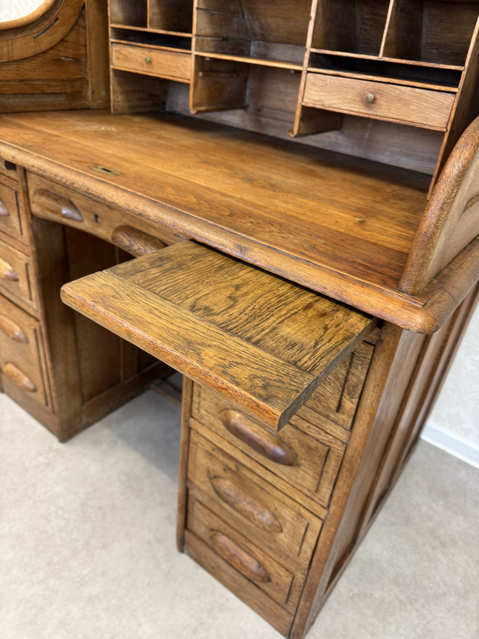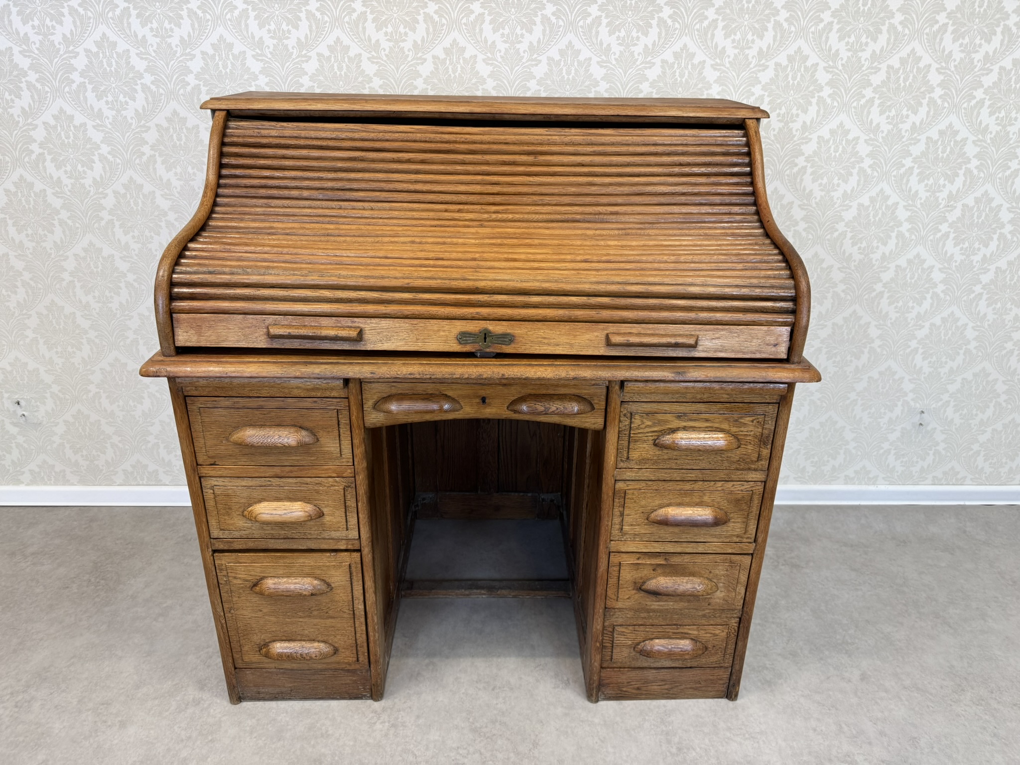 Robustní psací stůl z dubového dřeva s typickou horní roletou s množstvím přihrádek a zásuvek po obou stranách a centrální zásuvkou s děliči. Tento typ stolu, známý jako „roll-top desk“ neboli americký psací stůl, byl oblíben zejména na přelomu 19. a 20. století v kancelářích i domácnostech. Roleta je funkční, ovšem nedochoval se klíč, roletu nelze zamykat.