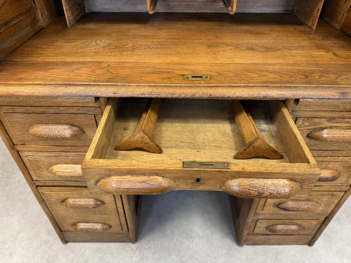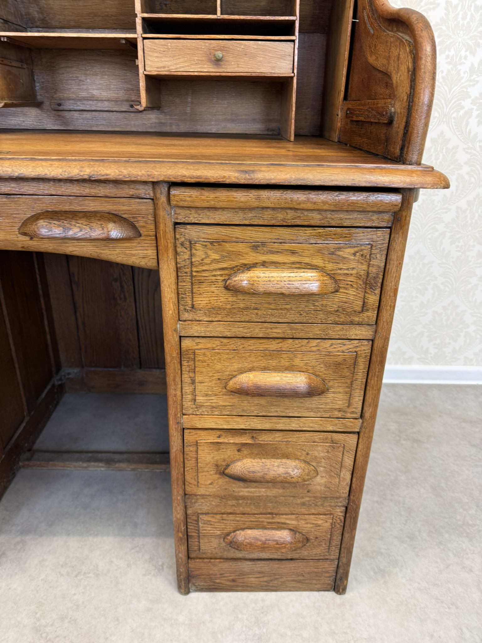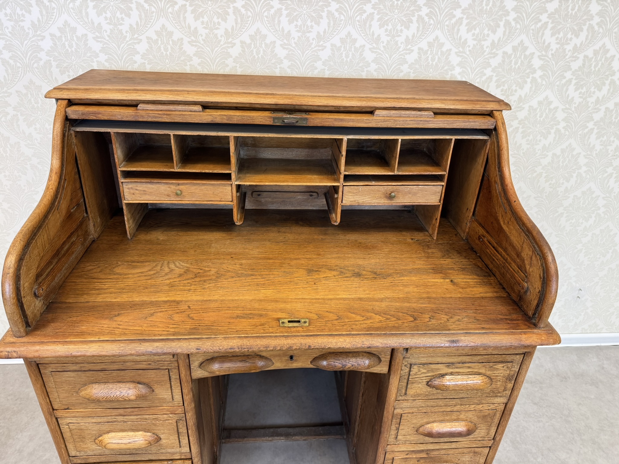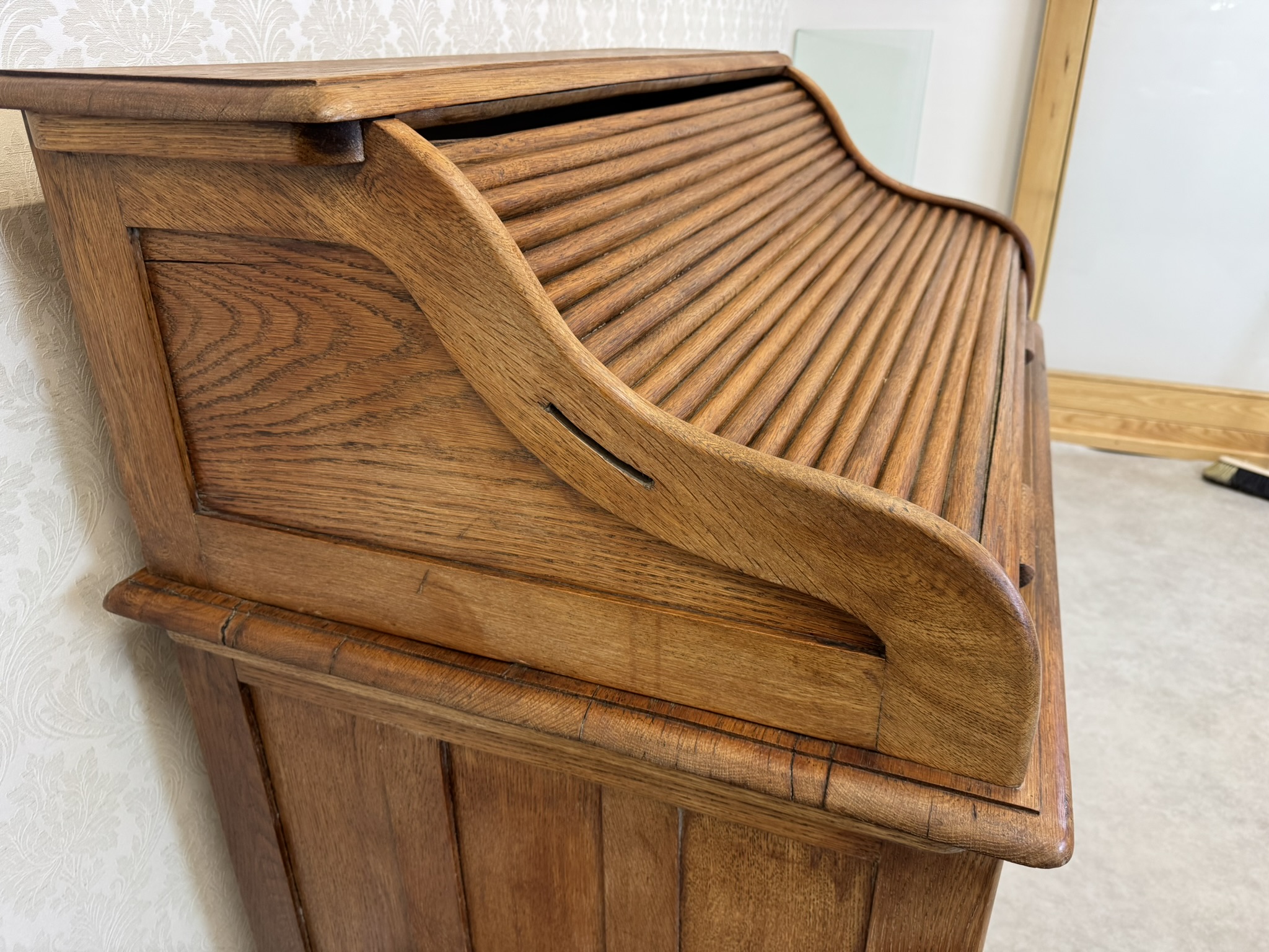 Robustní psací stůl z dubového dřeva s typickou horní roletou s množstvím přihrádek a zásuvek po obou stranách a centrální zásuvkou s děliči. Tento typ stolu, známý jako „roll-top desk“ neboli americký psací stůl, byl oblíben zejména na přelomu 19. a 20. století v kancelářích i domácnostech. Roleta je funkční, ovšem nedochoval se klíč, roletu nelze zamykat.
