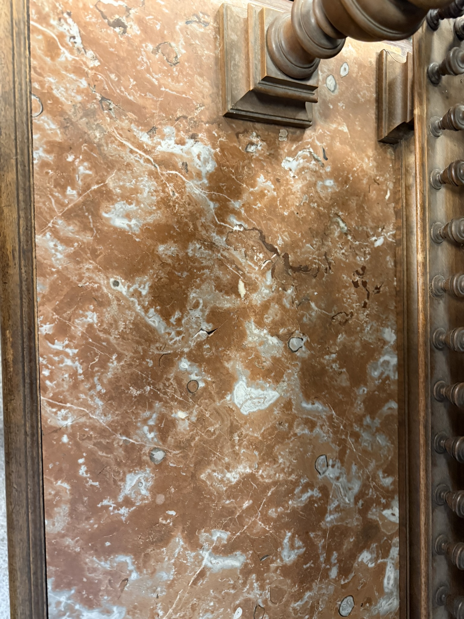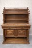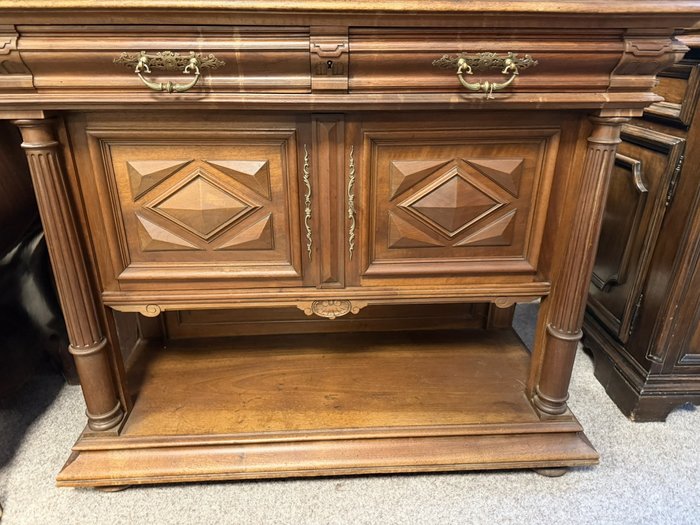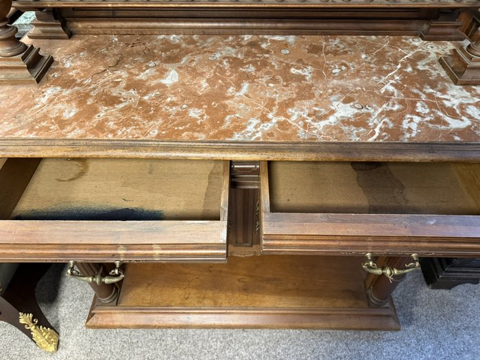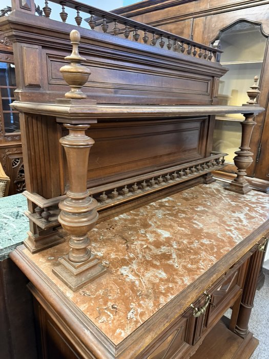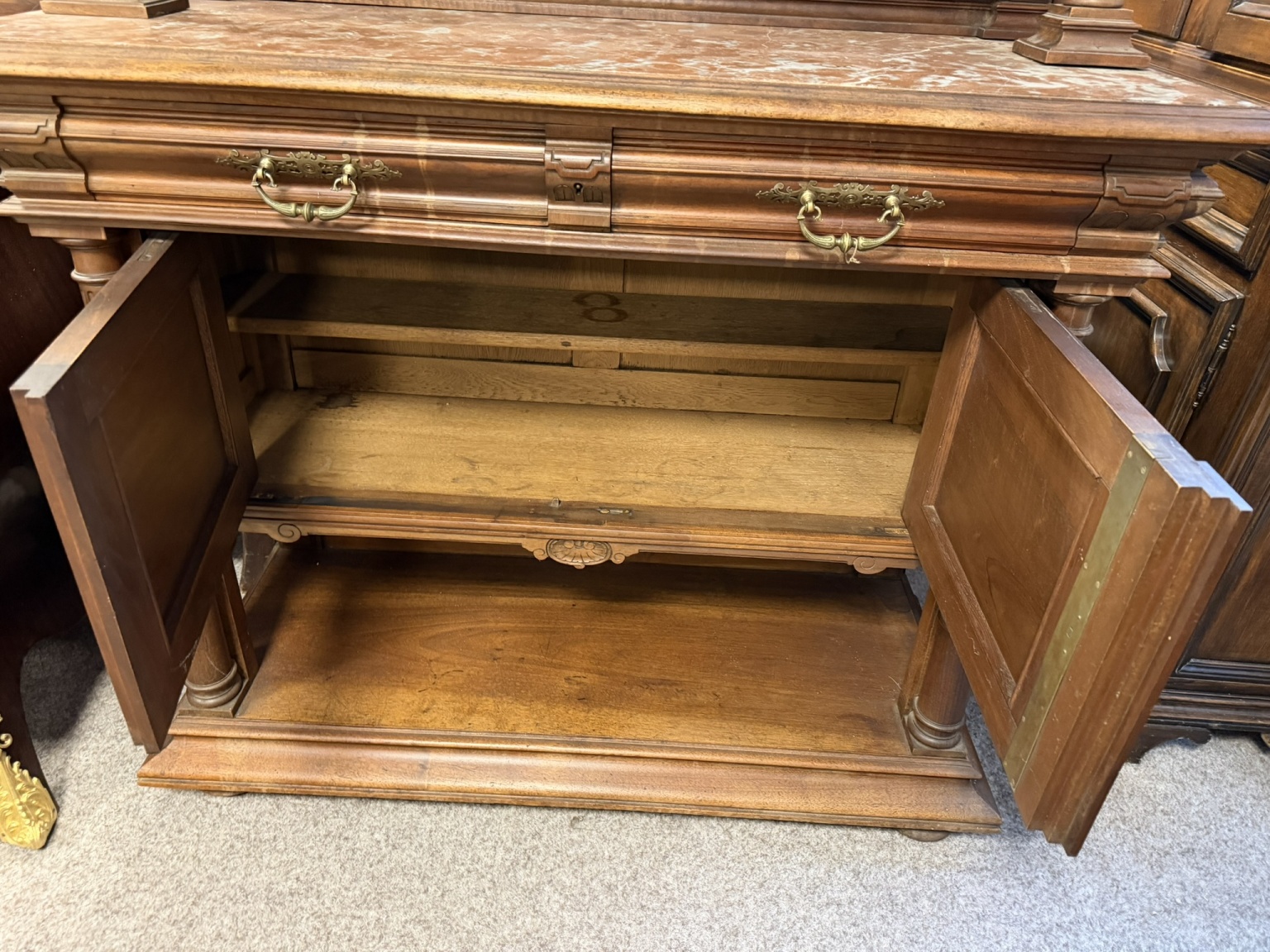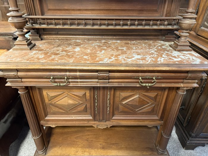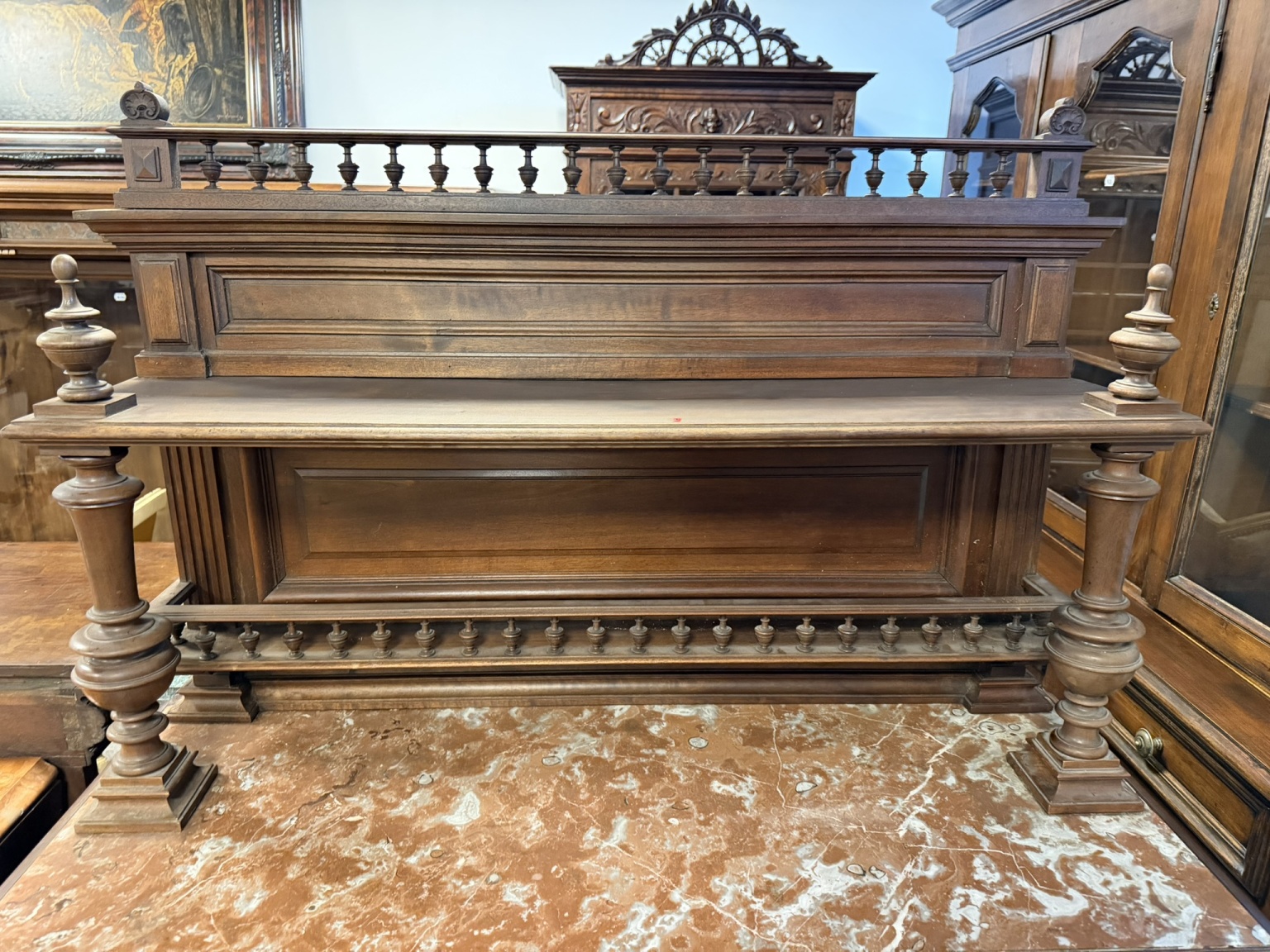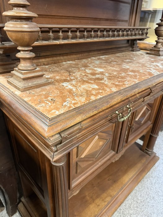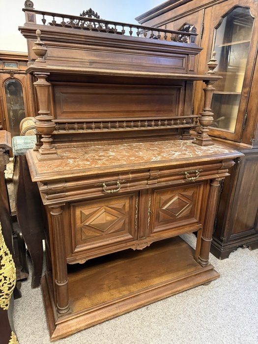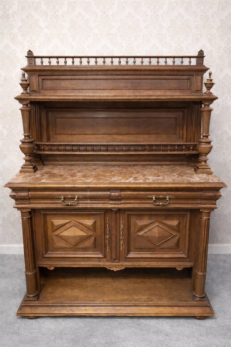 Příborník, členěný do dvou částí – spodní skříňové se zásuvkami a dveřmi, a horní nástavbové s otevřenými policemi. Deska z hnědobéžového mramoru kontrastuje s barvou dřeva a dodává výraznou eleganci. Konstrukci zdobí sloupky, profilované římsy, kazetová dvířka a dekorativní kuželkové galerie.15 450 Kč