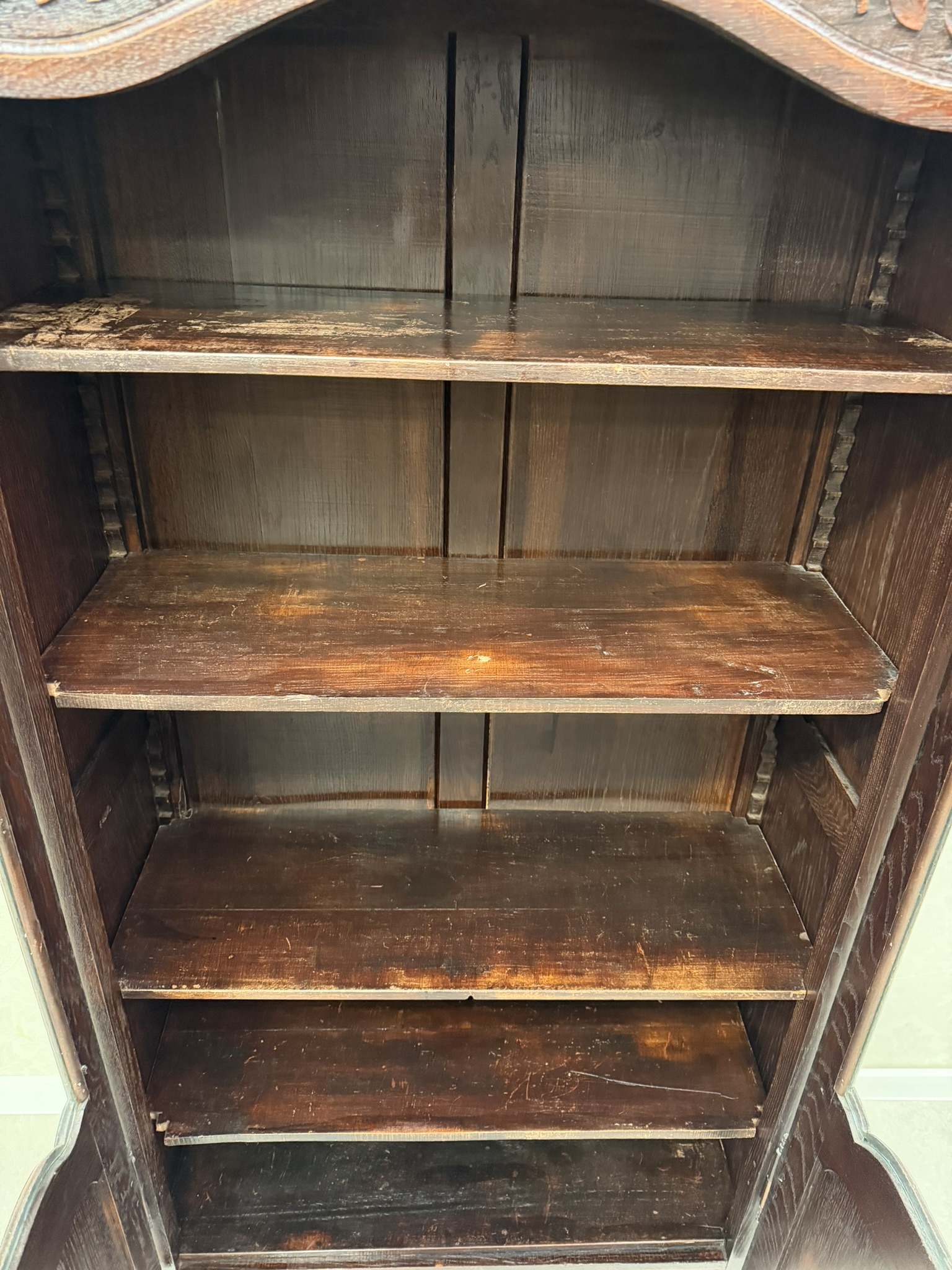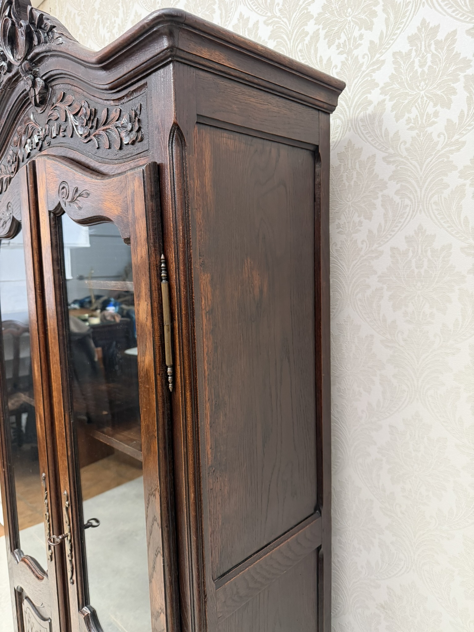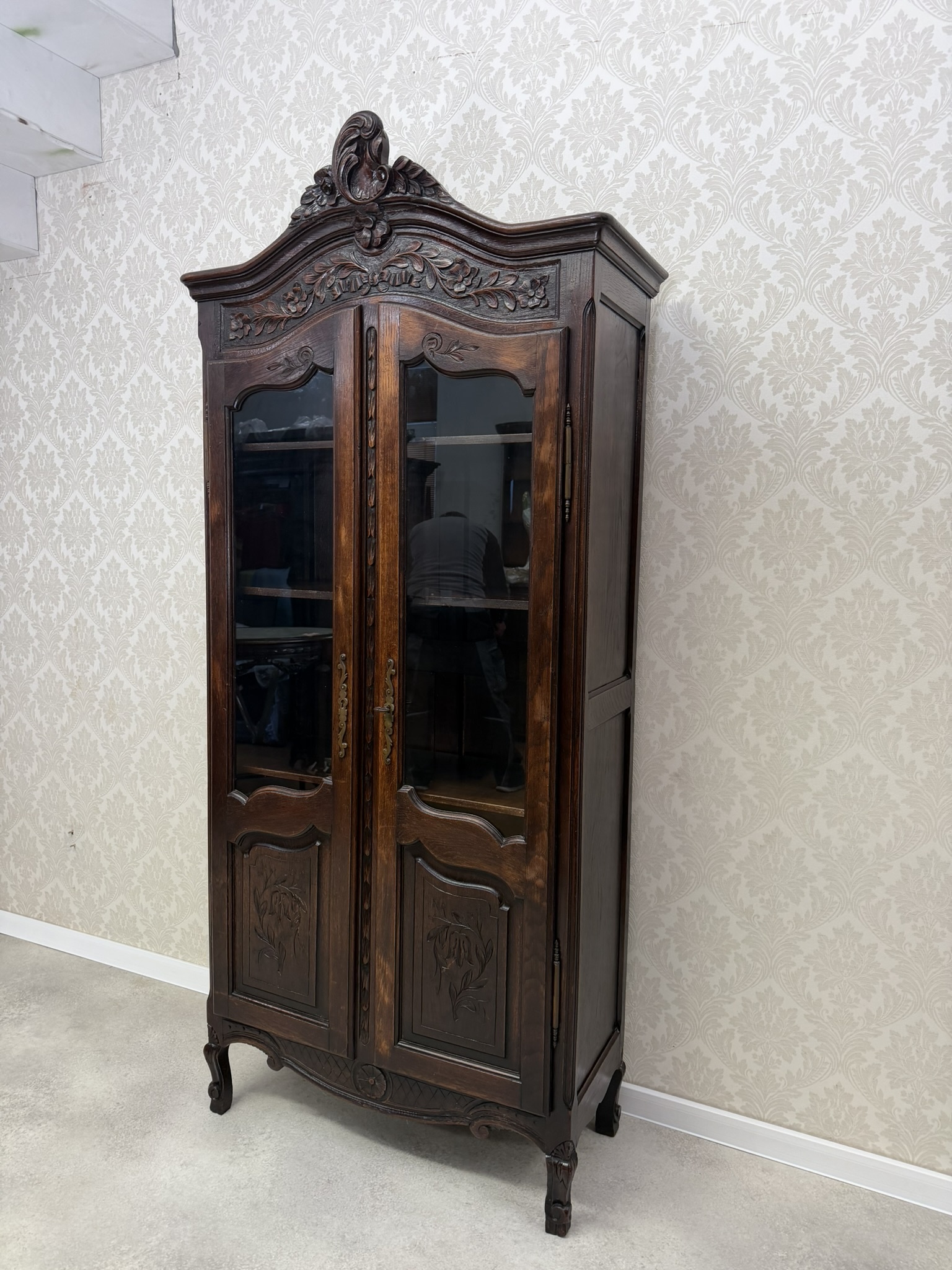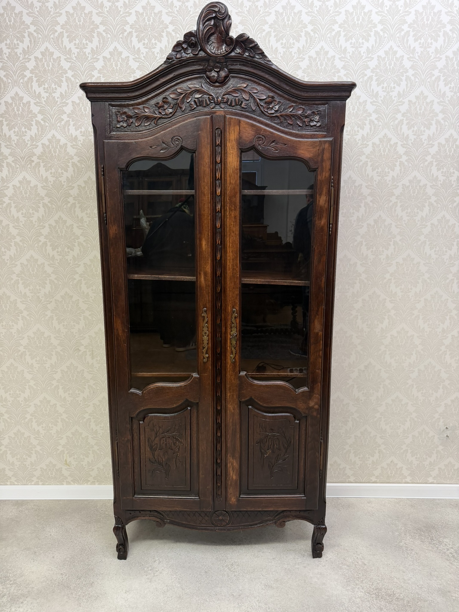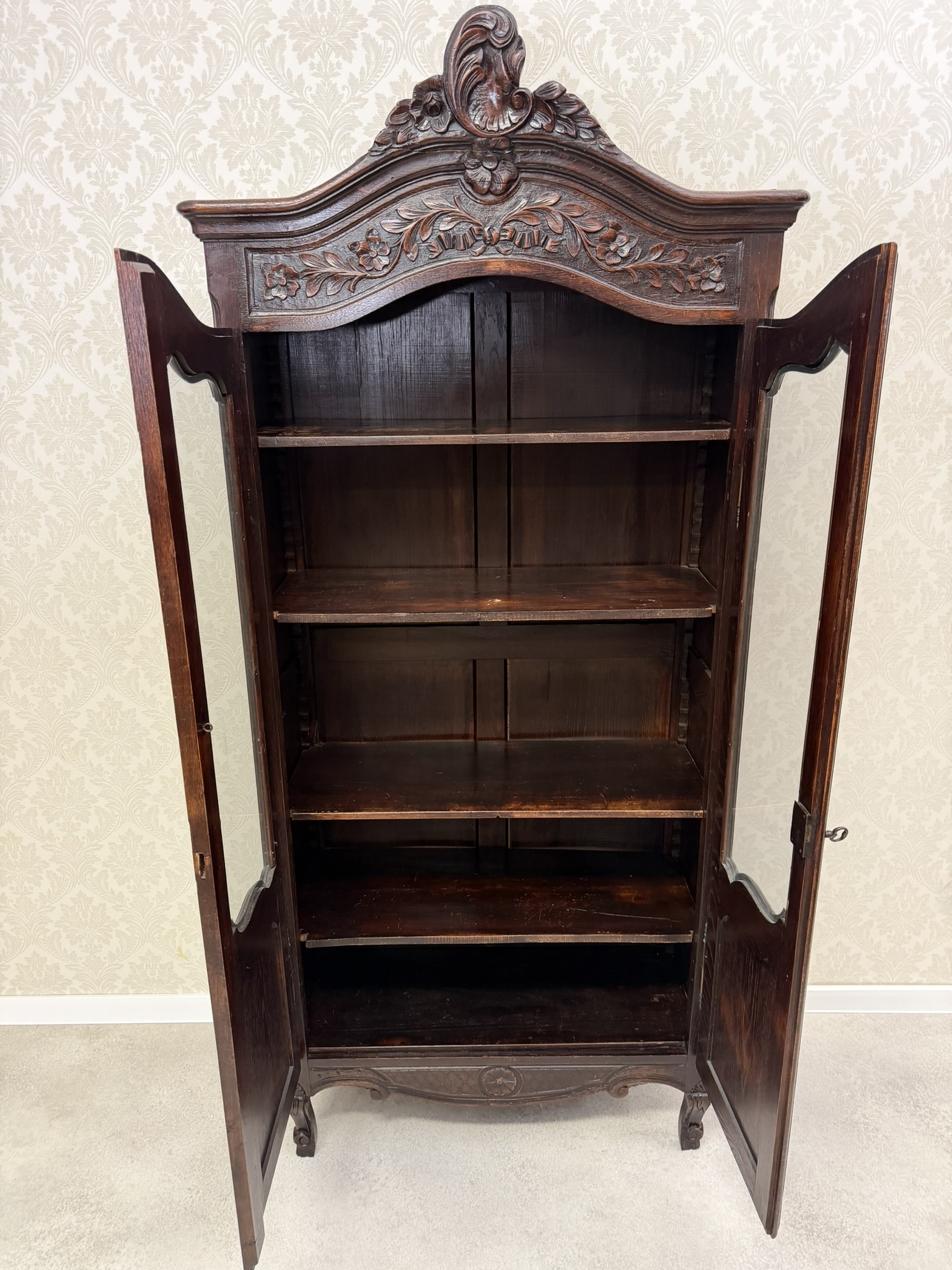 Vitrína je zdobená ručními řezbami v horní i spodní části. Prosklené dvoukřídlé dveře umožňují vystavení různých předmětů. Spodní dvířka jsou řešena kazetovými panely. Vnitřní prostor je členěn několika policemi s patinou, odpovídající stáří, která podtrhuje autentický vzhled vitríny.14 870 Kč