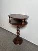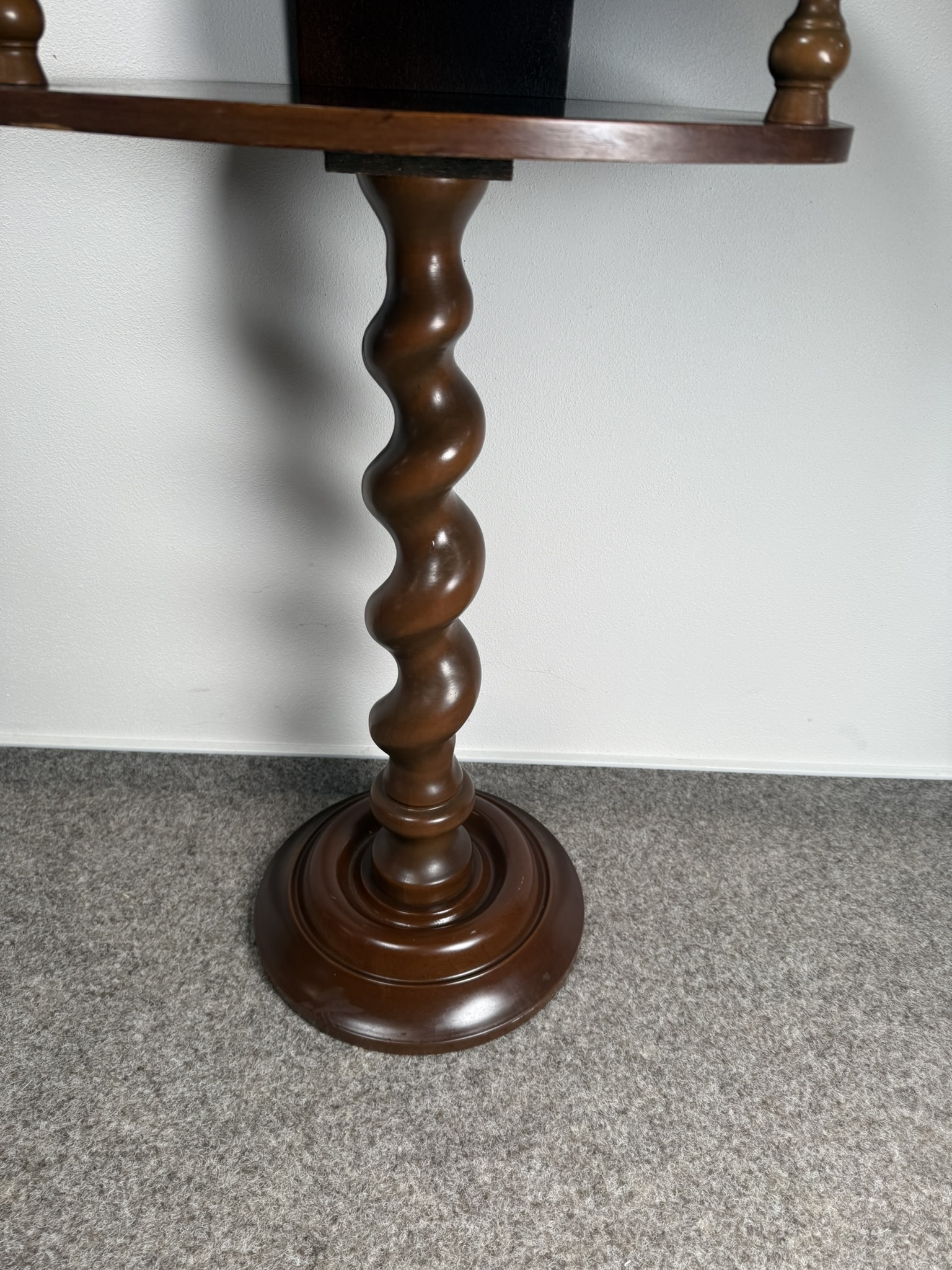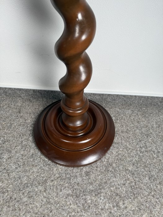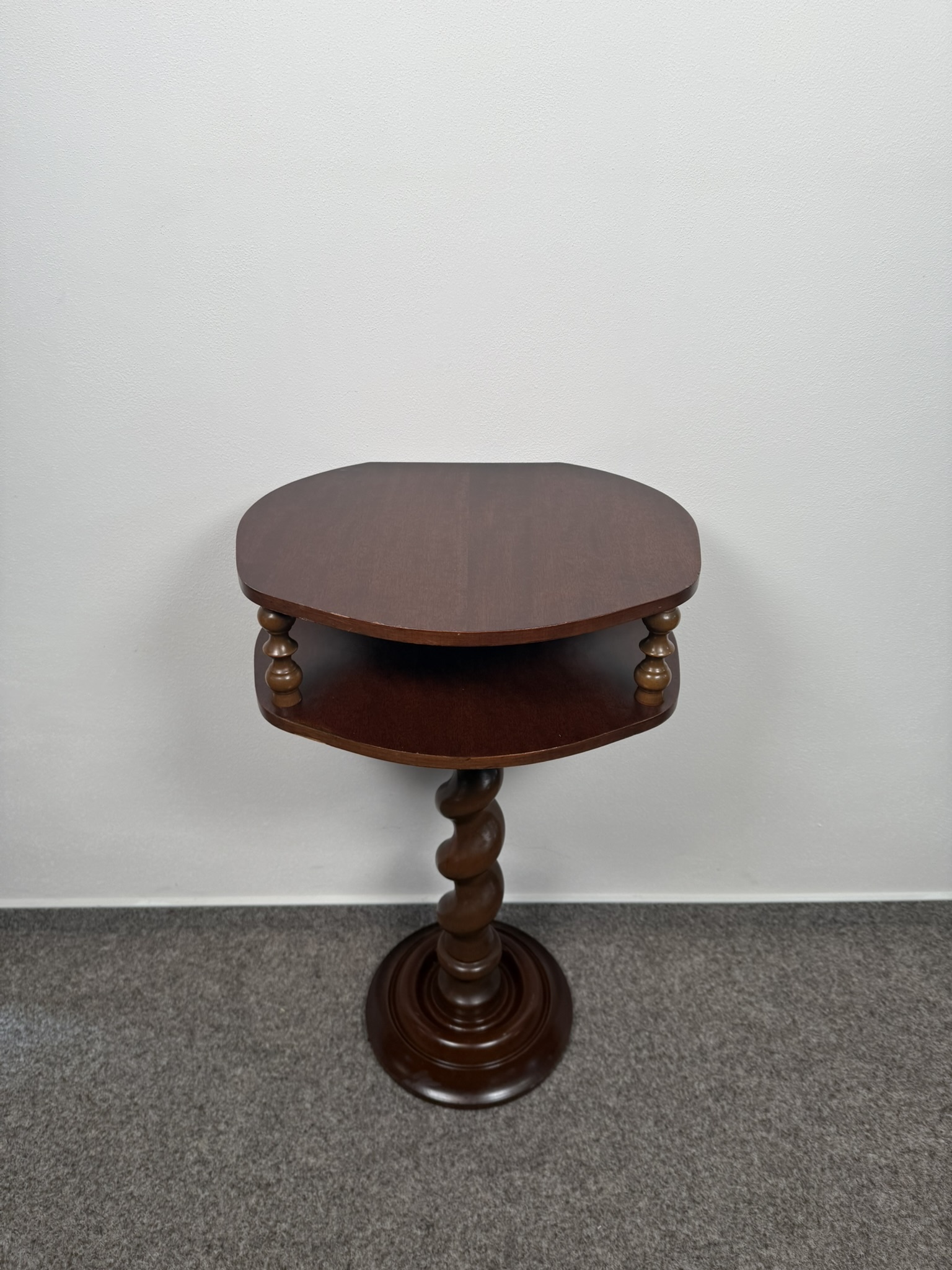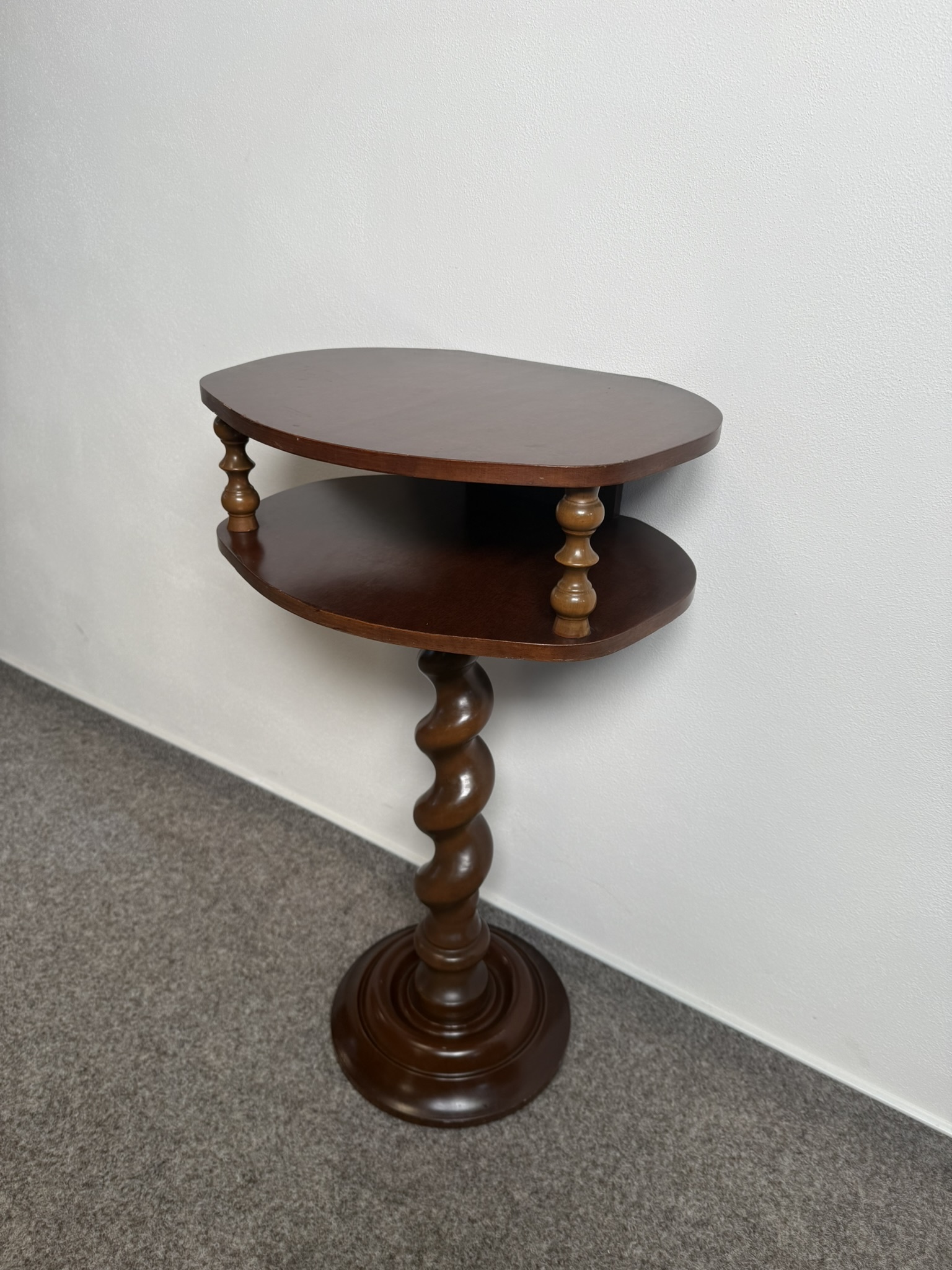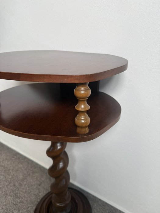 Odkládací stolek s horní deskou a nižší policí, spojený točenou centrální nohou. Mezi deskami se nachází dvě drobné podpěry, které podtrhují vizuální lehkost. Stolek stojí na kruhové základně.3 980 Kč