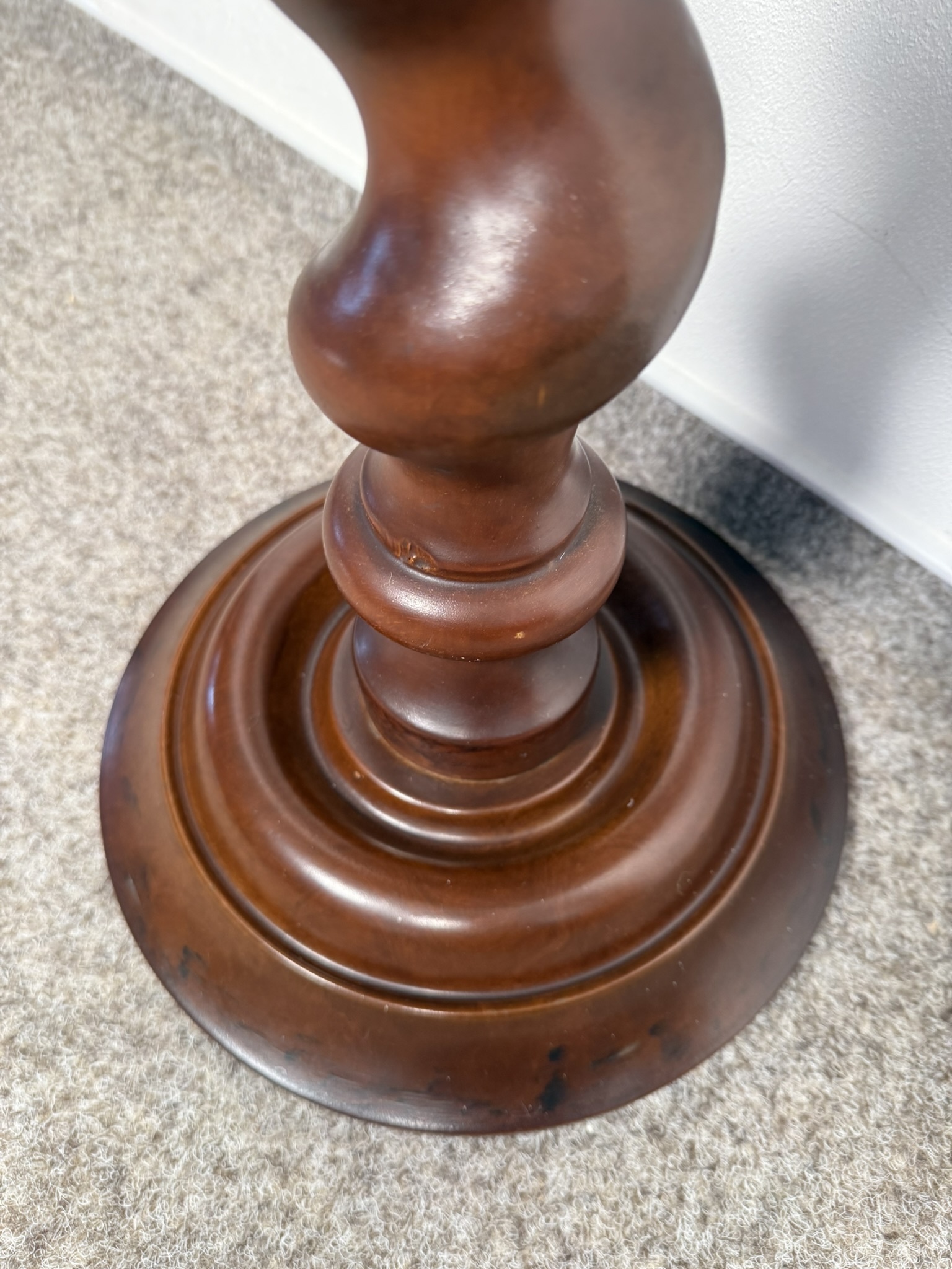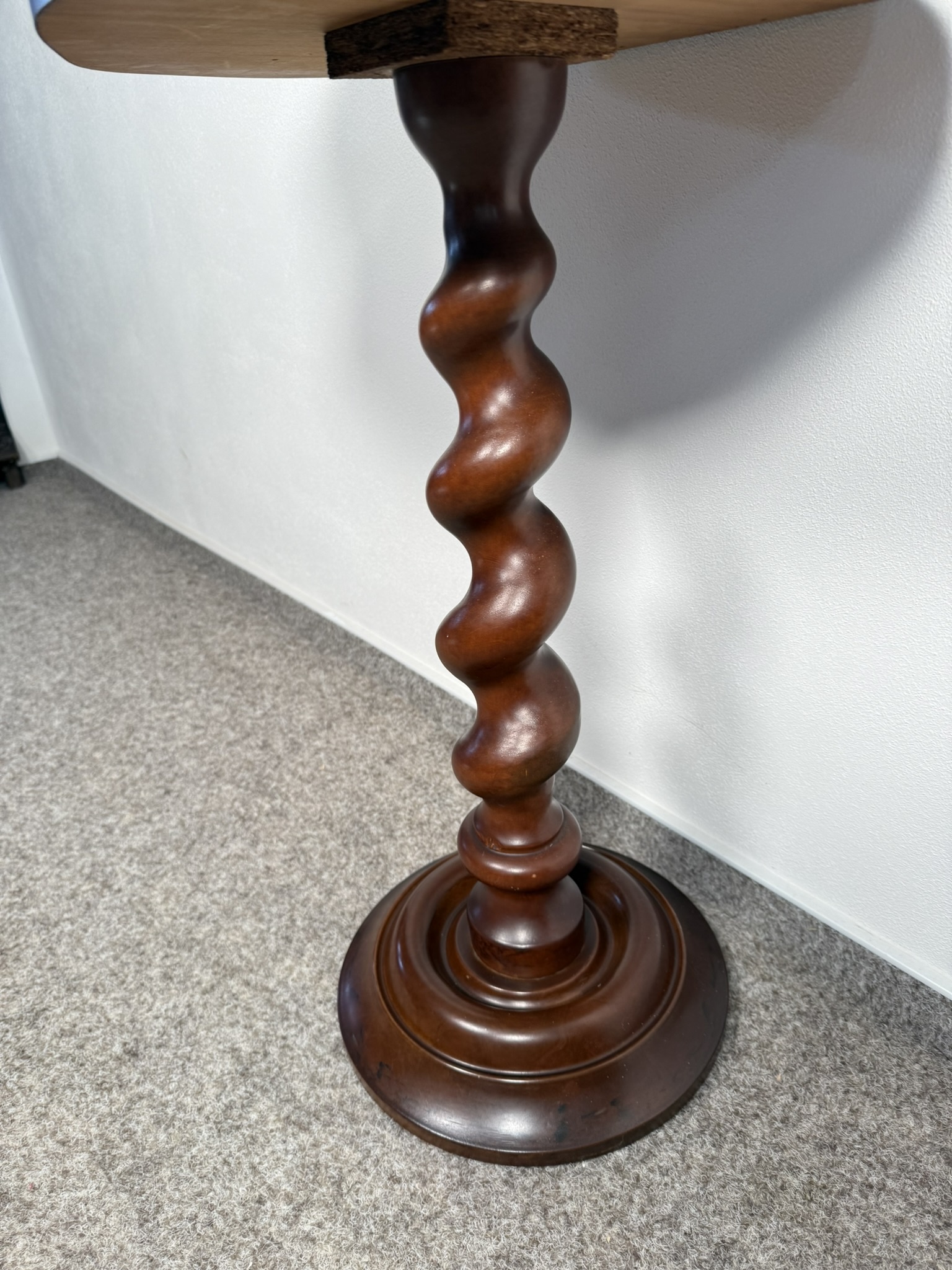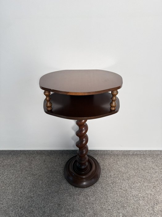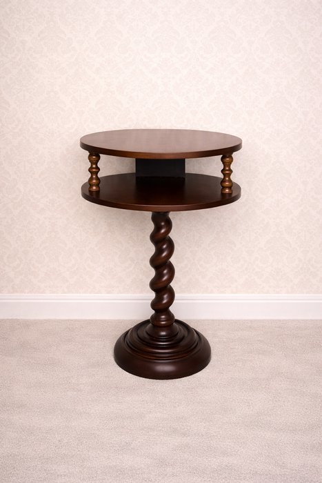 Odkládací stolek s dvěma deskami. Dominantou je výrazná středová noha ve tvaru točeného sloupku, zakončená širokou kruhovou patkou.3 980 Kč