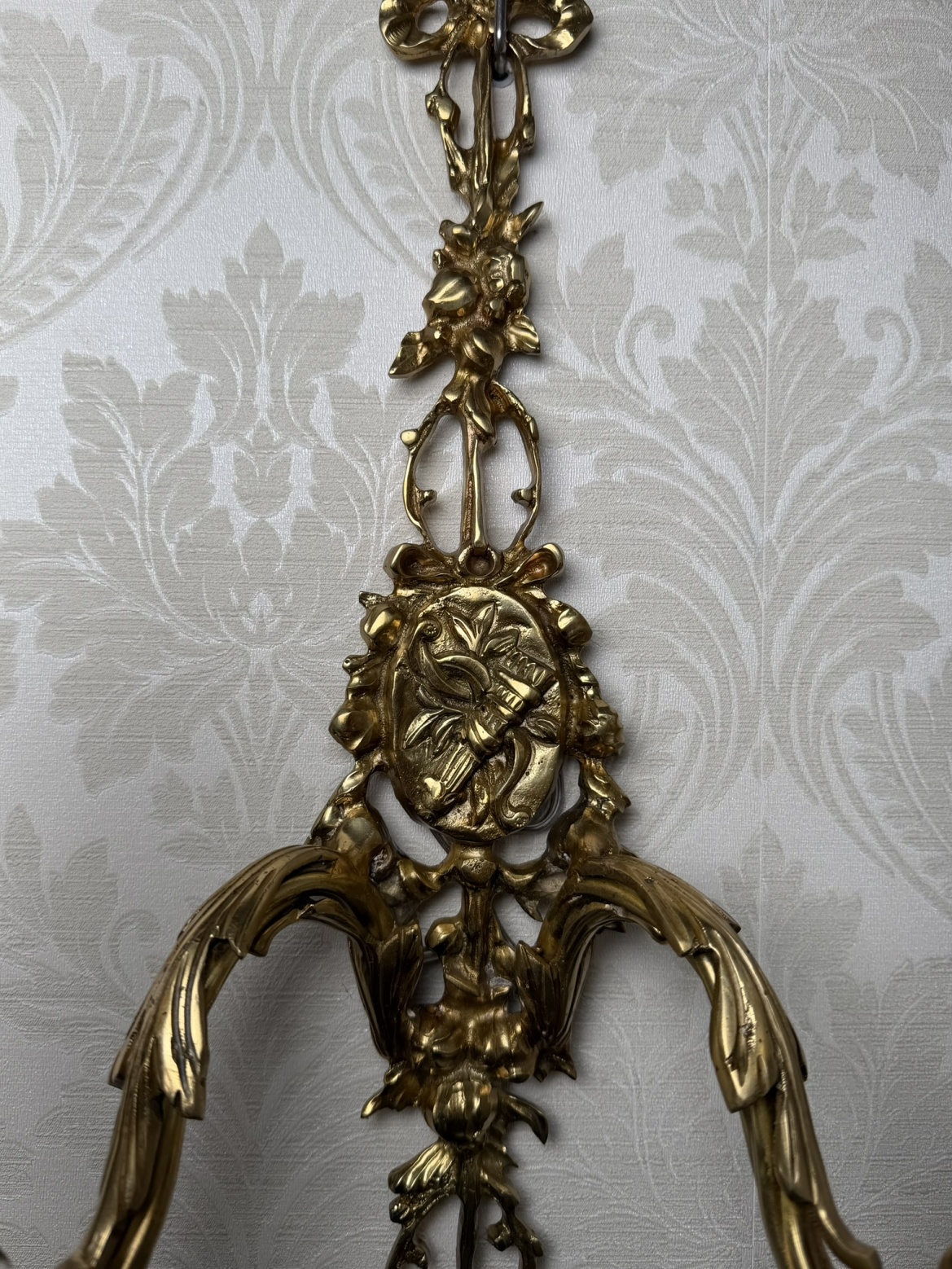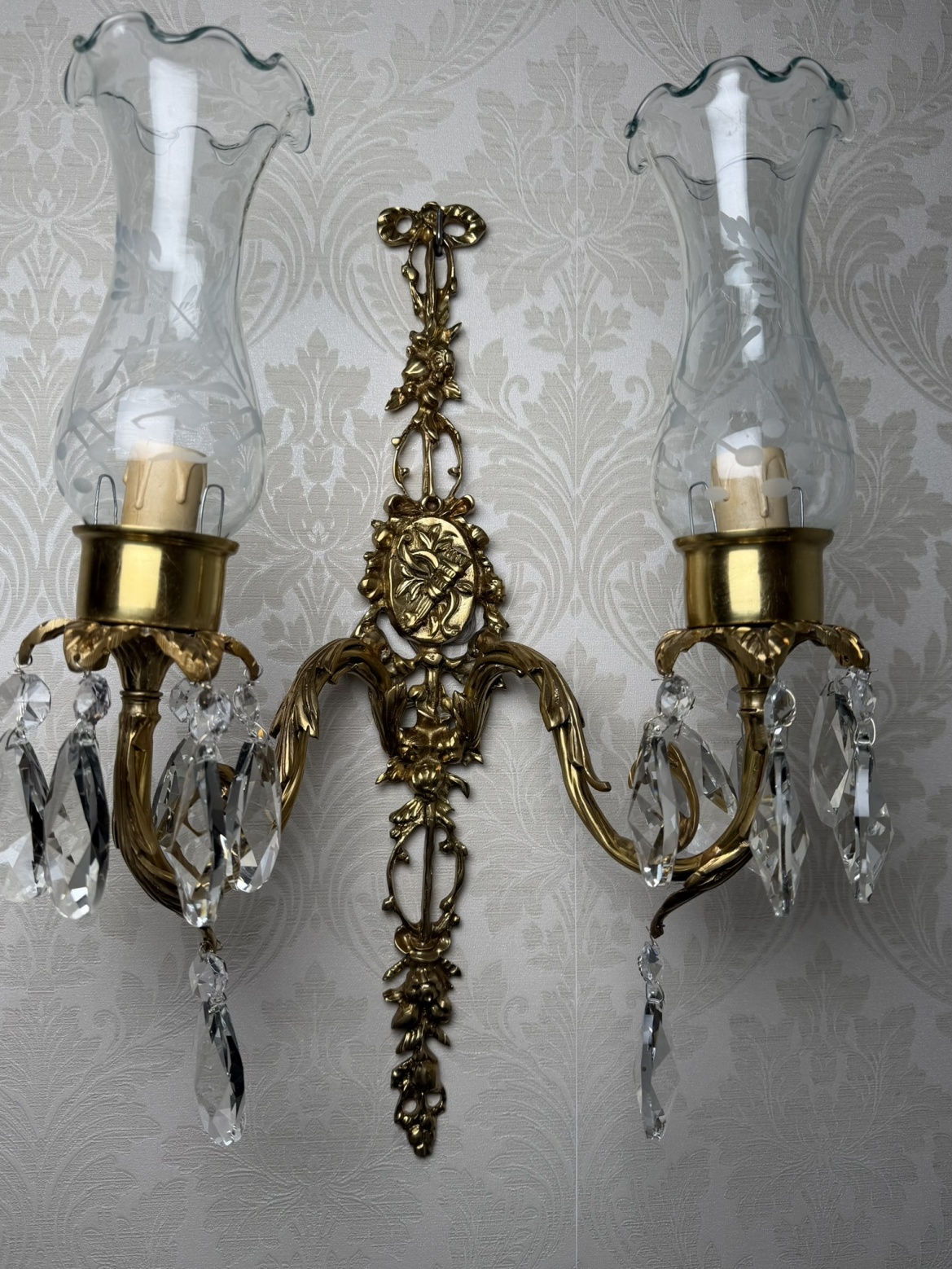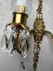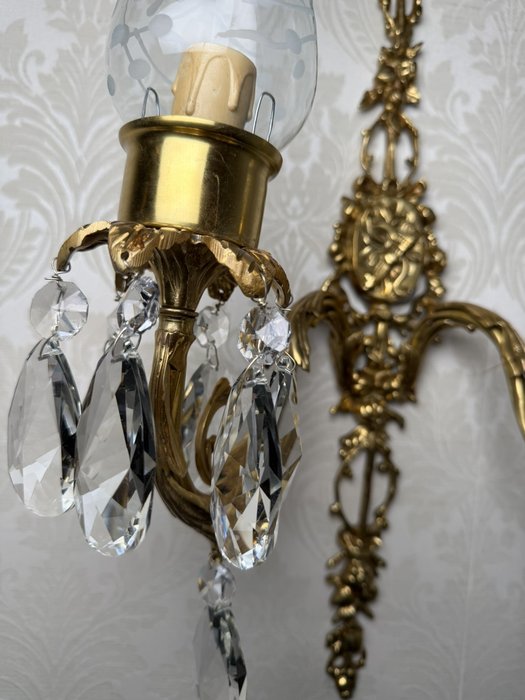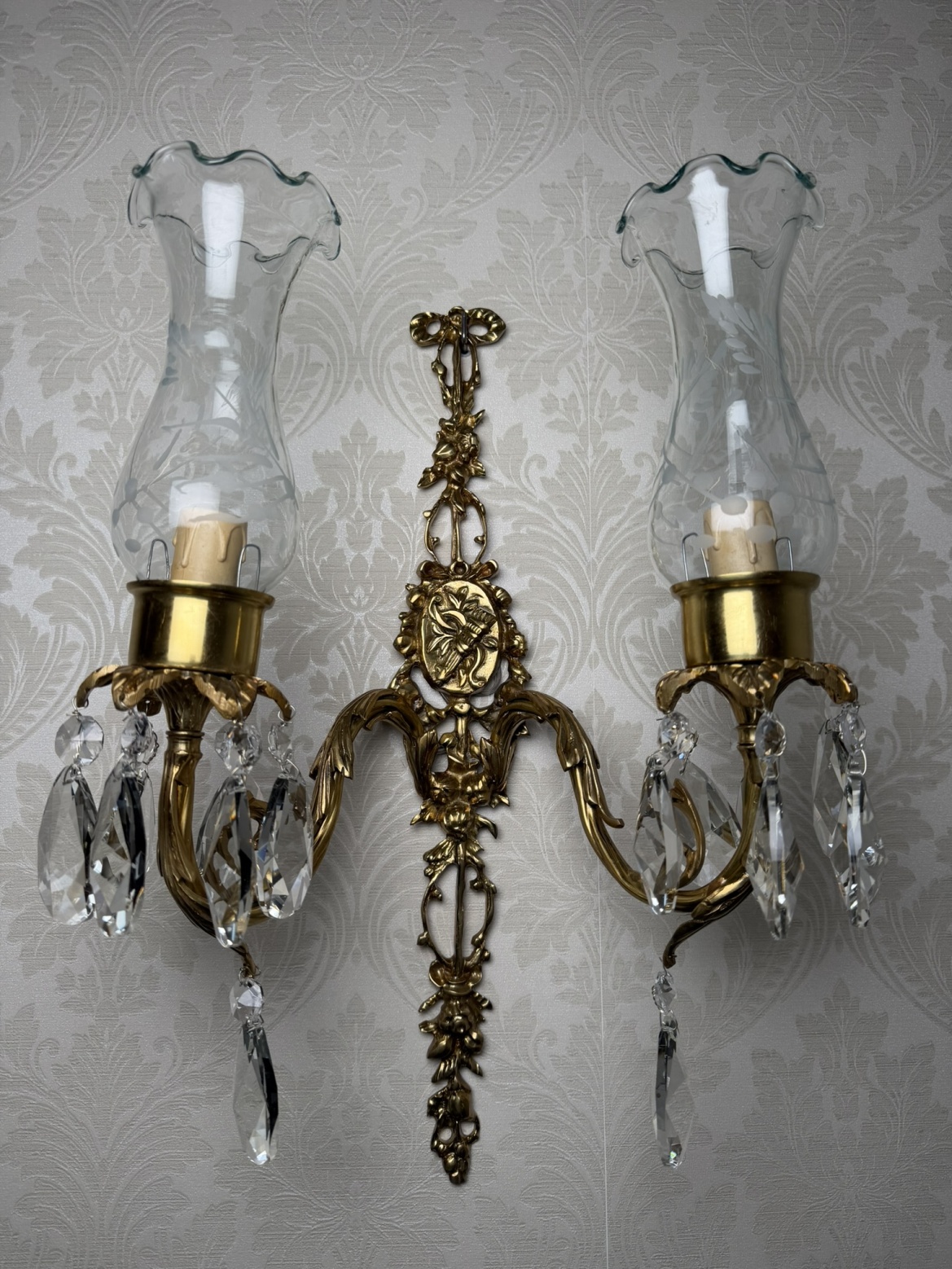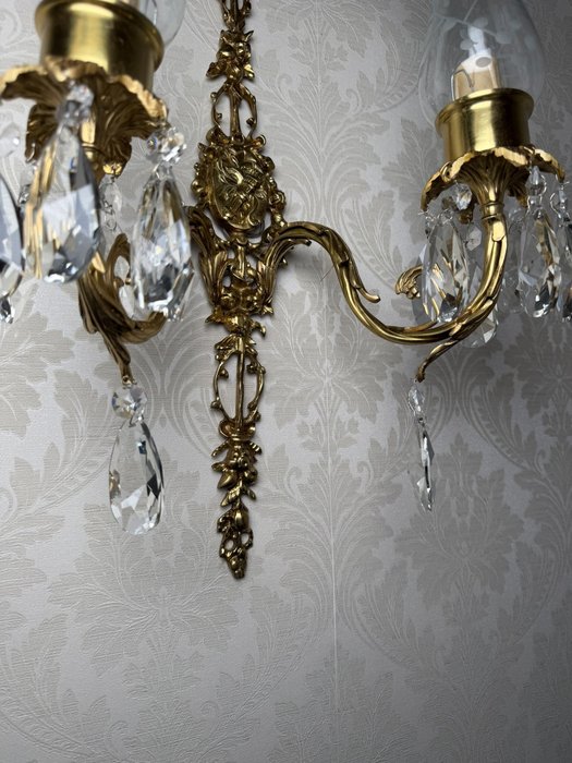 Dvouramenné nástěnné světlo z patinované mosazi s bohatým florálním dekorem. Dvě ramena zdobená křišťálovými ověsy krásně rozptylují světlo.