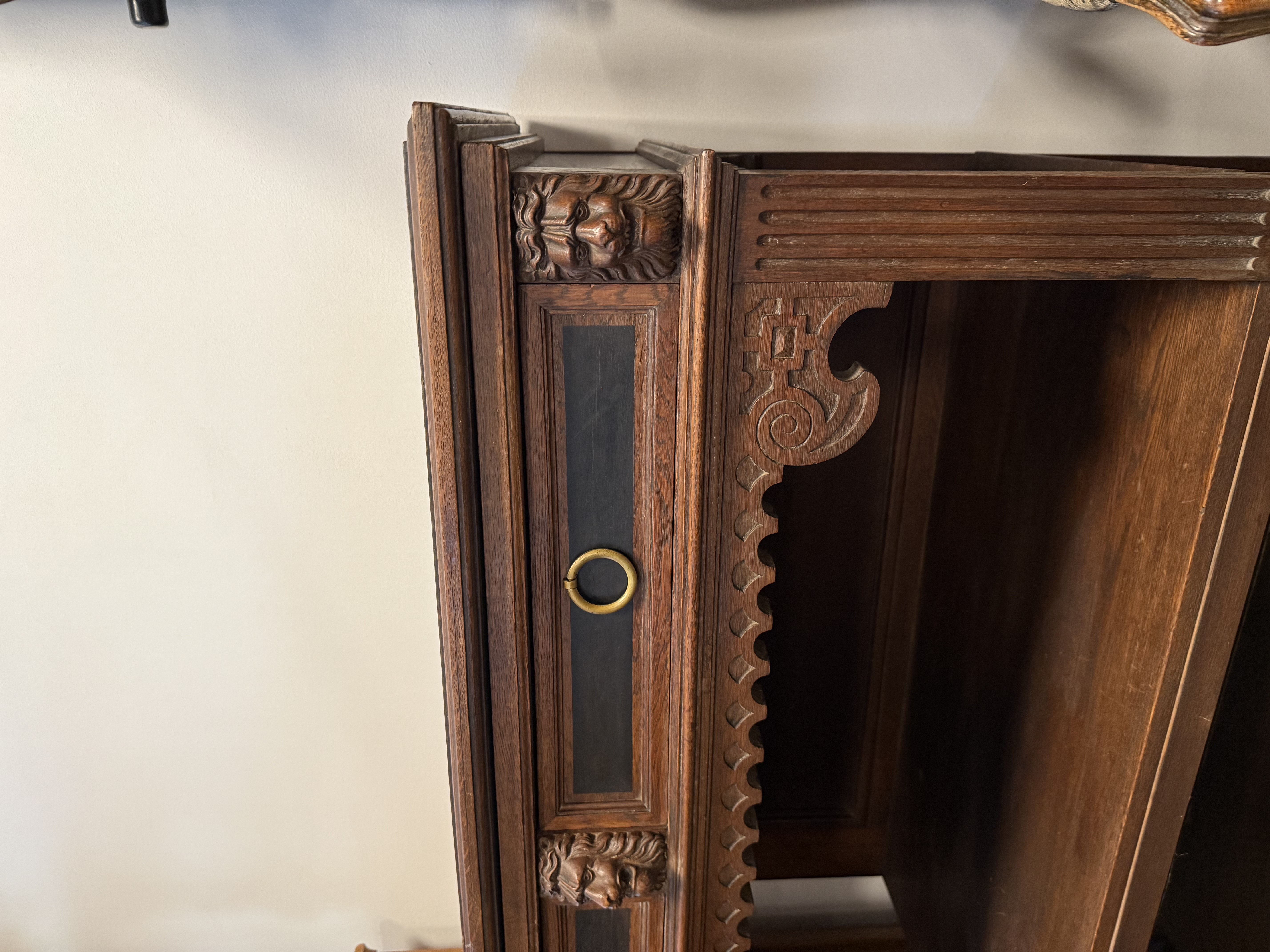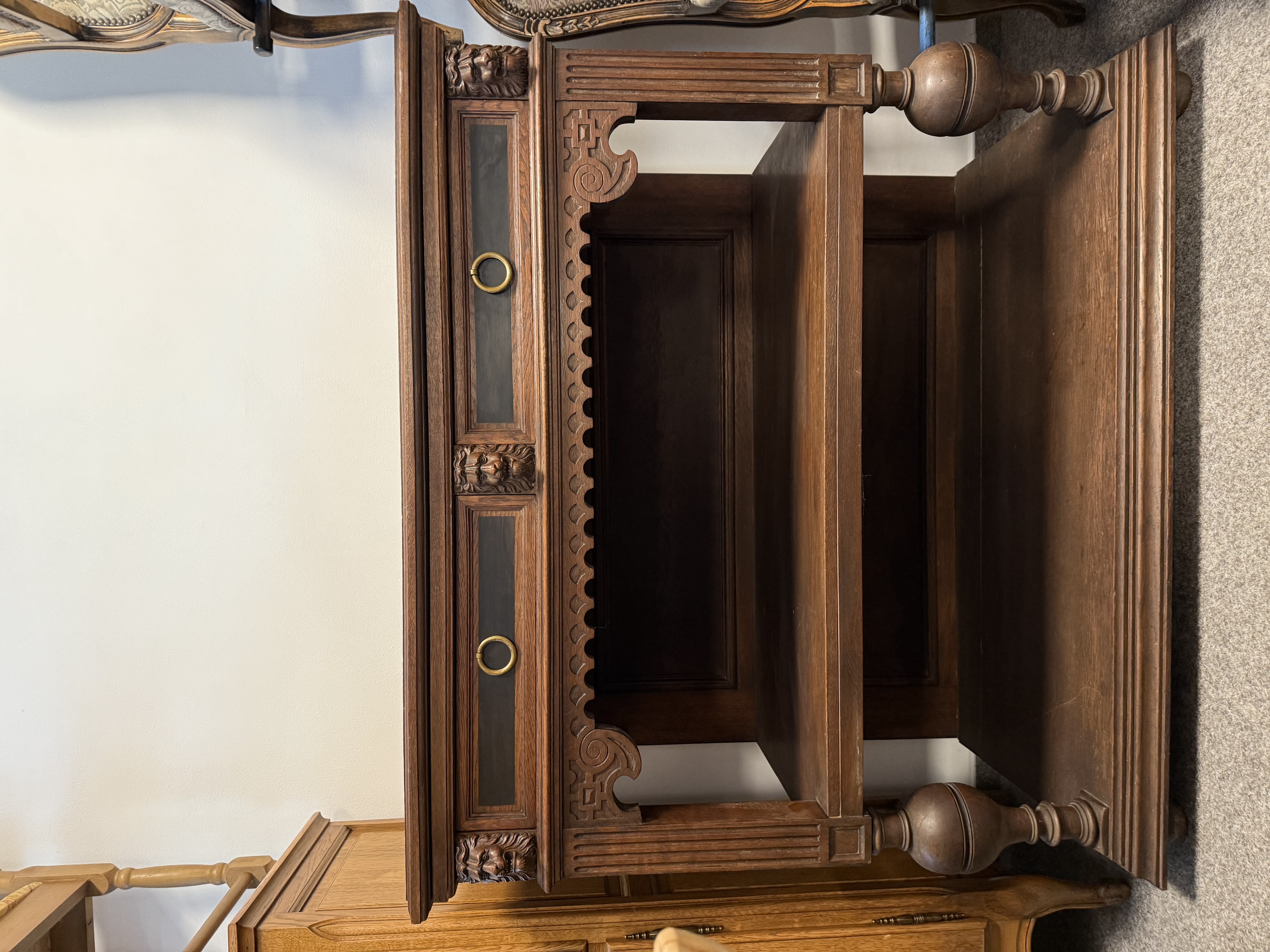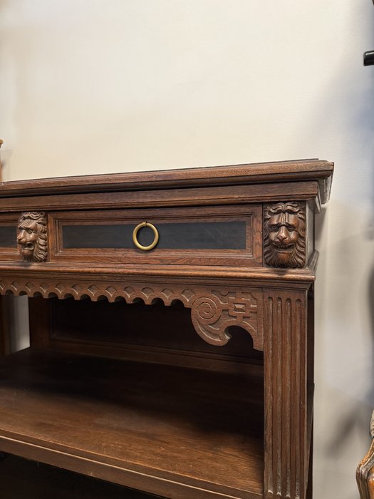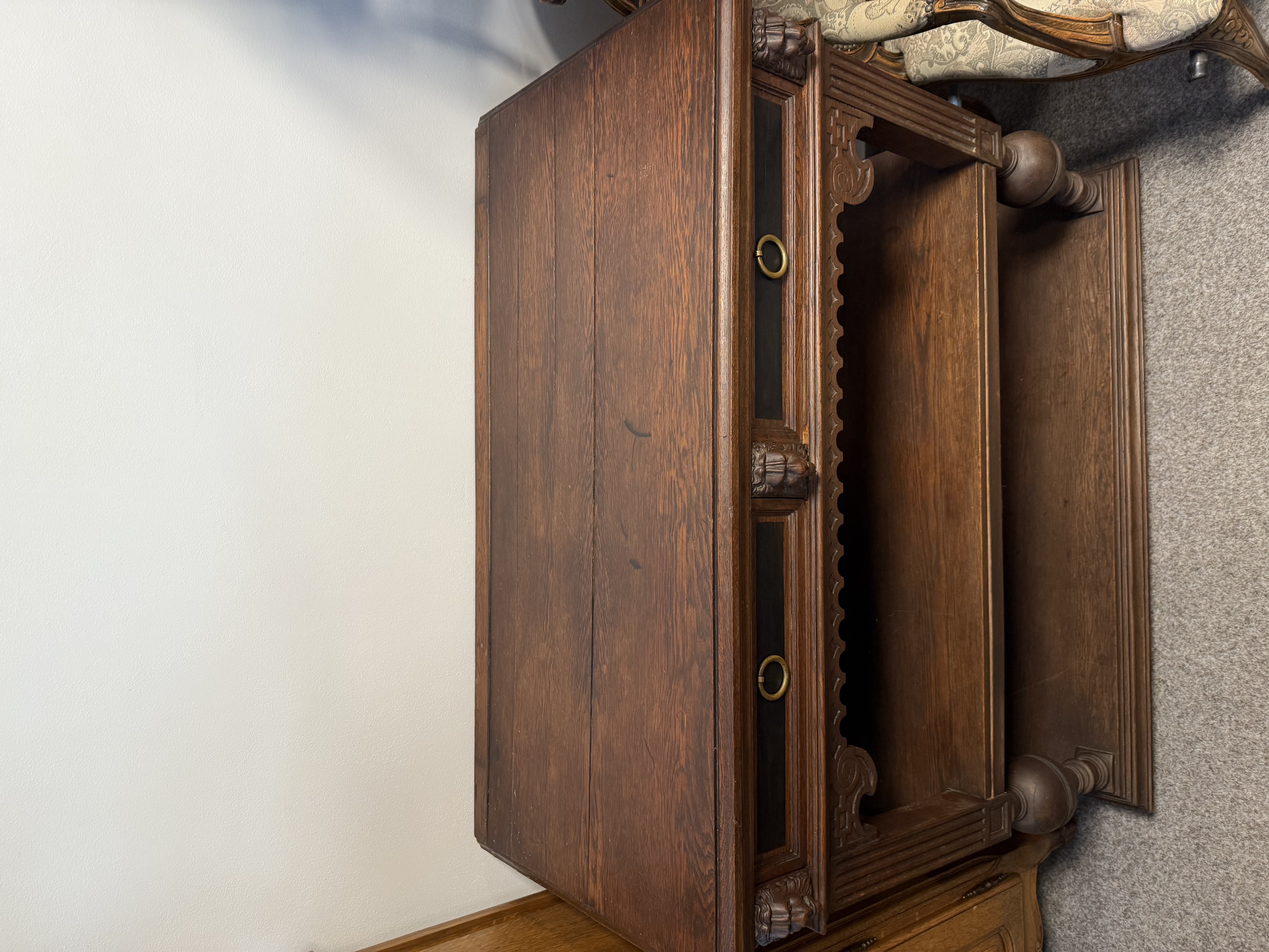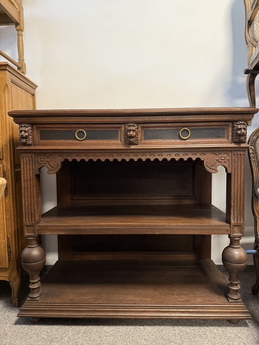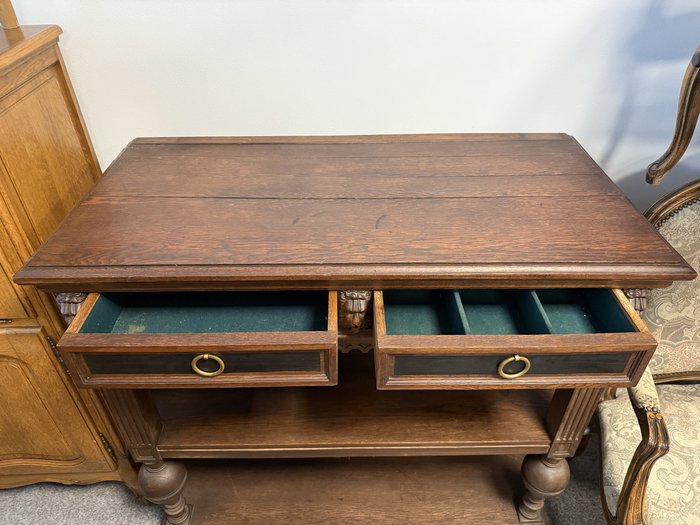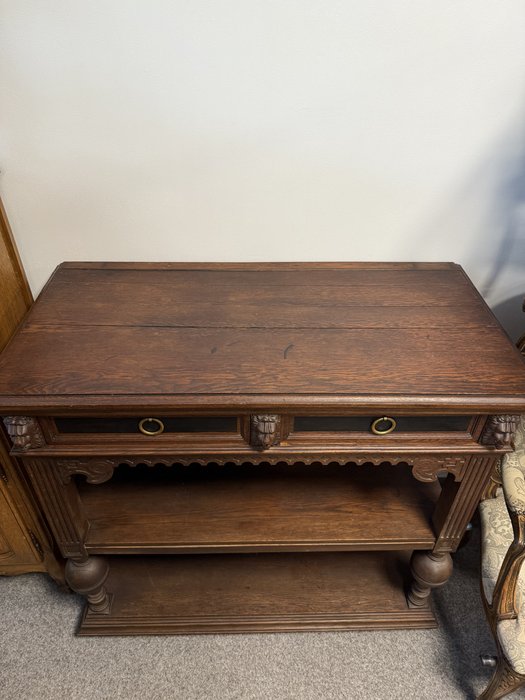 Praktická a dekorativní konzole z masivního dubu s precizně řemeslně zpracovanými detaily. Horní část obsahuje zásuvku s ornamentálními úchytkami, ideální pro uschování drobností. Pod zásuvkou jsou dvě otevřené police, které poskytují další úložný prostor. Zdobné pilastry s jemnými řezbami a kulaté nohy zdůrazňují elegantní styl tohoto kusu nábytku. Konzole je vhodná jak do reprezentativních interiérů, tak i pro praktické využití.8 975 Kč