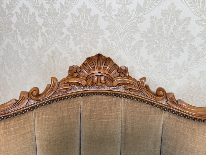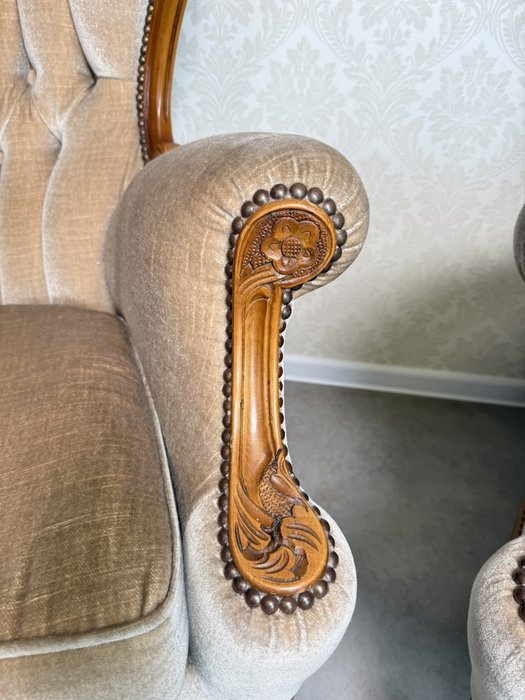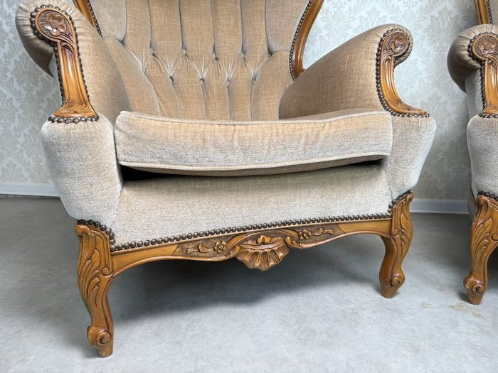 Křeslo s vysokým opěradlem a bohatě řezanými detaily ze světlého dřeva. Čalounění je v jemném odstínu béžové, zakončené ozdobnými hřebíky. Křeslo je pohodlné, s vyjímatelným sedákem, a vyniká zdobnými prvky včetně lasturového motivu a květinových řezeb. Opěradlo má typický vějířovitý vrchol.