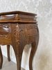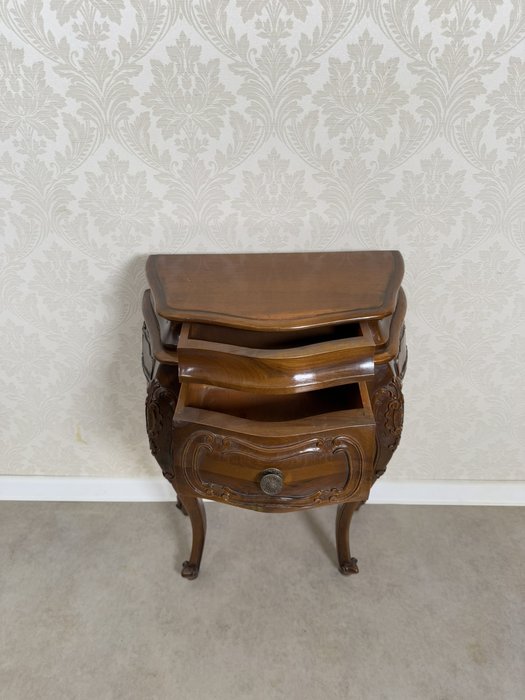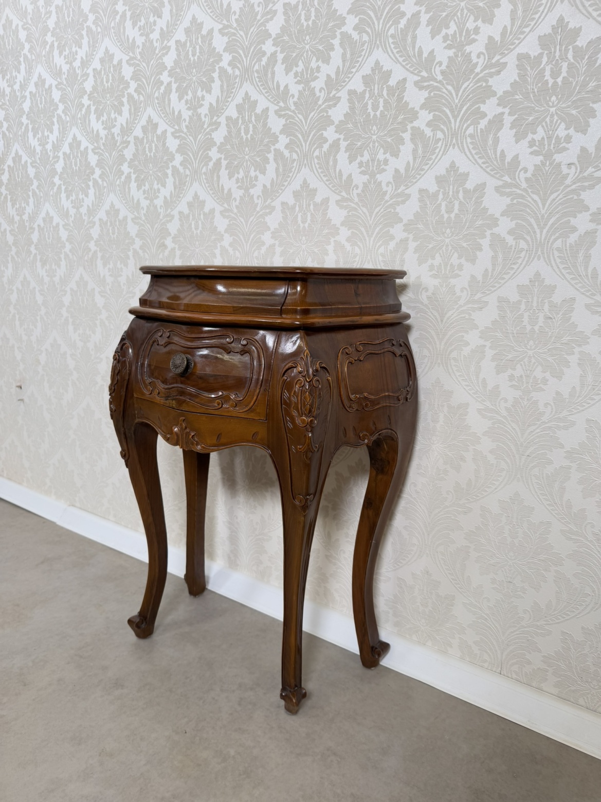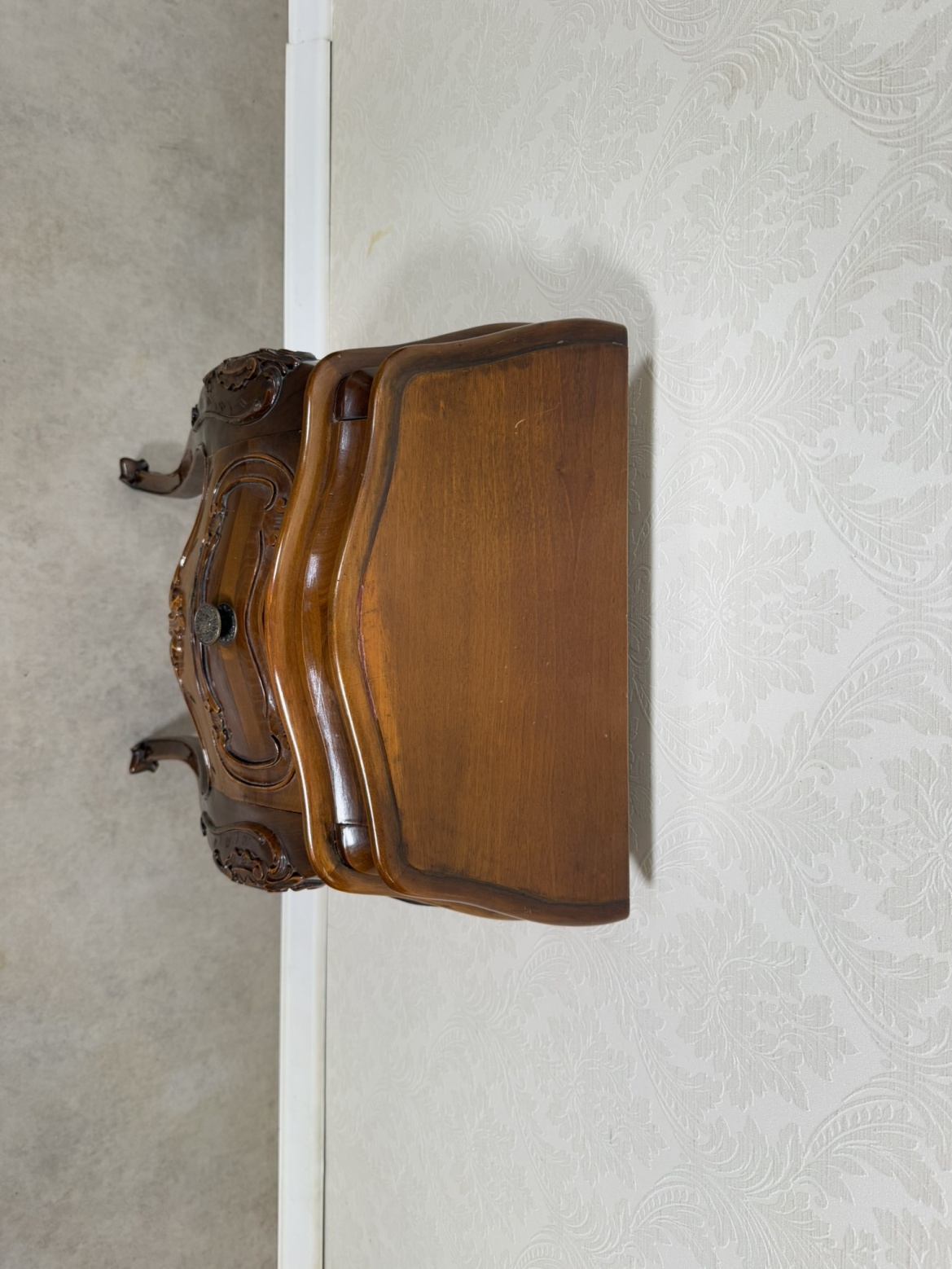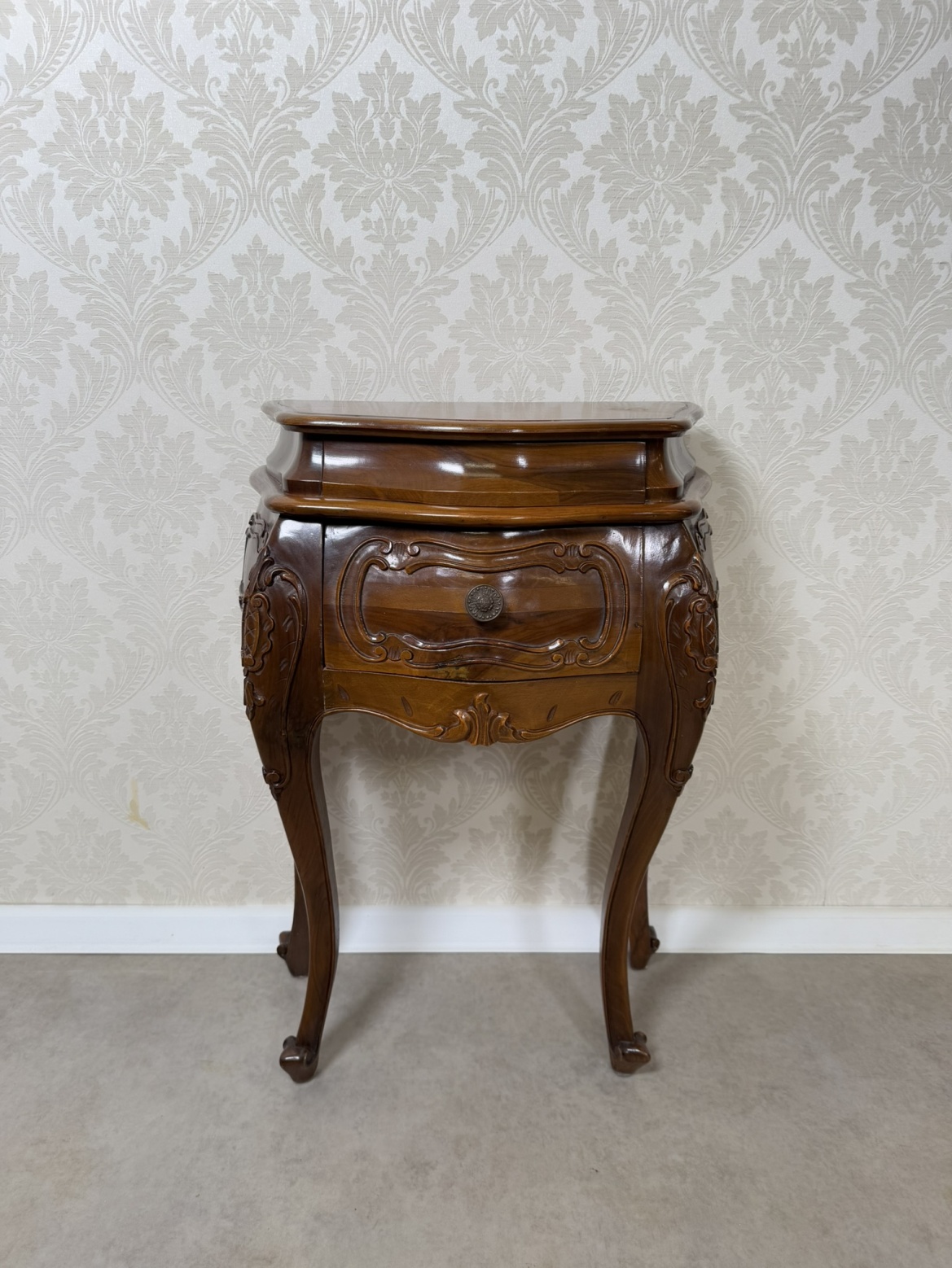 Noční stolek s bohatě tvarovaným korpusem a profilovanou deskou. Přední část zdobí plastická řezba s typickými rokokovými motivy – rozviliny, mušle a květinové ornamenty. Nohy mají měkký, esovitý ohyb.6 380 Kč