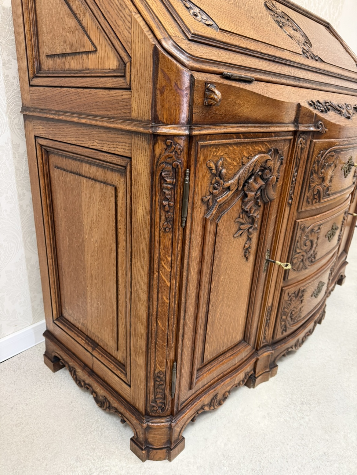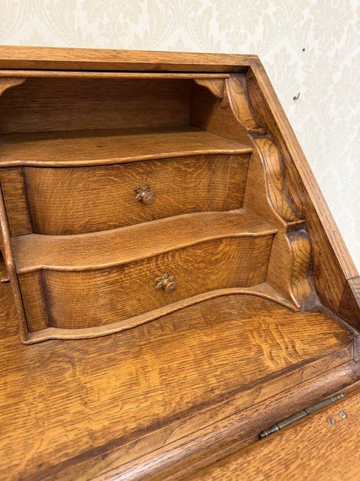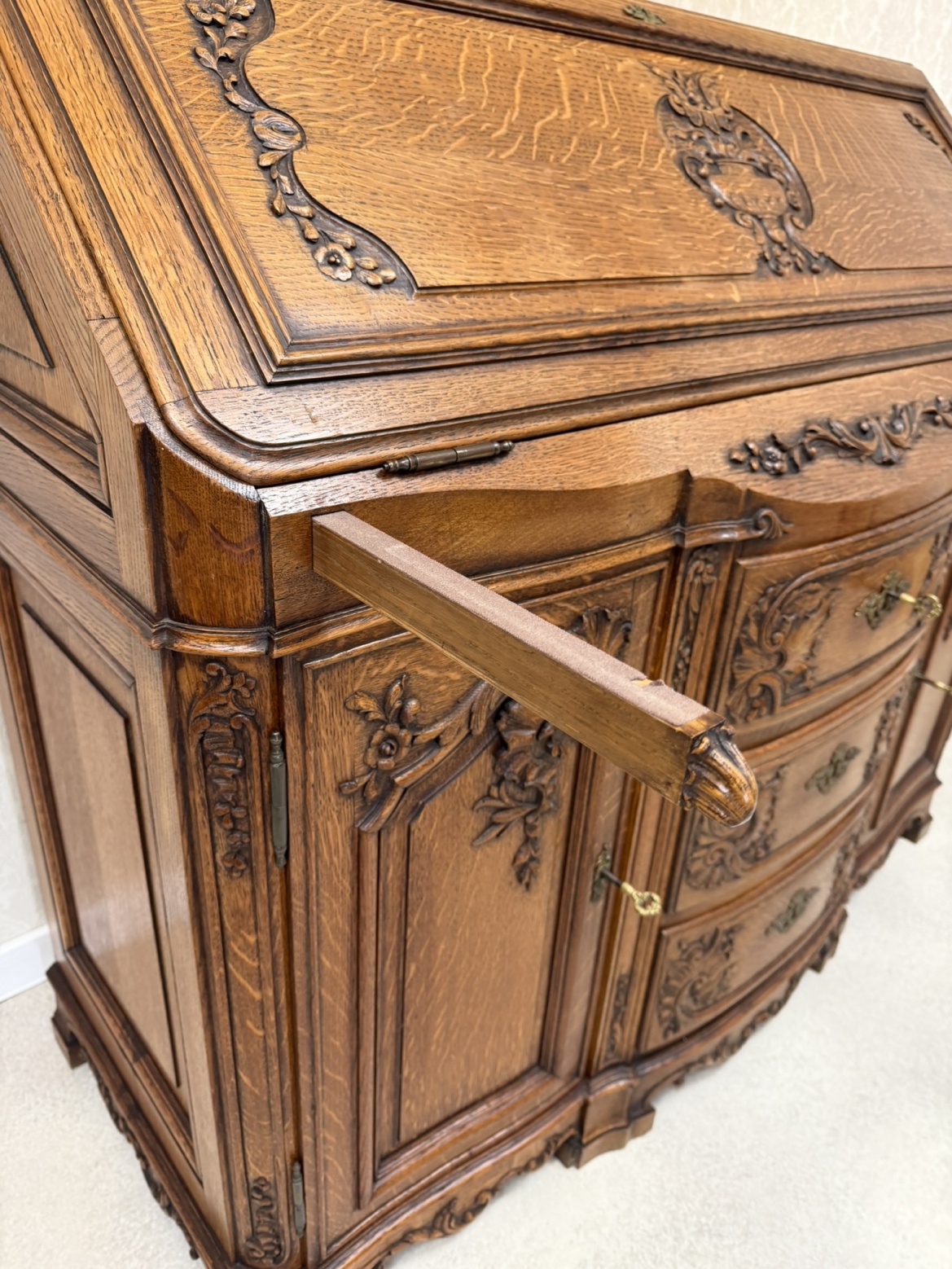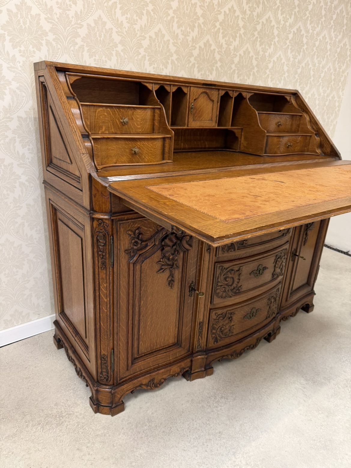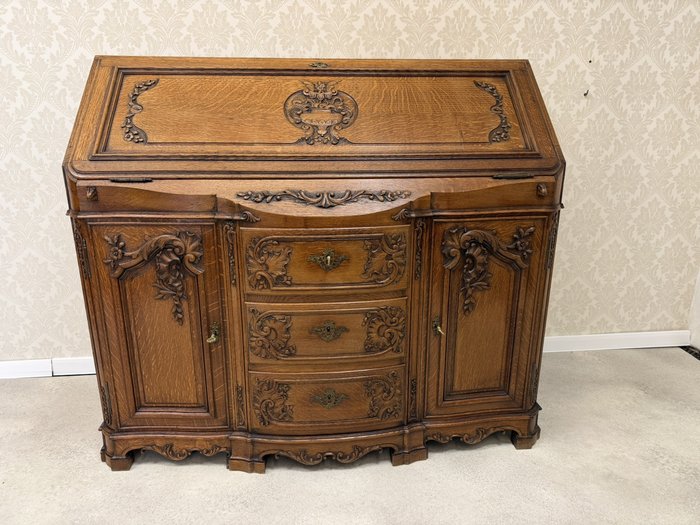 Elegantní psací stolek s bohatou řezbou. Přední výklopná deska odhaluje členěný interiér s množstvím malých zásuvek a přihrádek, ideální pro organizaci psacích potřeb. Středová část nabízí větší zásuvky s krásně zdobenými čelními plochami. Postranní dvířka poskytují další úložný prostor. Sekretář vyniká kvalitním řemeslným zpracováním a dekorativními prvky ve formě rostlinných motivů.27 850 Kč
