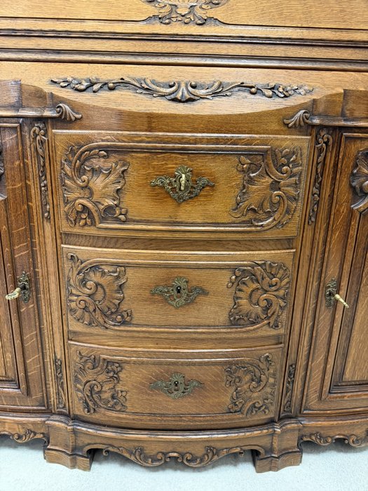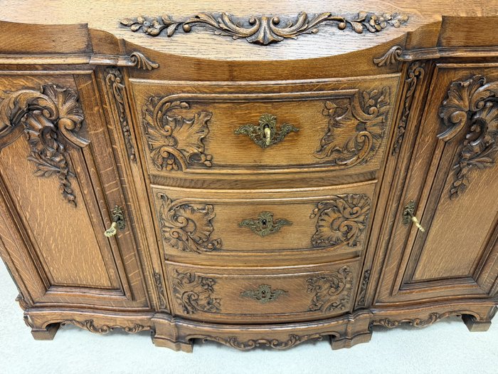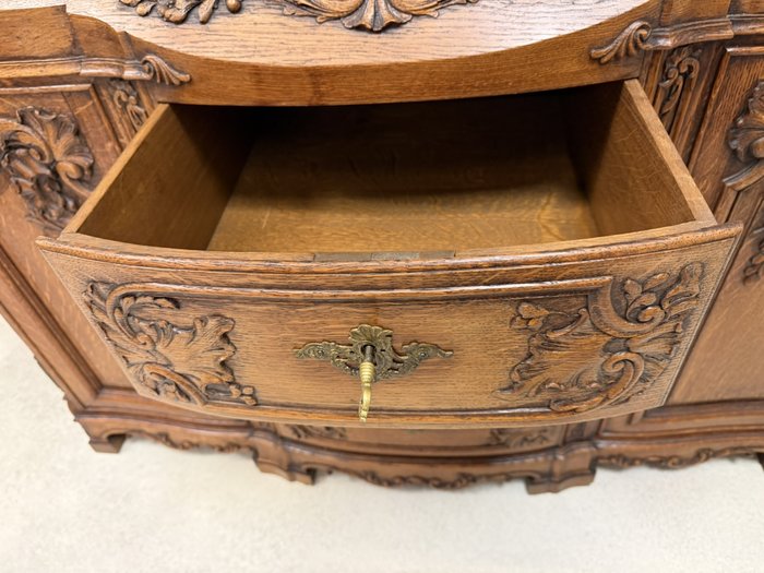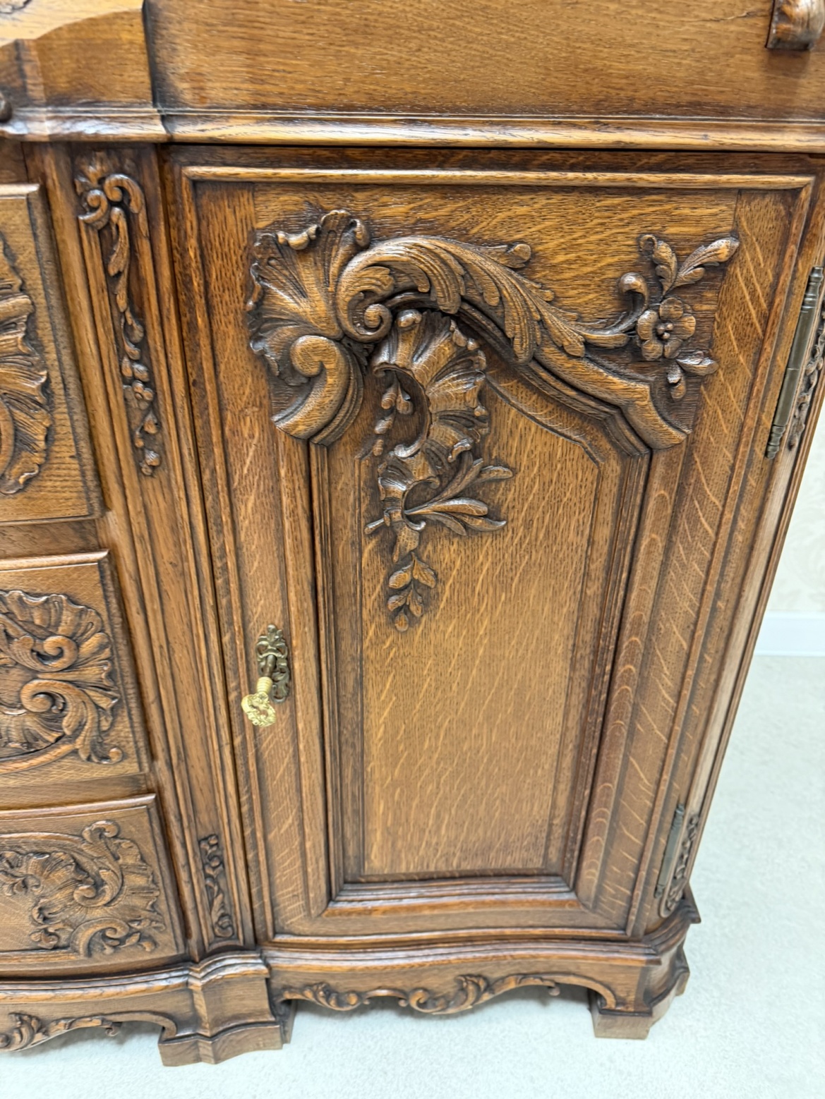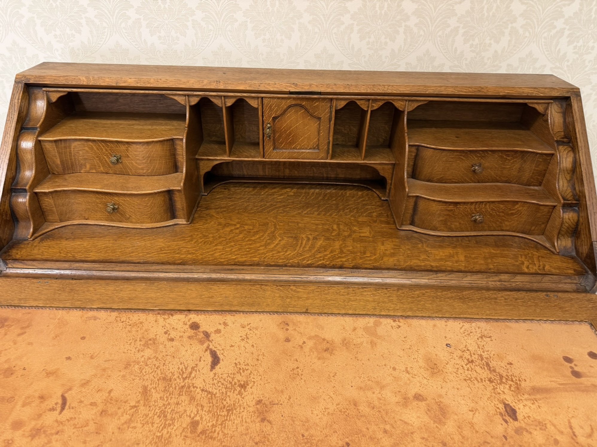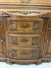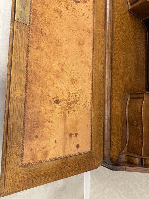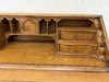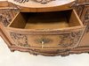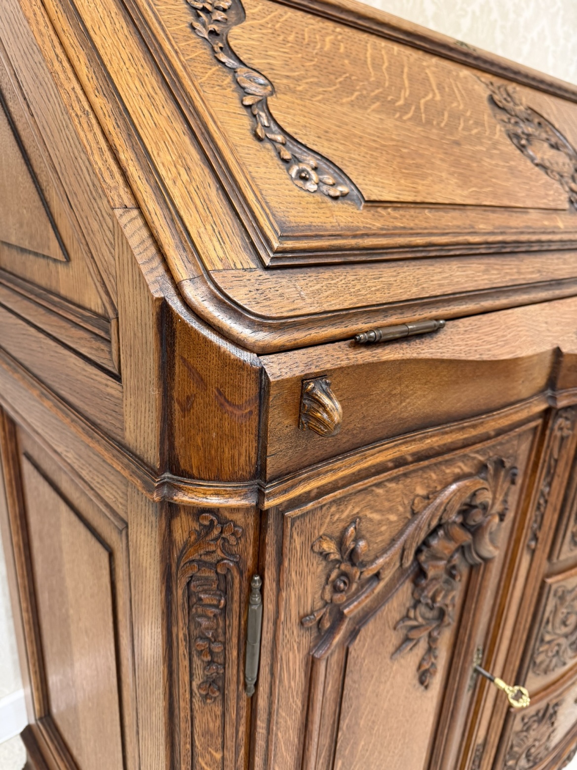 Elegantní psací stolek s bohatou řezbou. Přední výklopná deska odhaluje členěný interiér s množstvím malých zásuvek a přihrádek, ideální pro organizaci psacích potřeb. Středová část nabízí větší zásuvky s krásně zdobenými čelními plochami. Postranní dvířka poskytují další úložný prostor. Sekretář vyniká kvalitním řemeslným zpracováním a dekorativními prvky ve formě rostlinných motivů.27 850 Kč