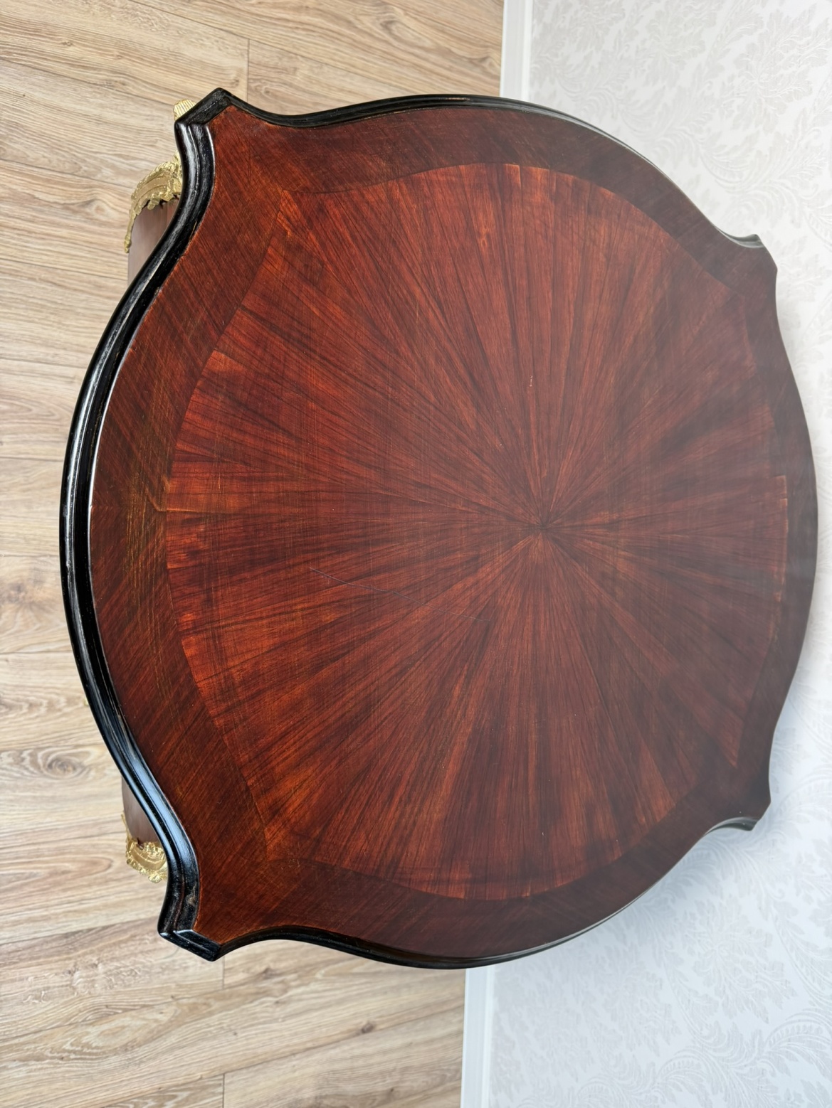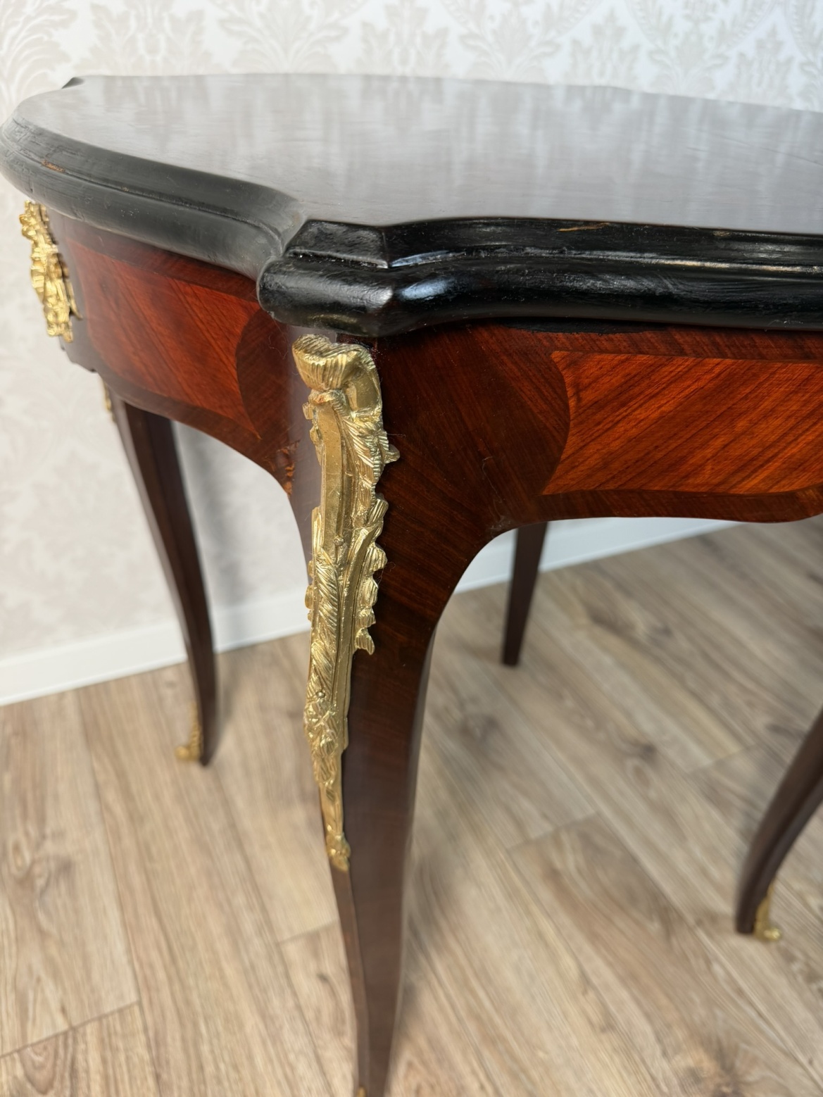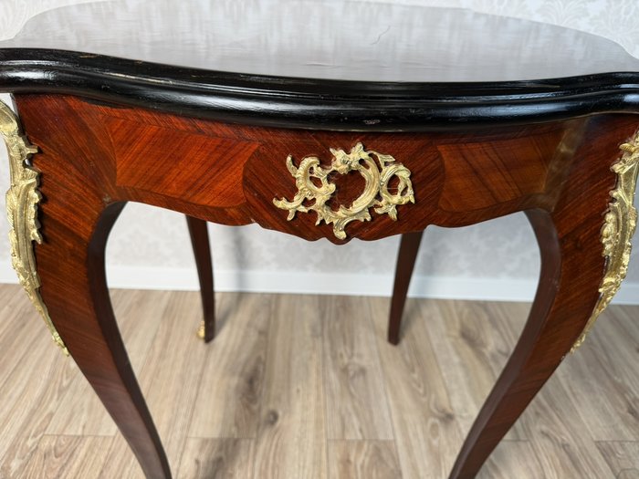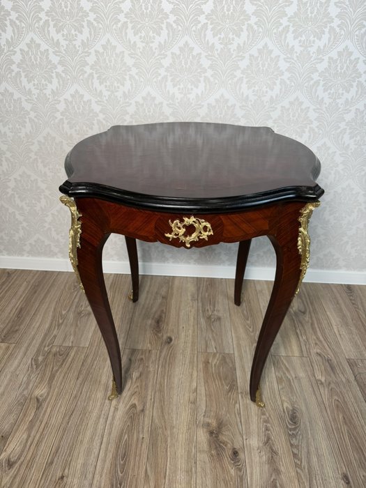 Stolek s tmavou, hvězdicově skládanou dýhovanou deskou a esovitě prohnutými nohami. Boky a nohy jsou zdobeny bohatě tvarovanými bronzovými aplikacemi s florálními motivy.6 980 Kč