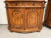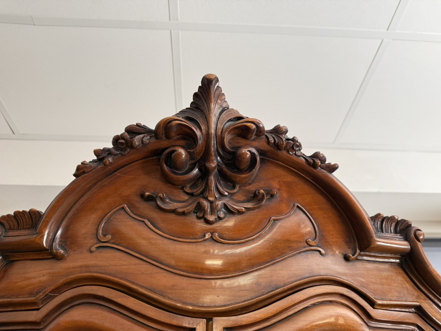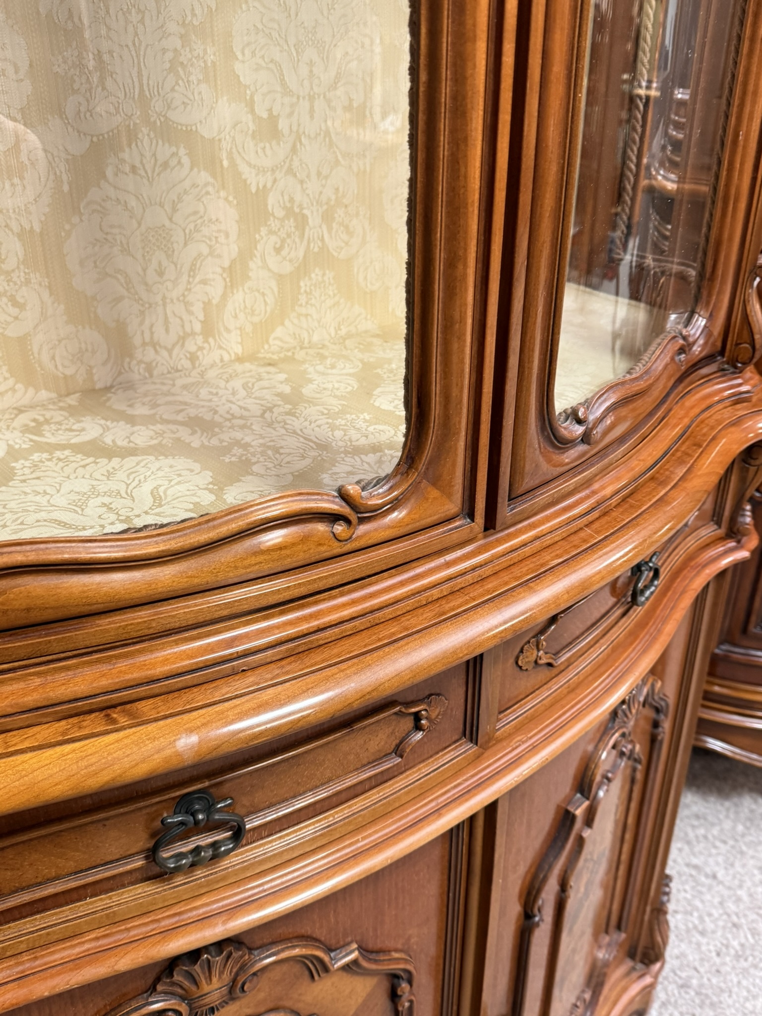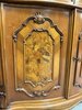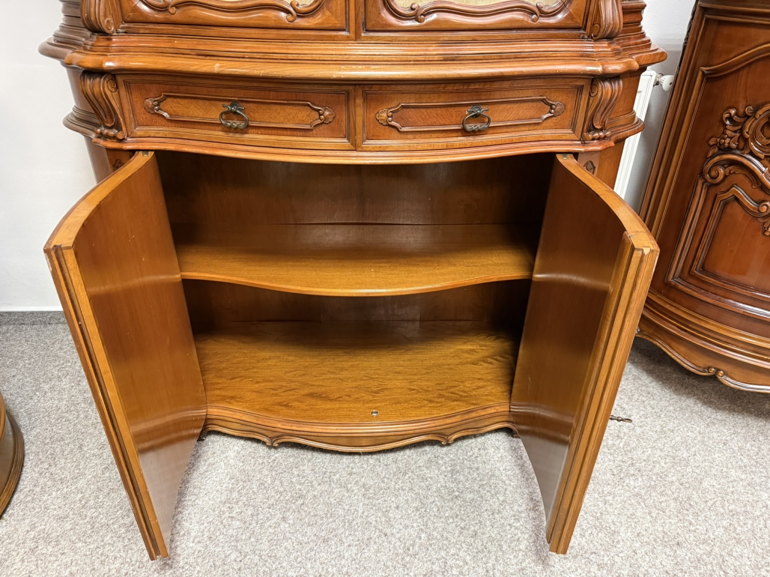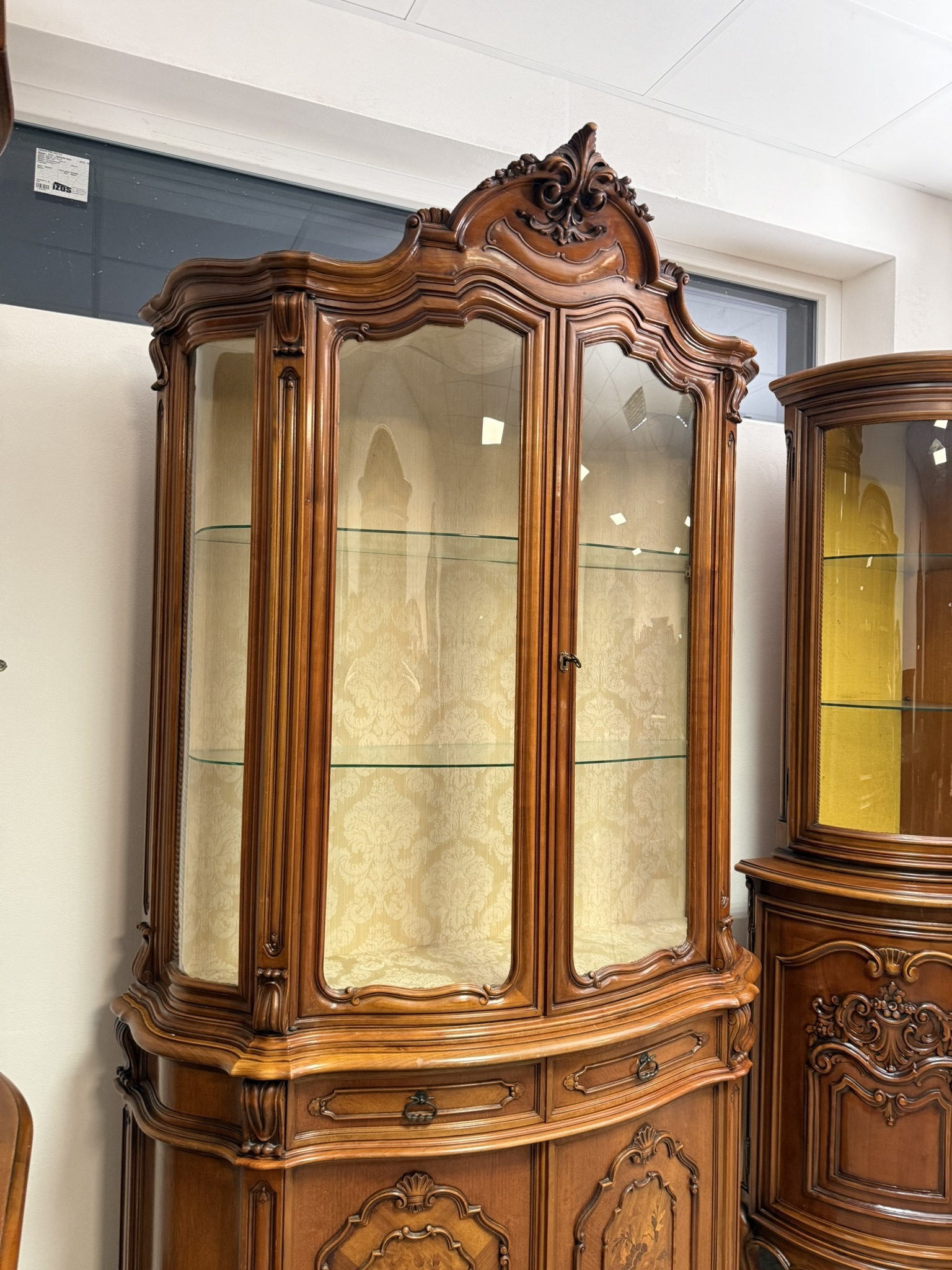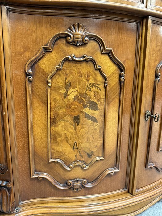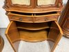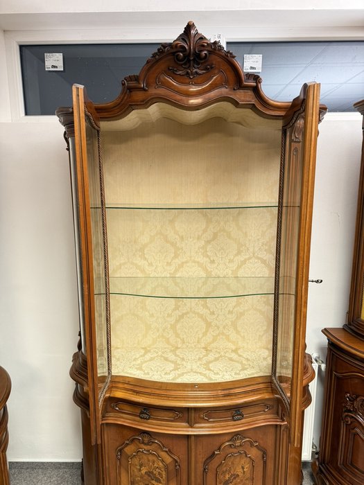 Vitrína s proskleným horním dílem se skleněnými policemi. Spodní část tvoří intarzovaná dvířka s květinovými motivy a zásuvky s ozdobným kováním. Dominantním prvkem je bohatě řezaná horní korunka s ladnými křivkami.27 690 Kč
