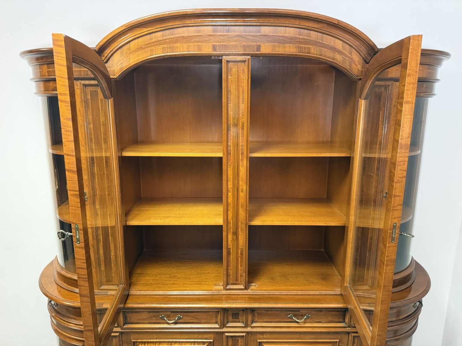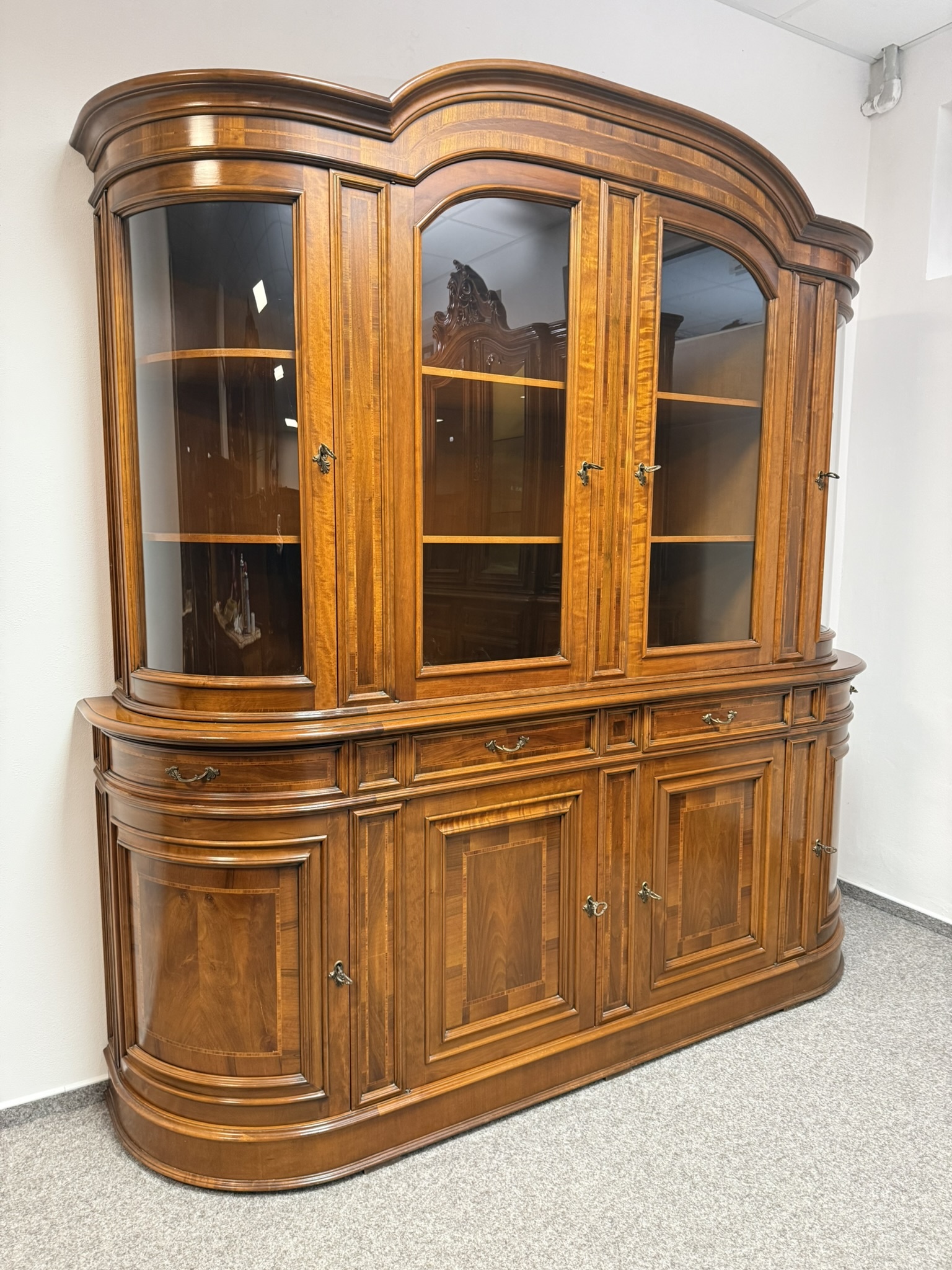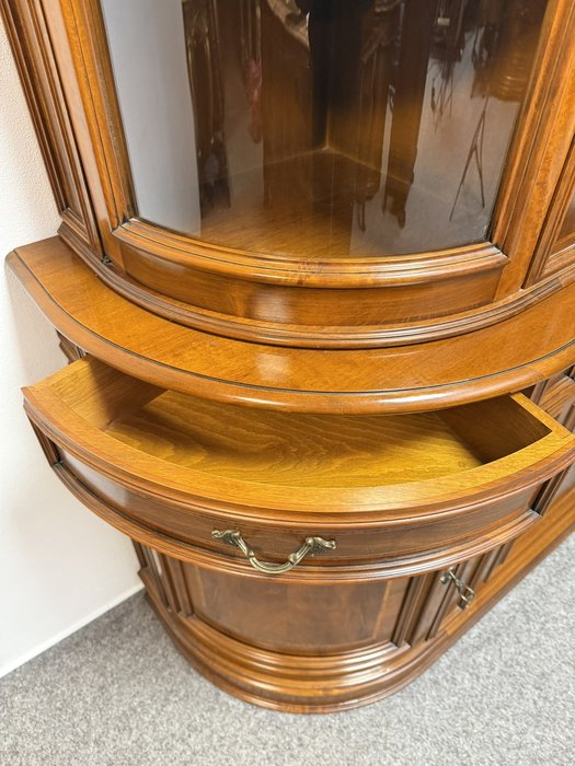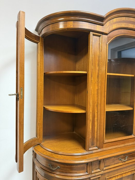 Precizně zpracovaná vitrína s čistými liniemi, jemnou intarzií a obloukovým zakončením vrchní části. Prosklený horní díl s policemi je ideální pro vystavení porcelánu či skla. Spodní část s dvířky a zásuvkami nabízí praktický úložný prostor. Harmonické proporce a decentní zdobnost.29 980 Kč