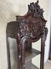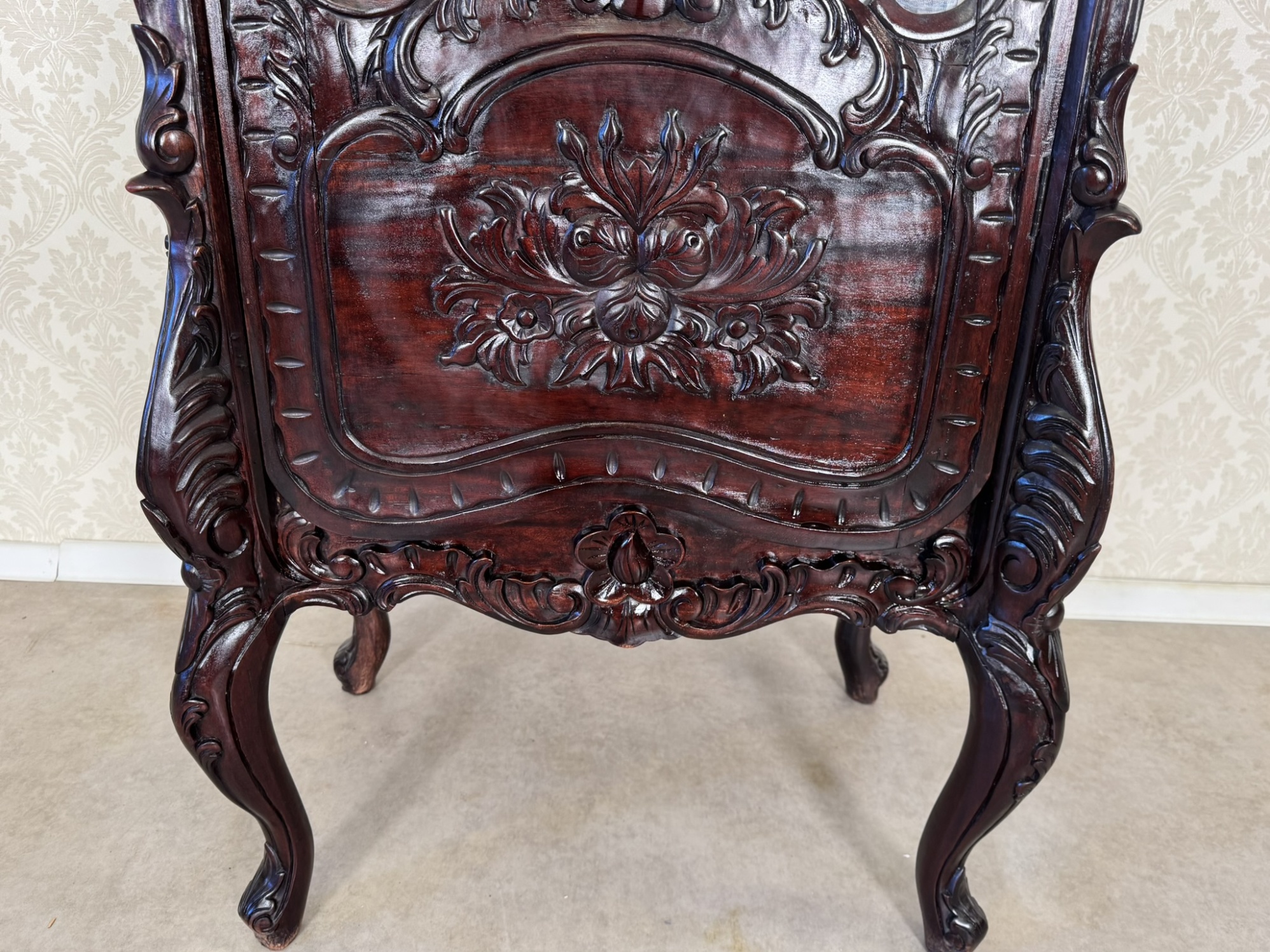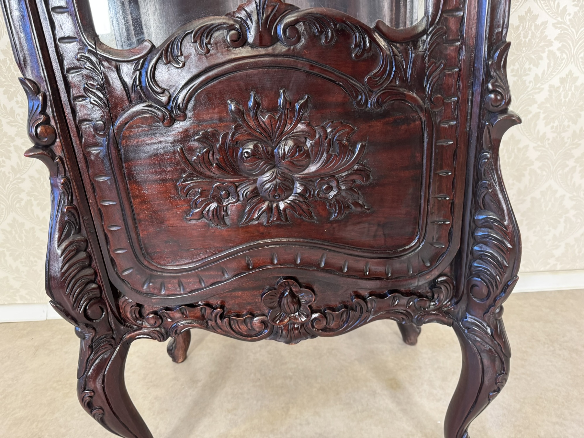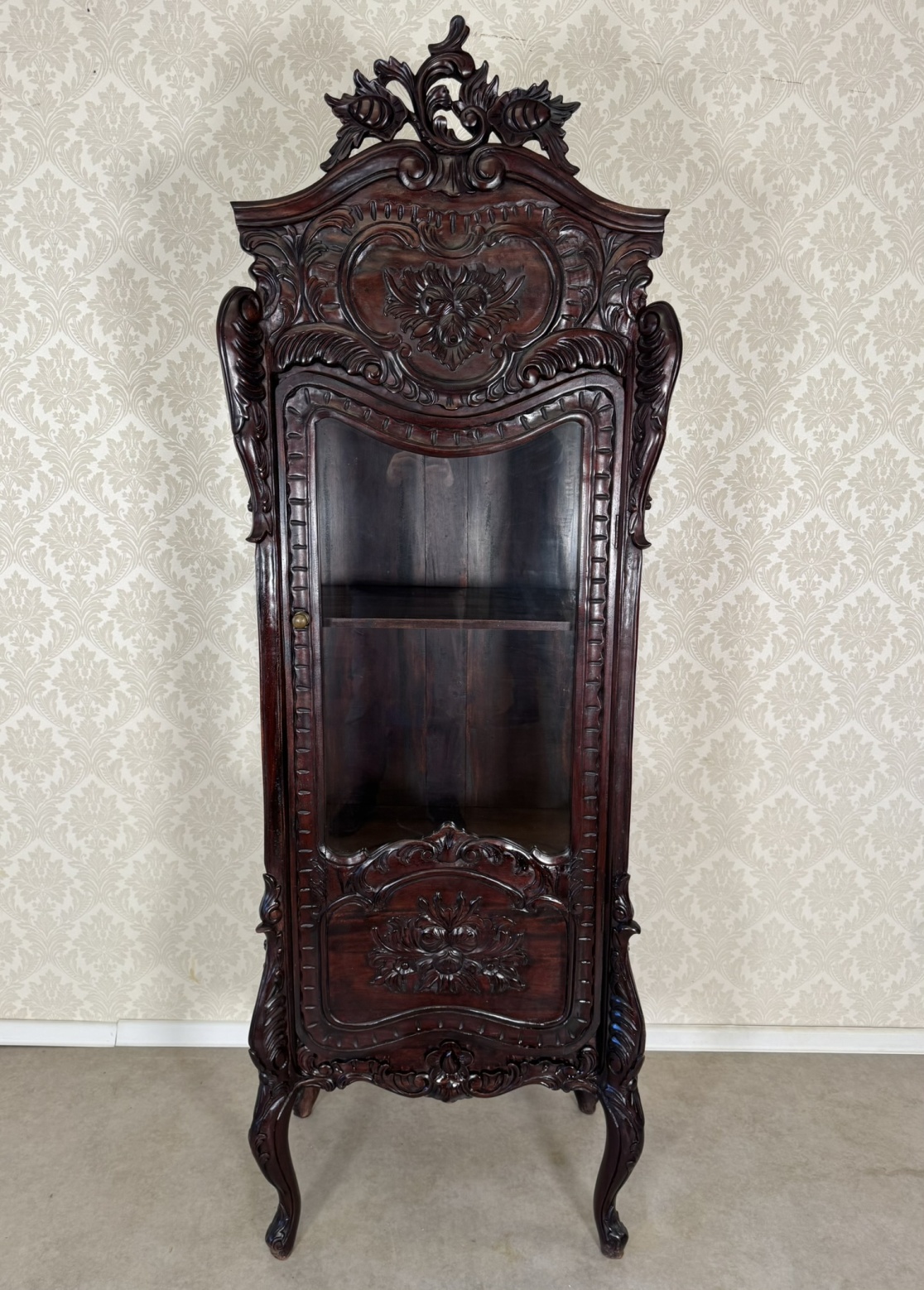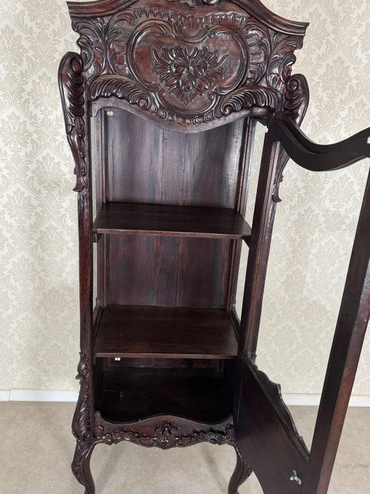 Elegantní vitrína s vyřezávanými detaily florálních a ornamentálních motivů. Přední prosklená dvířka s jemným křivkovým rámem odhalují vnitřní police. Spodní část doplňuje ozdobný panel s reliéfním květinovým dekorem. Celek stojí na tvarovaných nohách s vyřezávanými detaily, což dodává noblesní charakter. Povrch dřeva má hluboký lesk a bohatou patinu.29 650 Kč