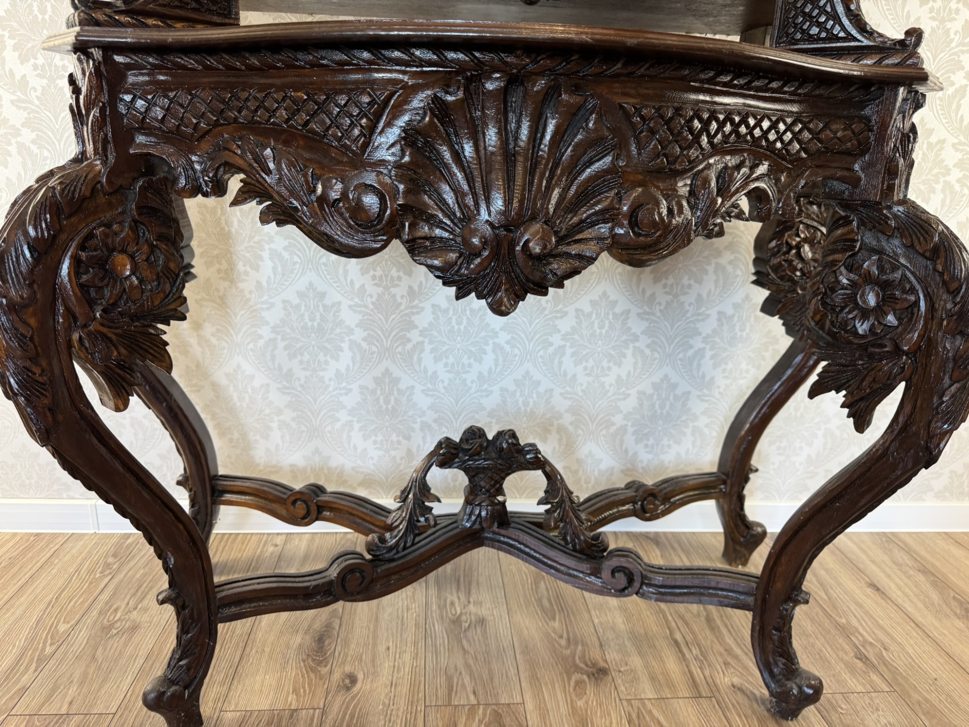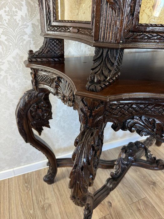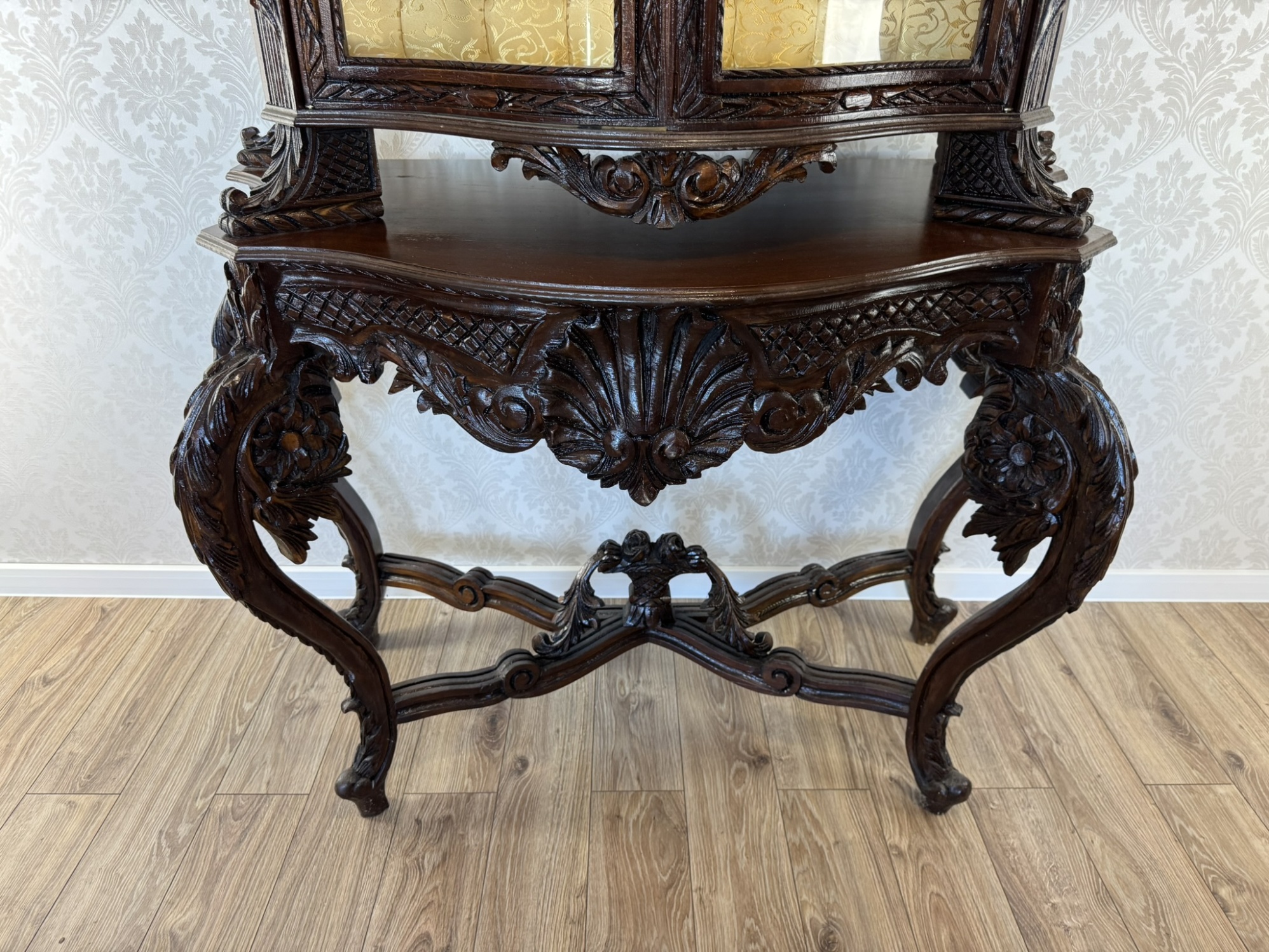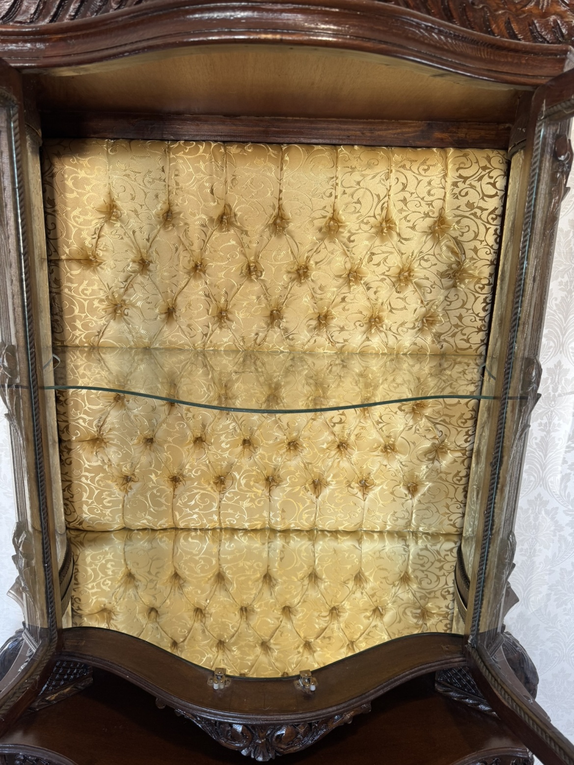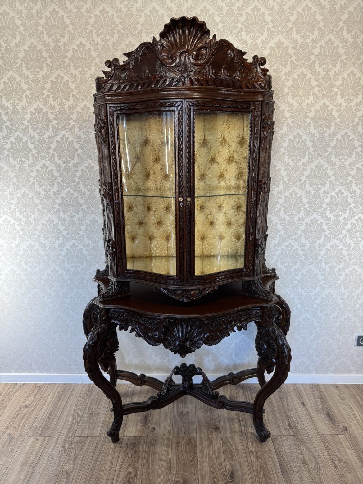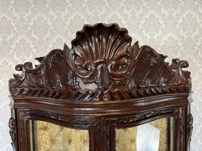 Impozantní vitrína s mušlovým motivem a světle zlatavým damaškovým potahem - ex112