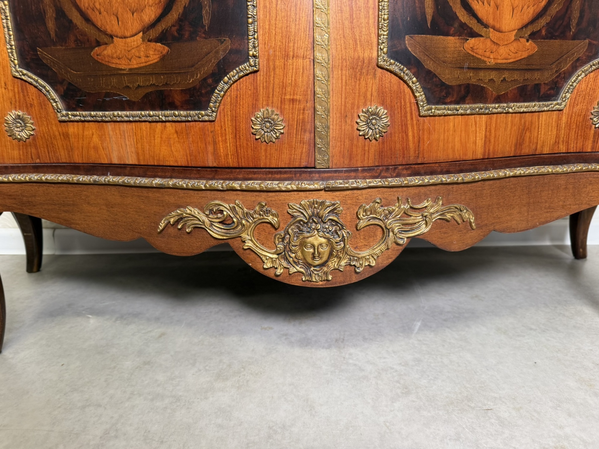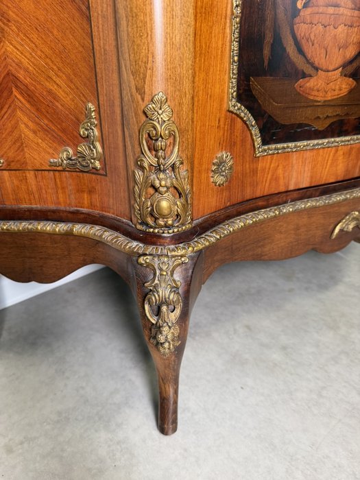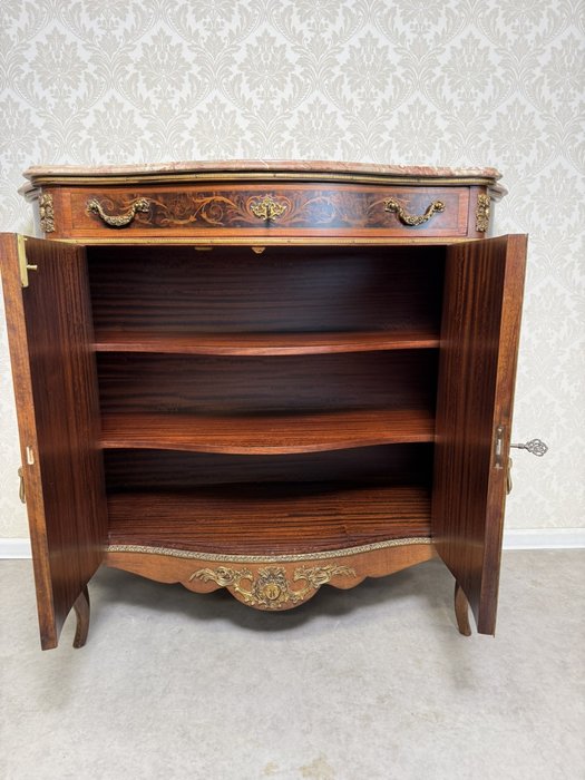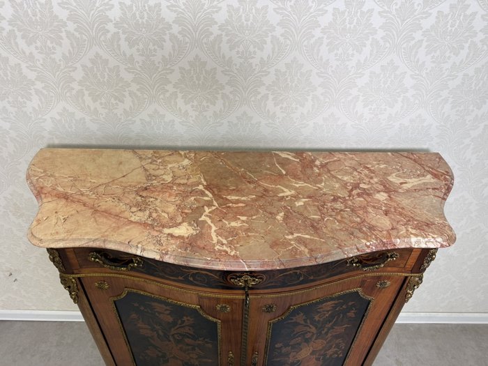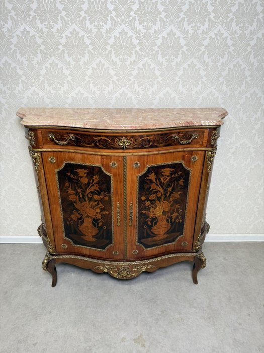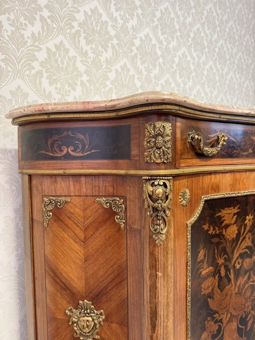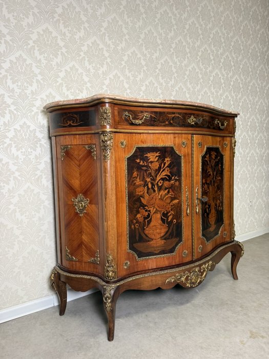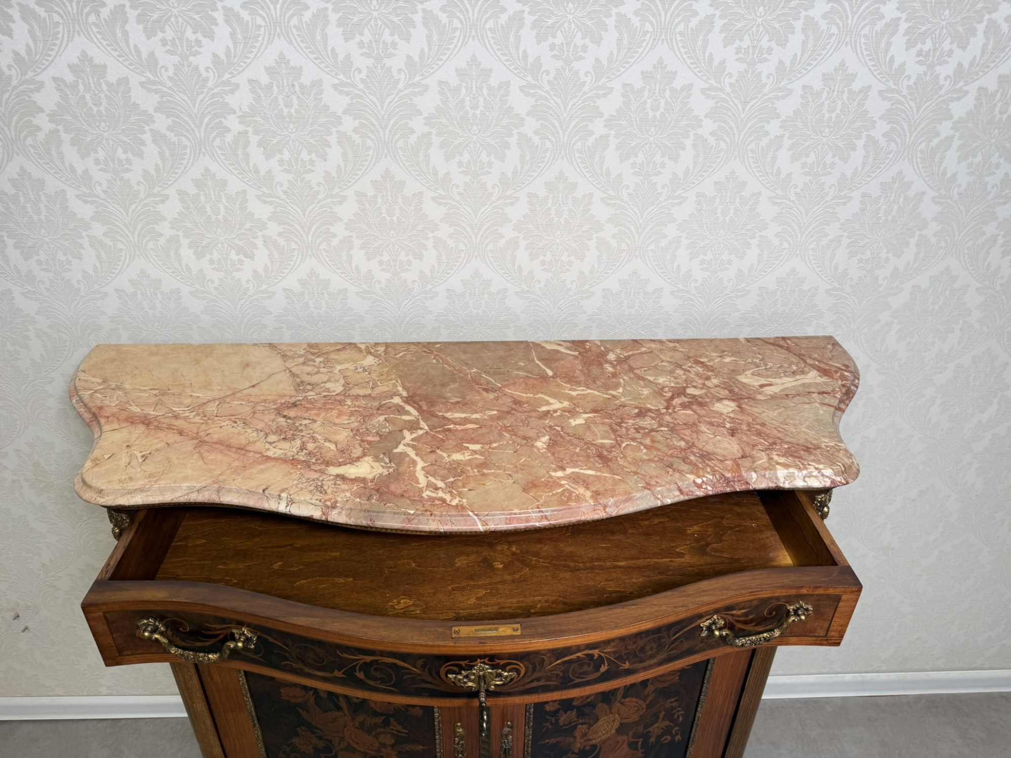 Luxusní komoda s tvarovanou růžovou mramorovou deskou, bohatou dýhou a intarziemi květin ve vázách. Bronzové aplikace, hlavičky, rozety a ozdobné lišty dotvářejí reprezentativní charakter. Vybavena zásuvkou a dvěma dvířky, uvnitř police. Ukázka precizního řemesla a stylového dekoru.36 850 Kč