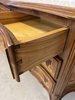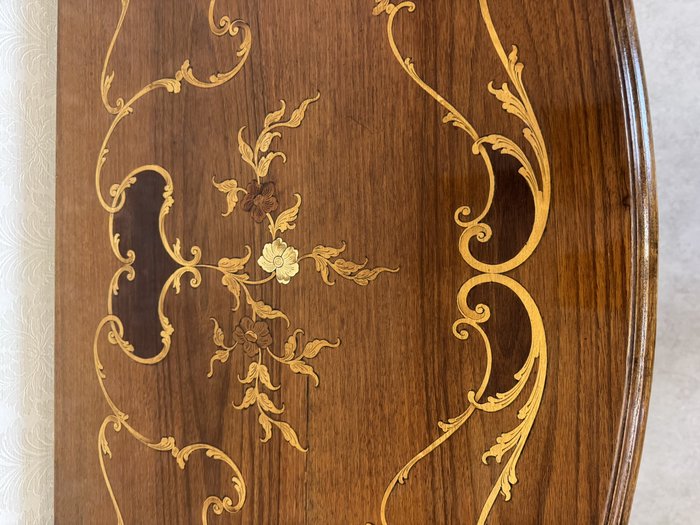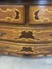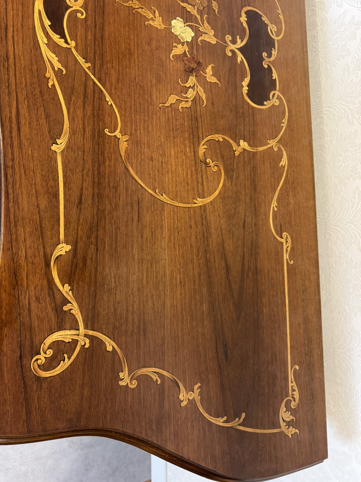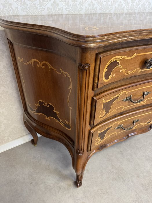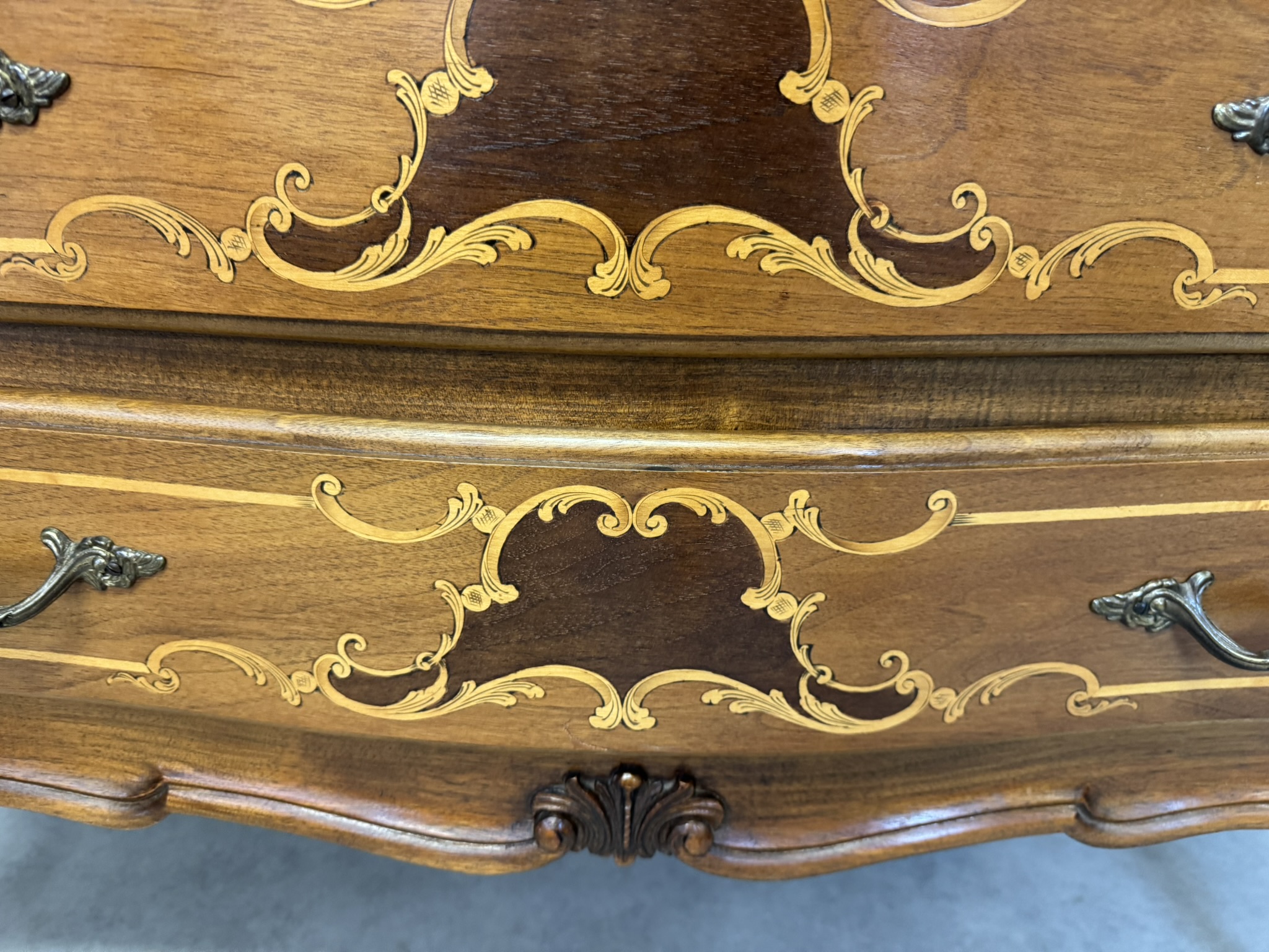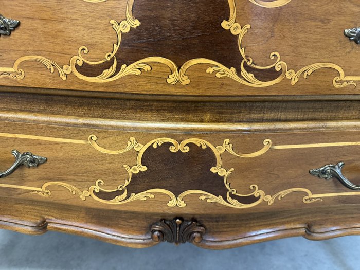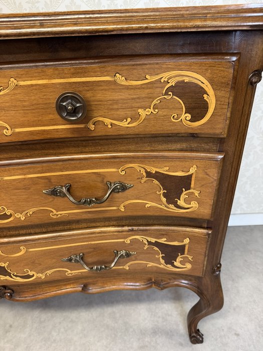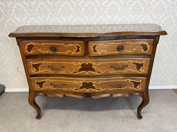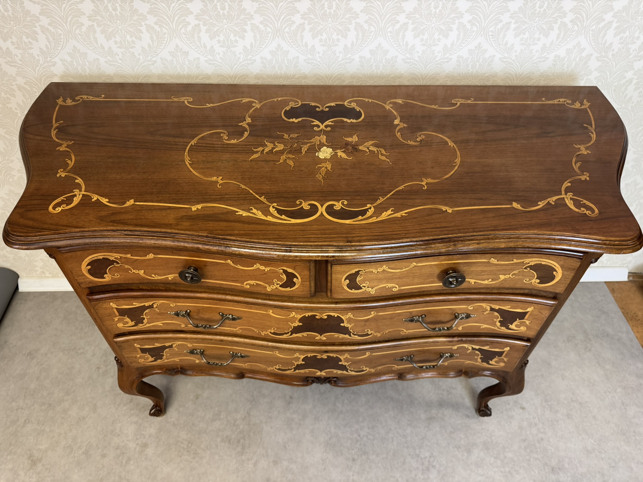 Komoda s tvarovanou dřevěnou deskou a pěti zásuvkami zdobenými světlou intarzií v ornamentálním stylu. Křivkově tvarované nohy i spodní linie podtrhují jemně barokní siluetu.29 850 Kč