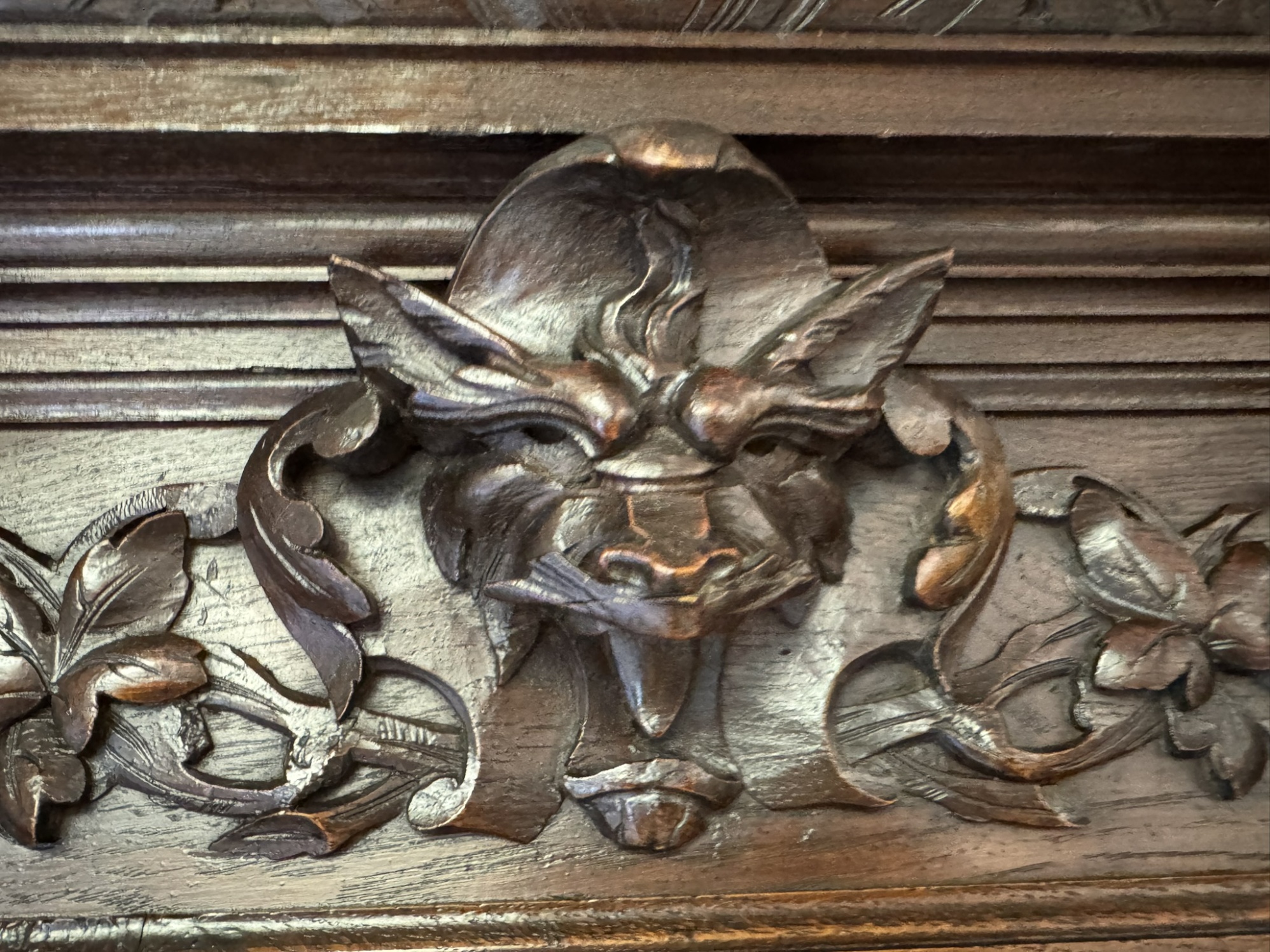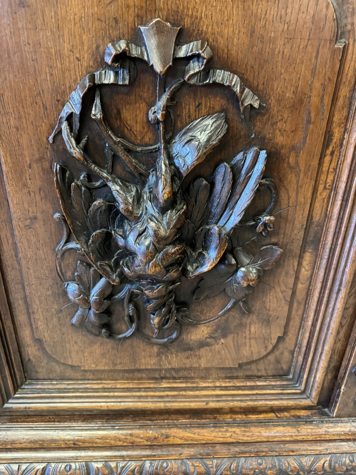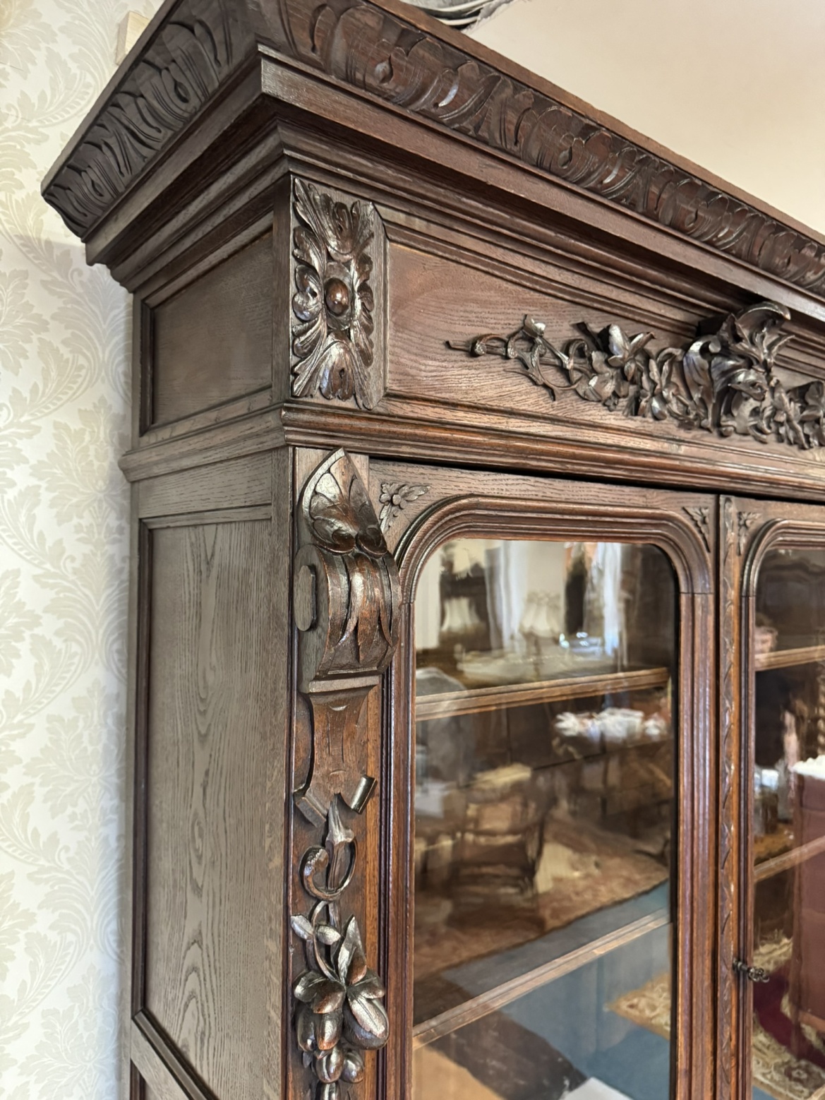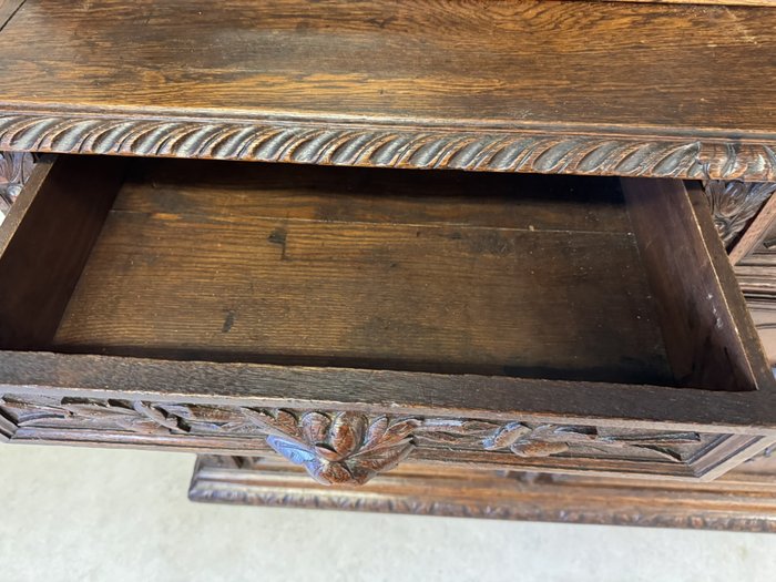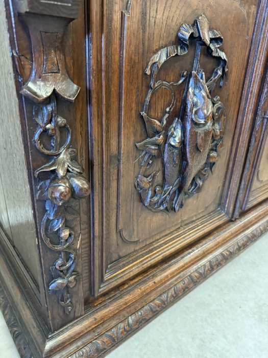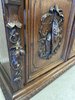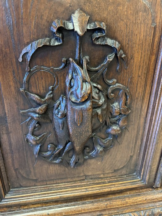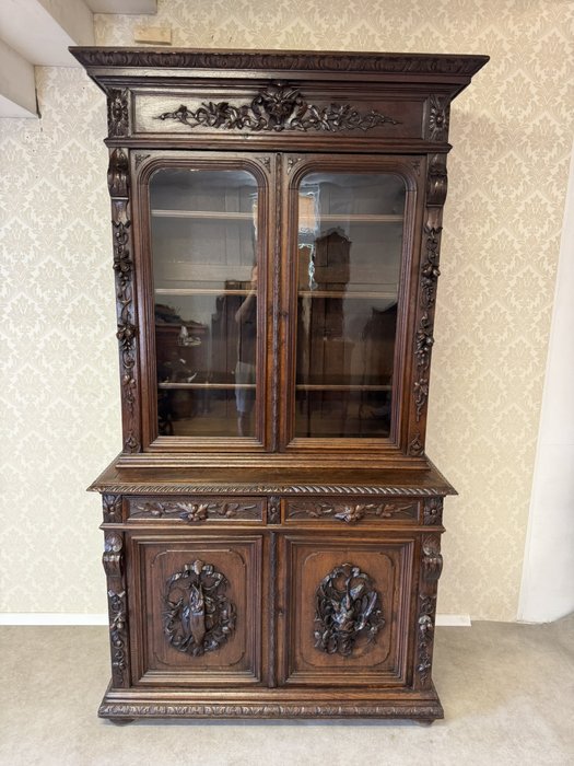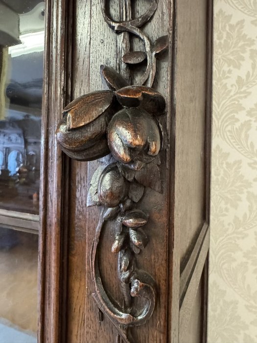 Precizně vyřezávaný dvoudílný příborník z tmavého dřeva s horní prosklenou částí a spodními plnými dvířky s loveckými motivy. Výrazná florální řezba a naturalistické detaily, včetně vyobrazení zvířat a lidské tváře se symbolickým výrazem, odkazují na styl renesance.23 480 Kč