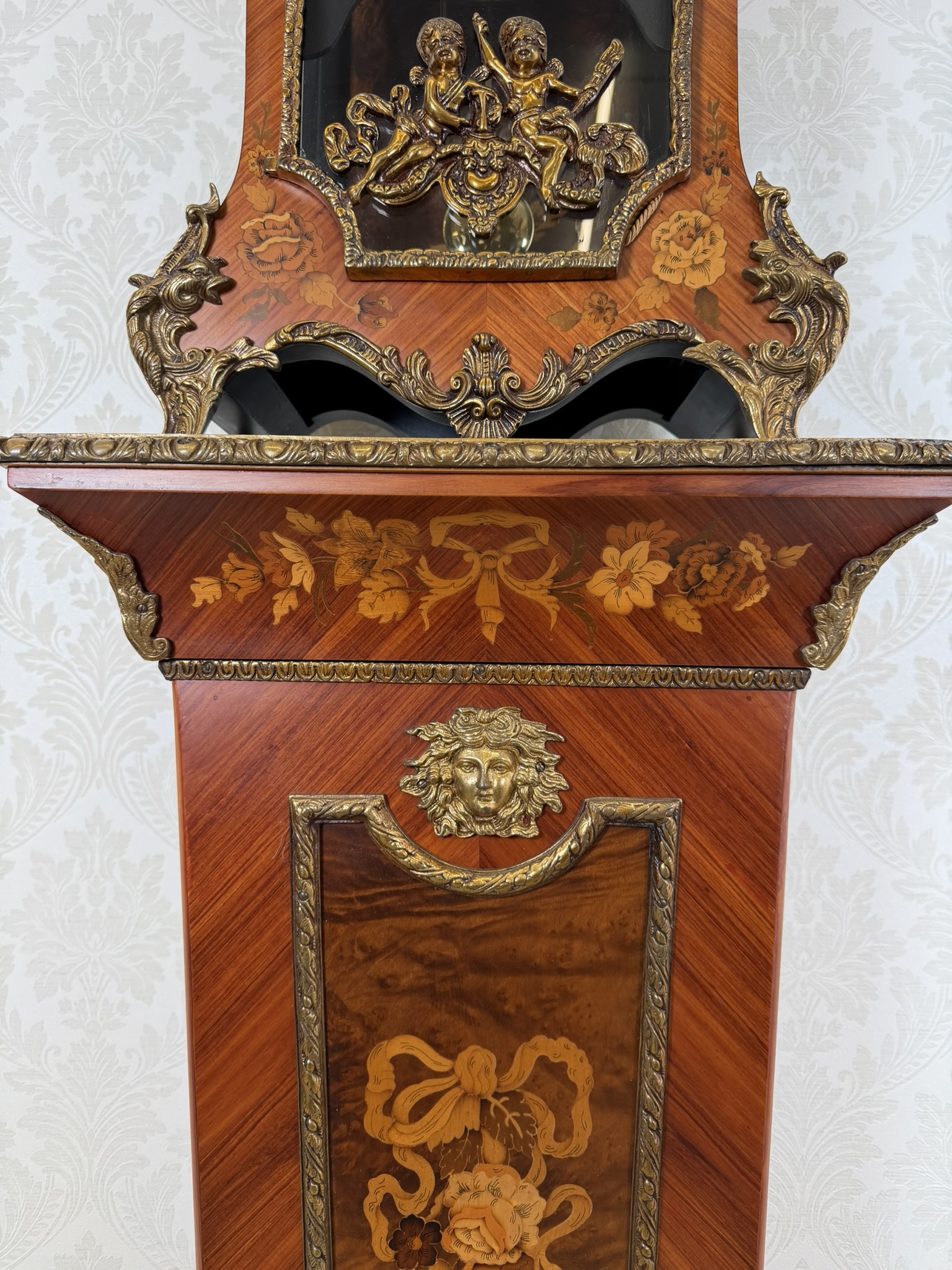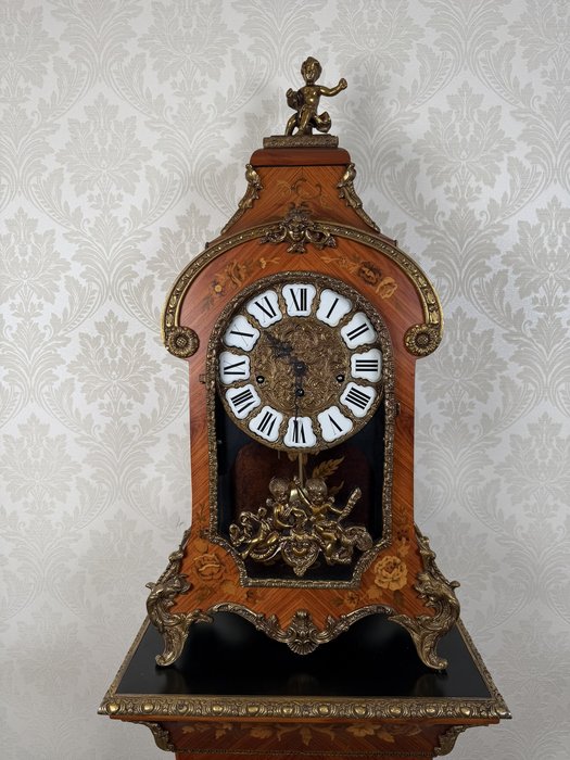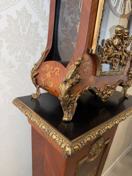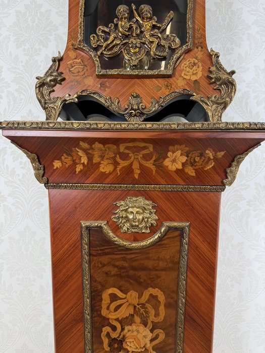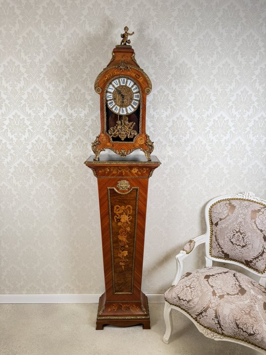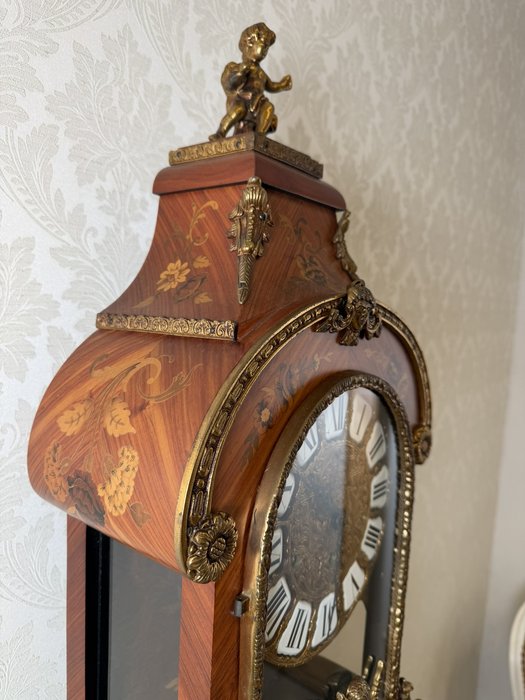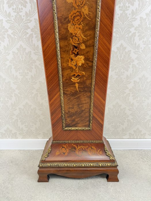 Elegantní stojací hodiny z Itálie z období kolem roku 1920. Hodiny jsou zdobeny jemnou intarzií s květinovými motivy a doplněny dekorativními bronzovými prvky. Číselník s římskými číslicemi je zasazen do zdobeného rámu a pod ním se nachází prosklené okénko s kyvadlem. Hodiny stojí na vysokém podstavci se stejnou intarzovanou výzdobou, díky čemuž působí velmi reprezentativně.