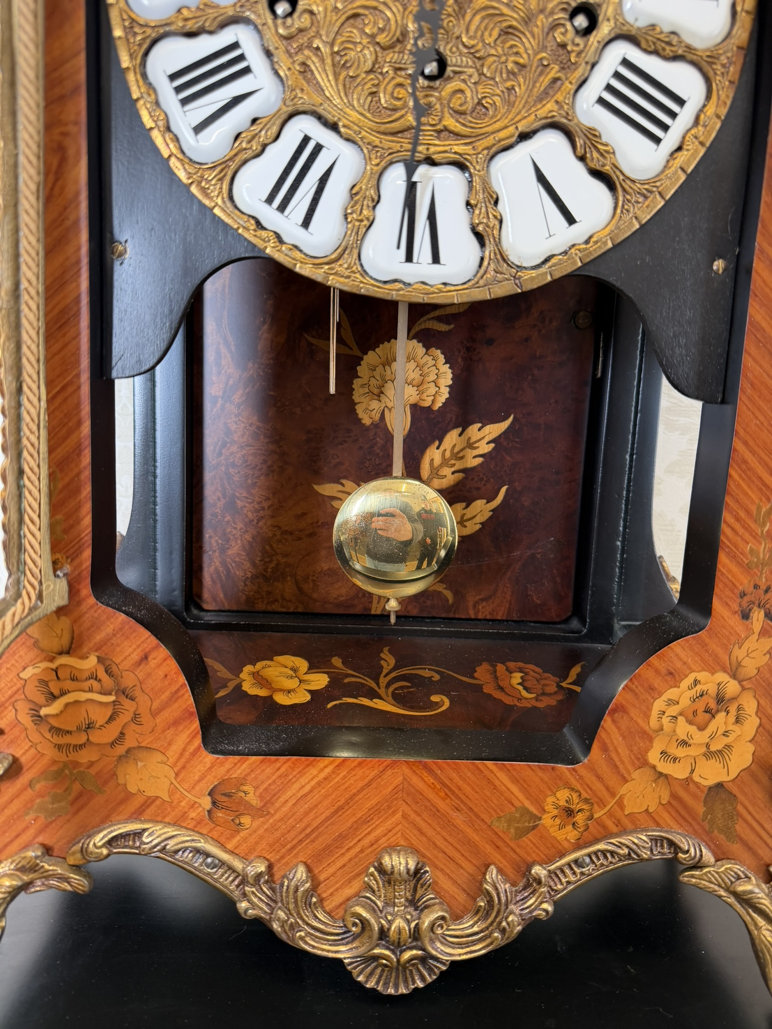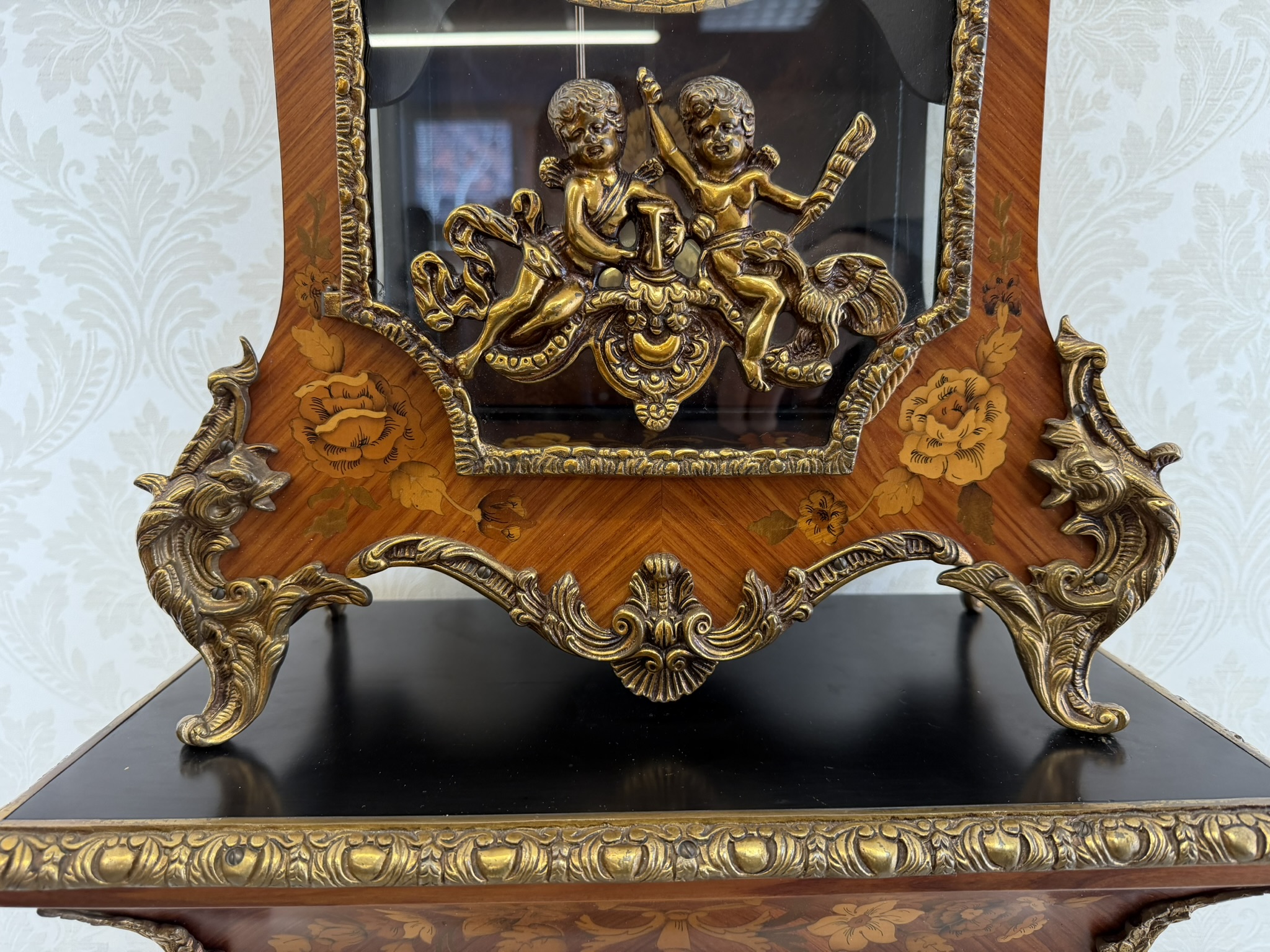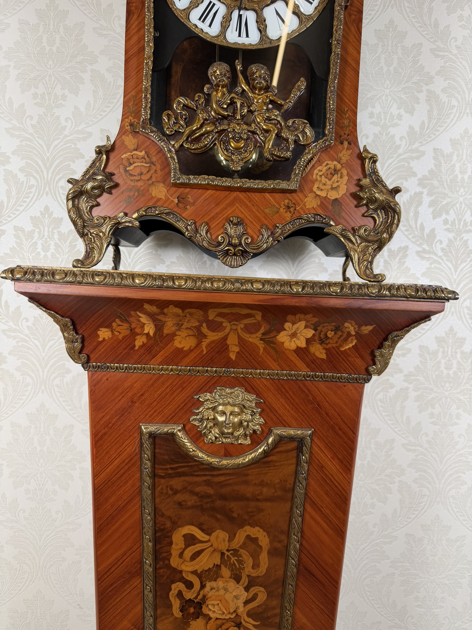 Elegantní stojací hodiny z Itálie z období kolem roku 1920. Hodiny jsou zdobeny jemnou intarzií s květinovými motivy a doplněny dekorativními bronzovými prvky. Číselník s římskými číslicemi je zasazen do zdobeného rámu a pod ním se nachází prosklené okénko s kyvadlem. Hodiny stojí na vysokém podstavci se stejnou intarzovanou výzdobou, díky čemuž působí velmi reprezentativně.