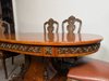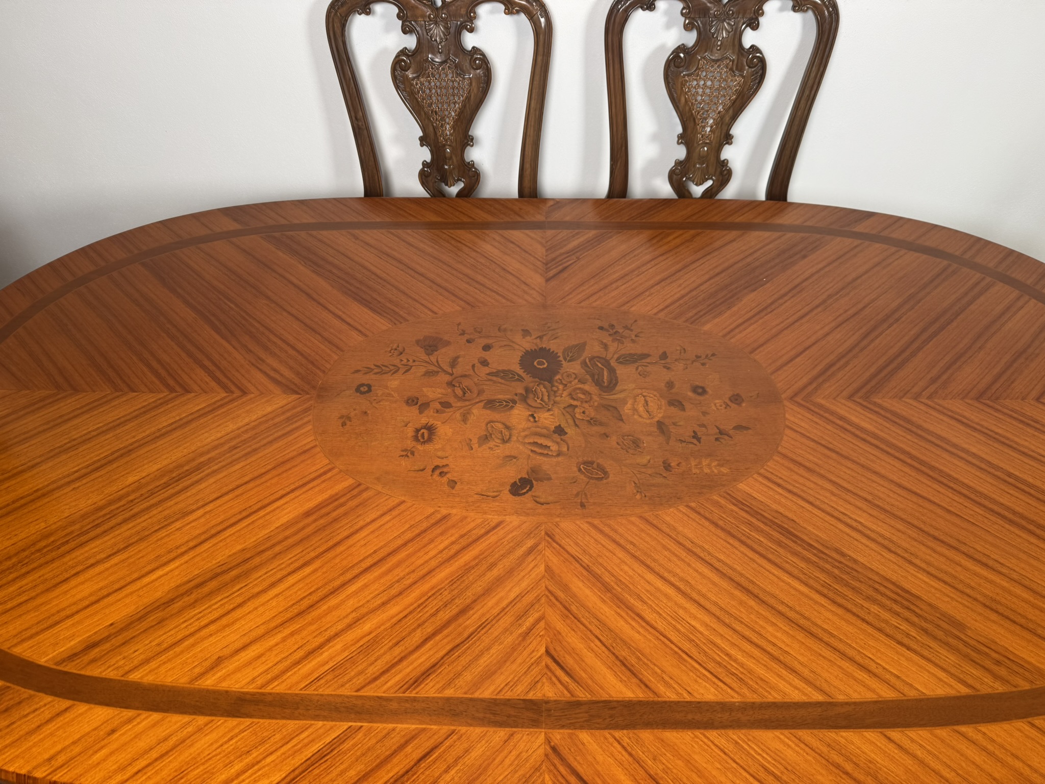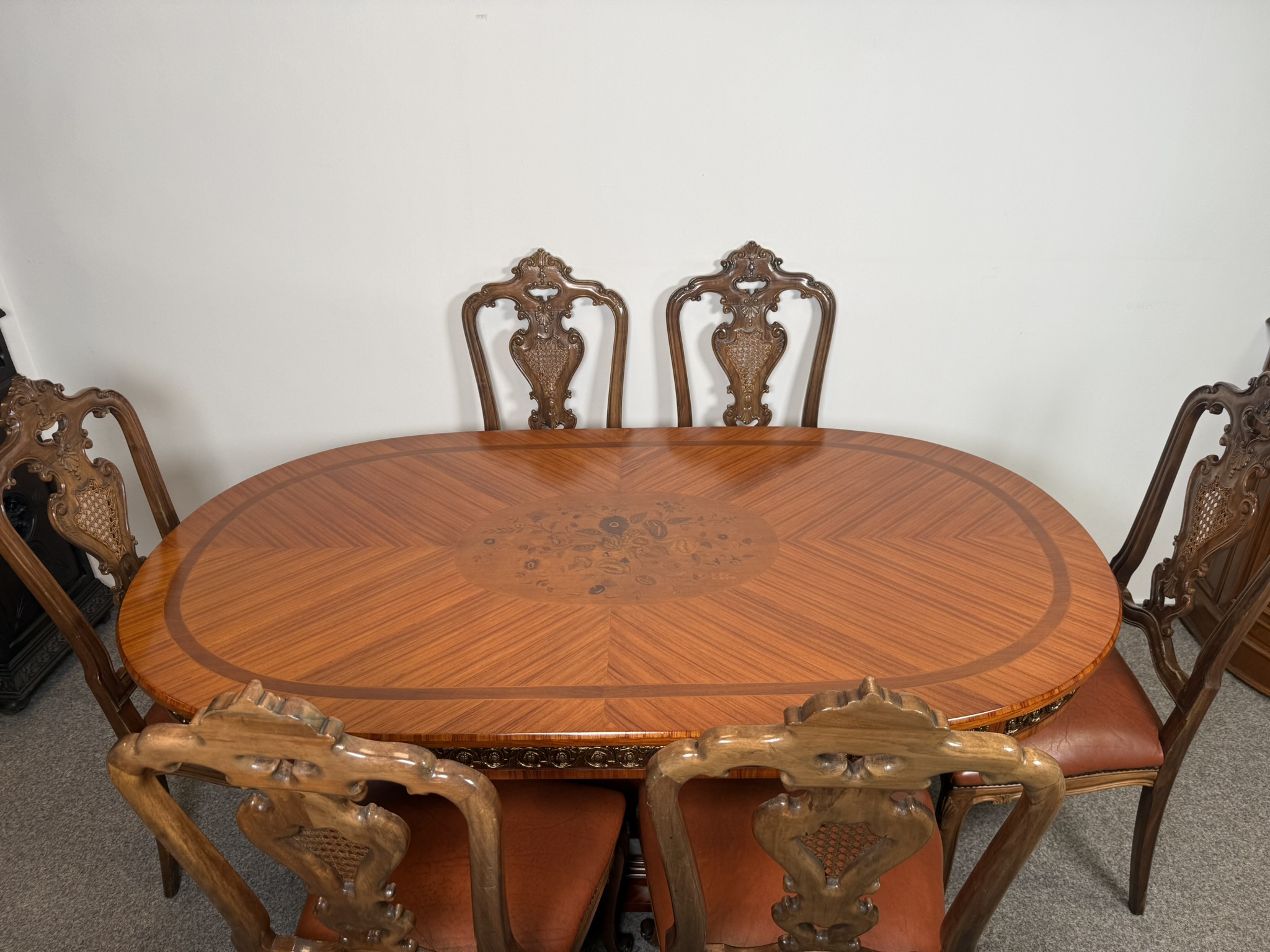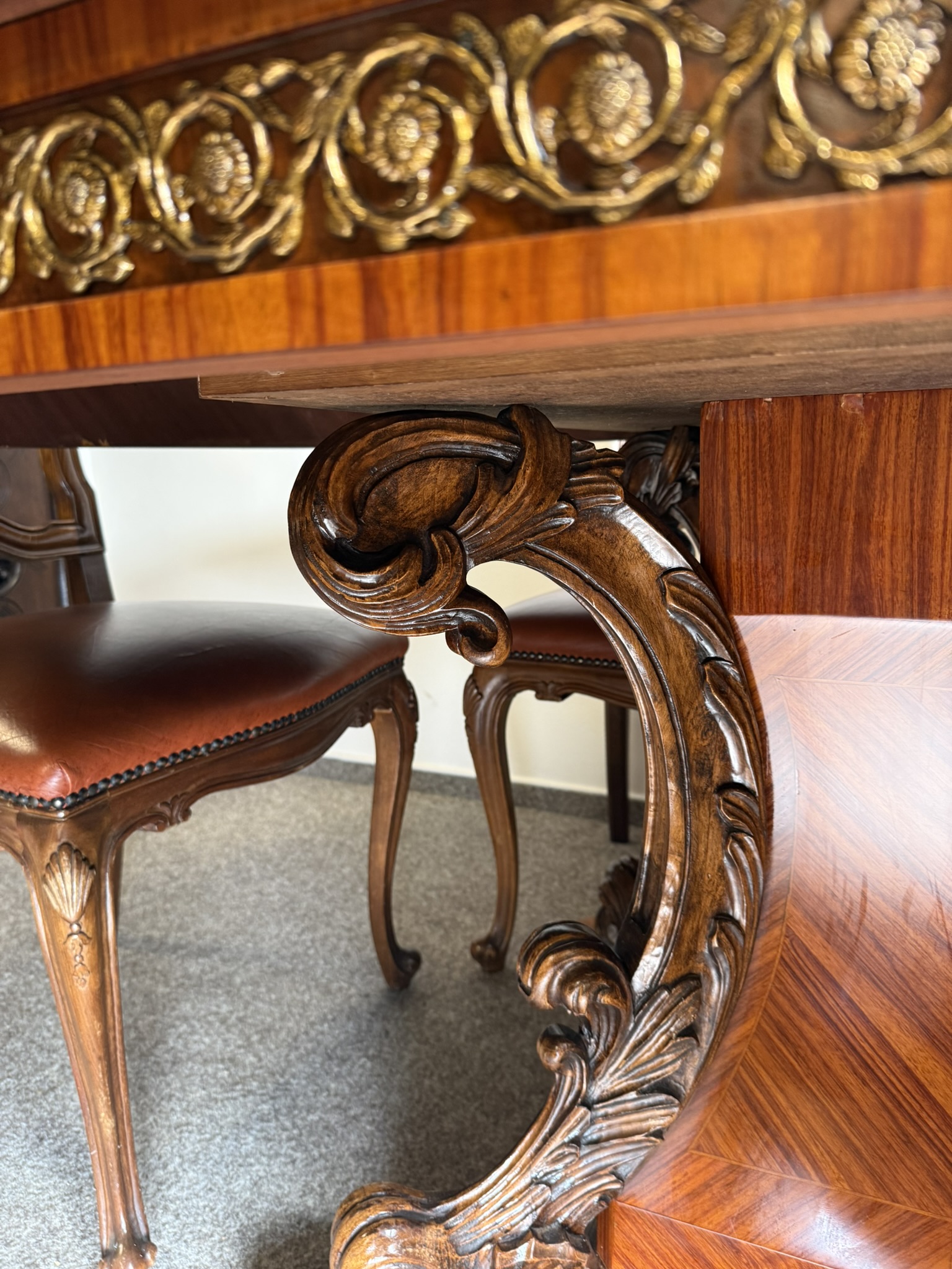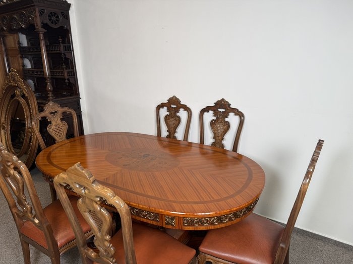 Reprezentativní jídelní set, tvořený oválným stolem a šesti čalouněnými židlemi. Deska stolu je zdobena květinovou intarzií ve středovém medailonu. Profilovaný okraj stolu doplňuje dekorativní kovový ornament. Dominantou je masivní středová podnož s výraznou řezbou akantových motivů a stabilní křížovou základnou. Šest stylových židlí s vyřezávanými opěráky harmonicky doplňuje celek. Stůl není rozkládací.