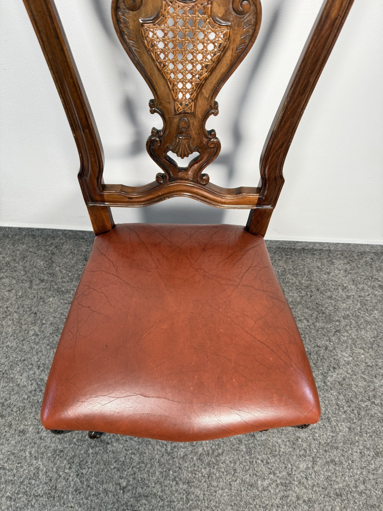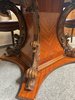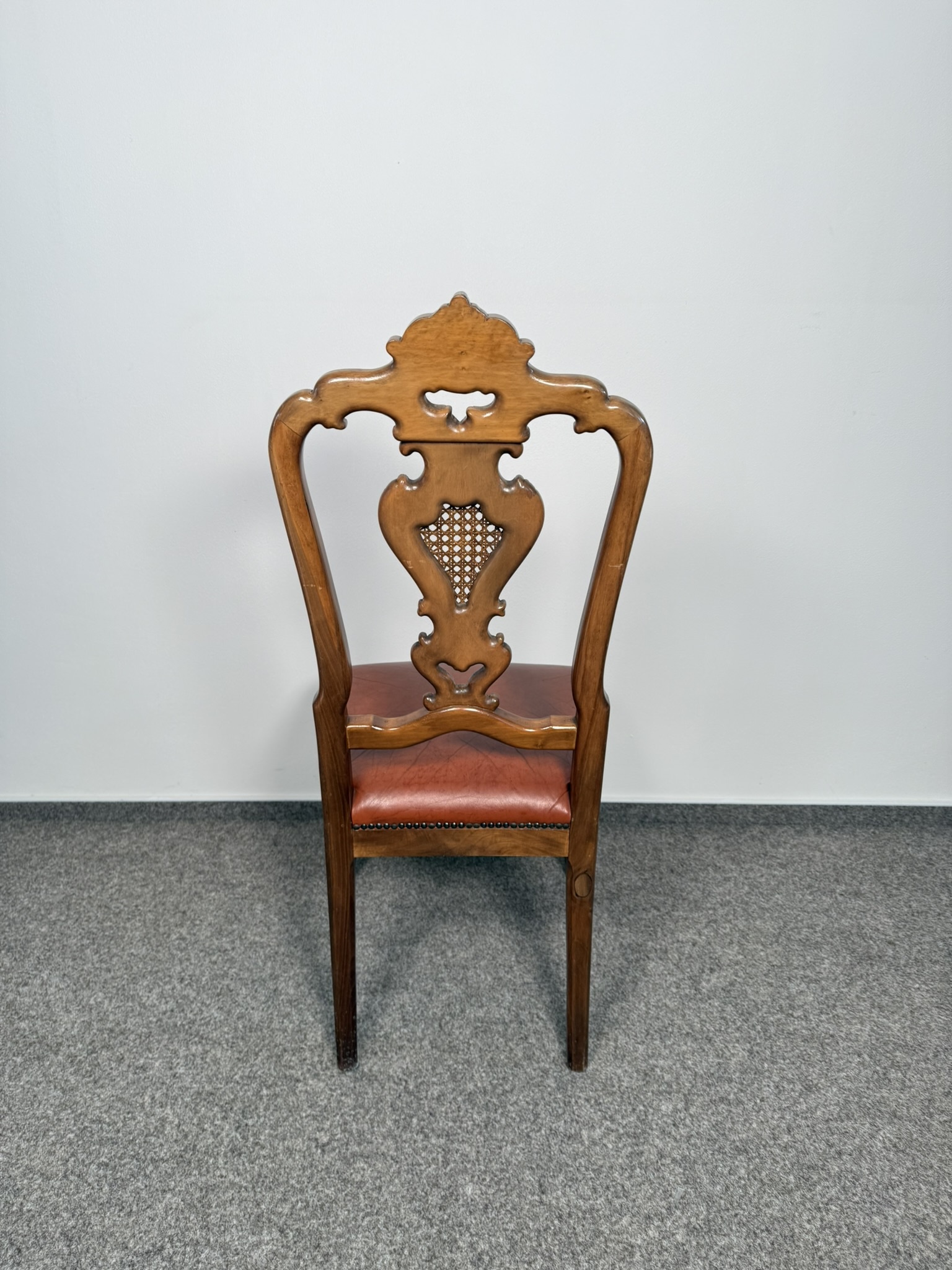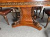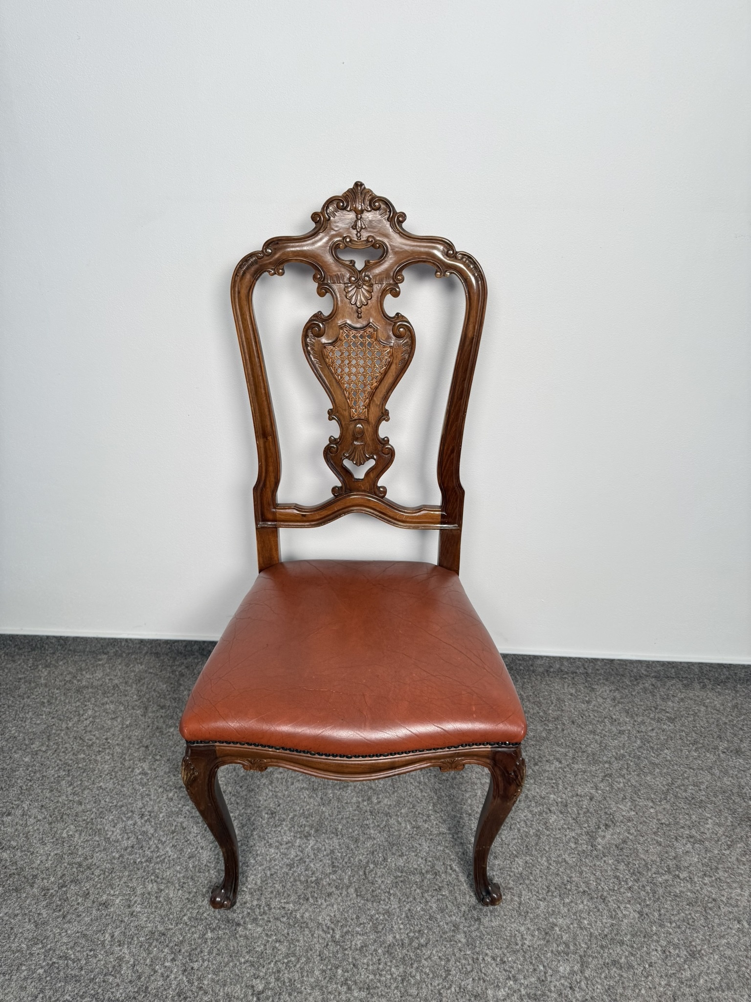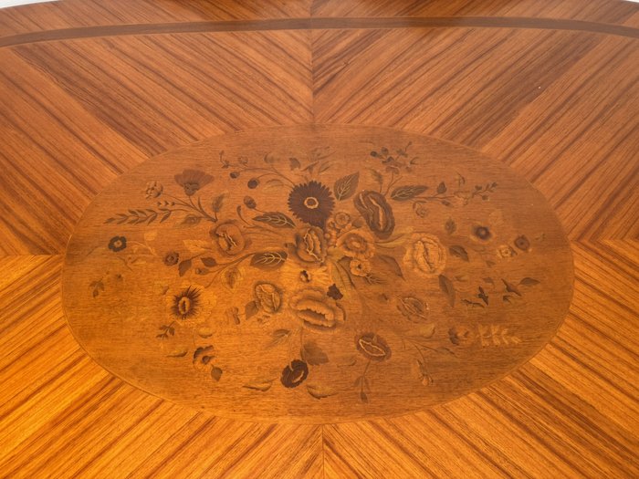 Reprezentativní jídelní set, tvořený oválným stolem a šesti čalouněnými židlemi. Deska stolu je zdobena květinovou intarzií ve středovém medailonu. Profilovaný okraj stolu doplňuje dekorativní kovový ornament. Dominantou je masivní středová podnož s výraznou řezbou akantových motivů a stabilní křížovou základnou. Šest stylových židlí s vyřezávanými opěráky harmonicky doplňuje celek. Stůl není rozkládací.