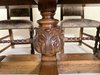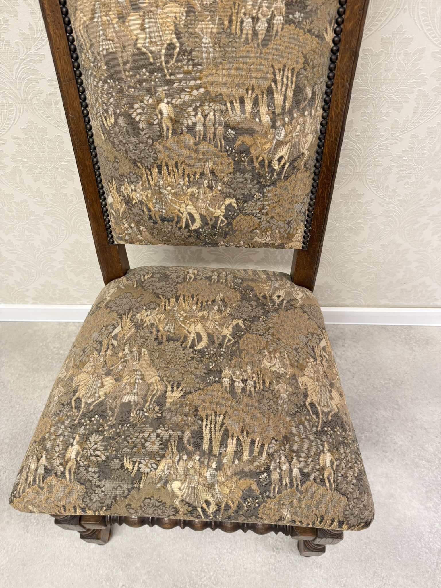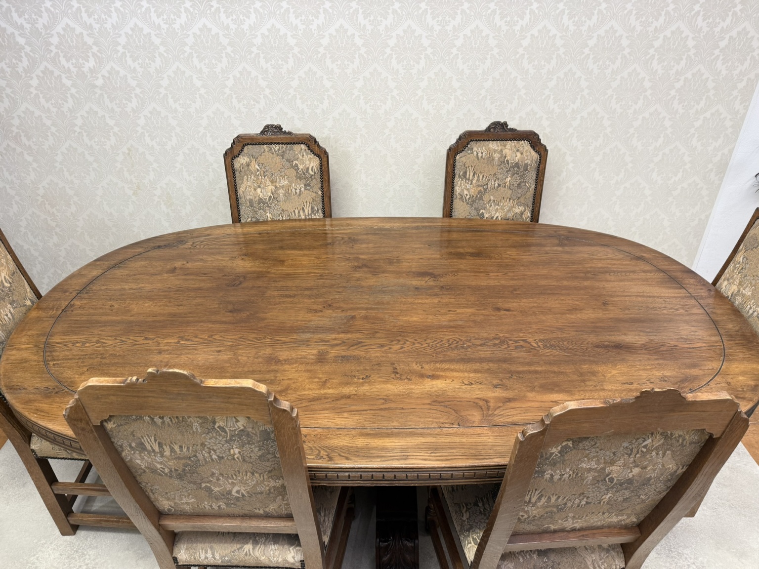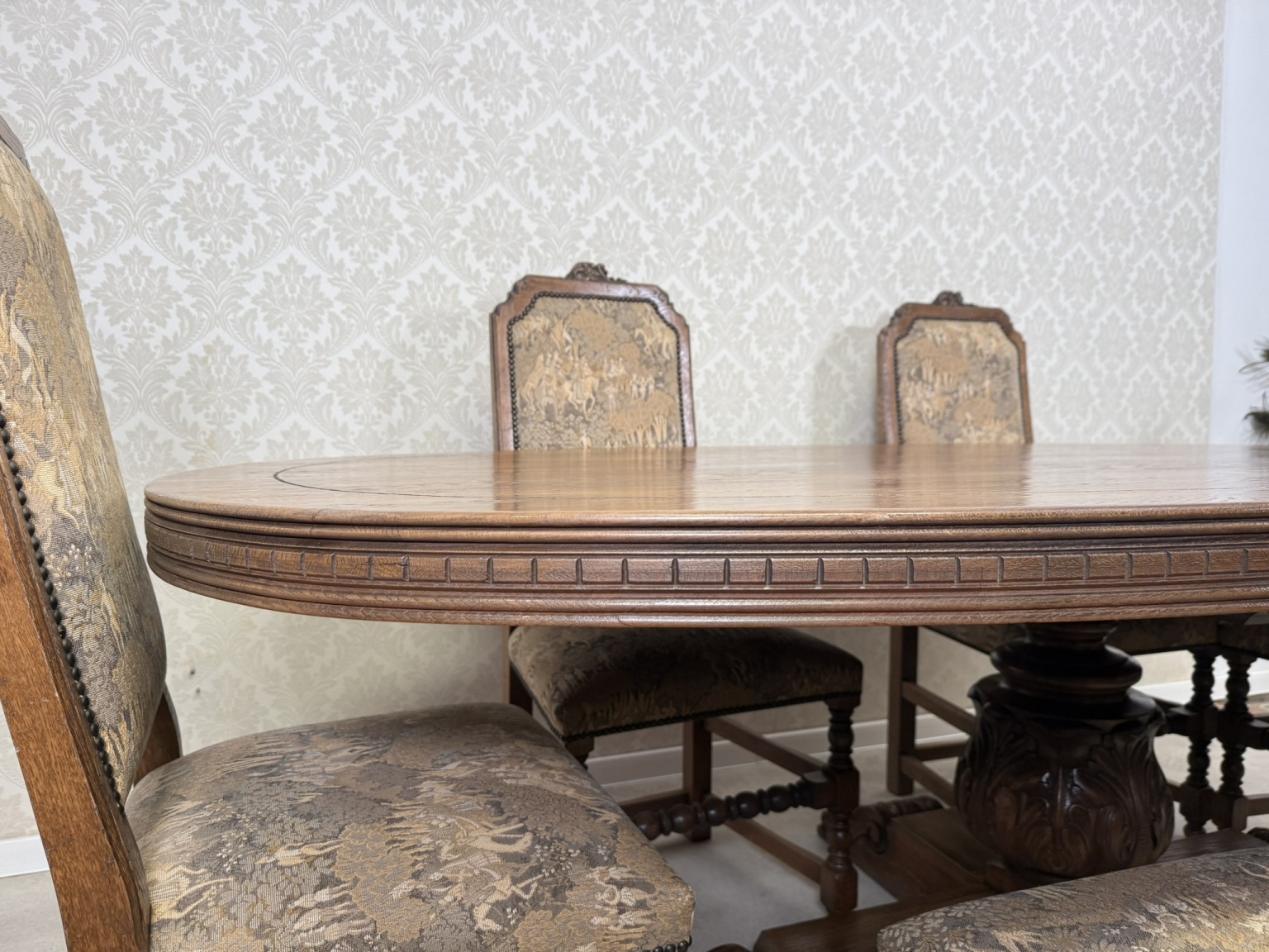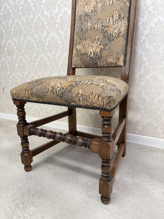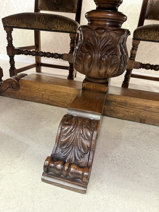 Jídelní souprava sestávající z velkého oválného stolu a 6 čalouněných židlí s vysokými opěradly. Stůl s výraznou centrální nohou s bohatou řezbou akantových listů a pevnou křížovou základnou. Židle mají dekorativně tvarovaná opěradla a čalounění s figurálními a loveckými motivy.24 570 Kč