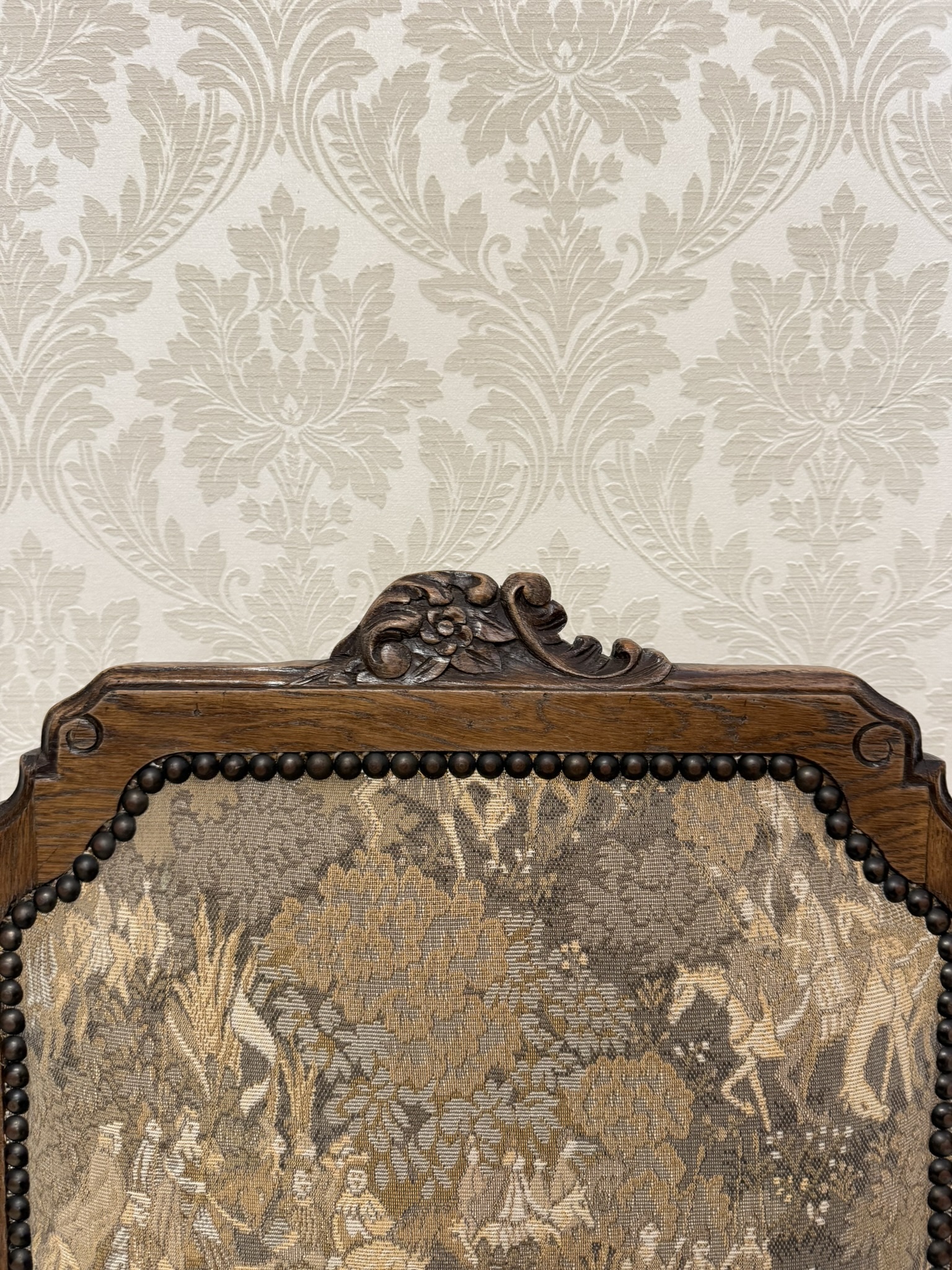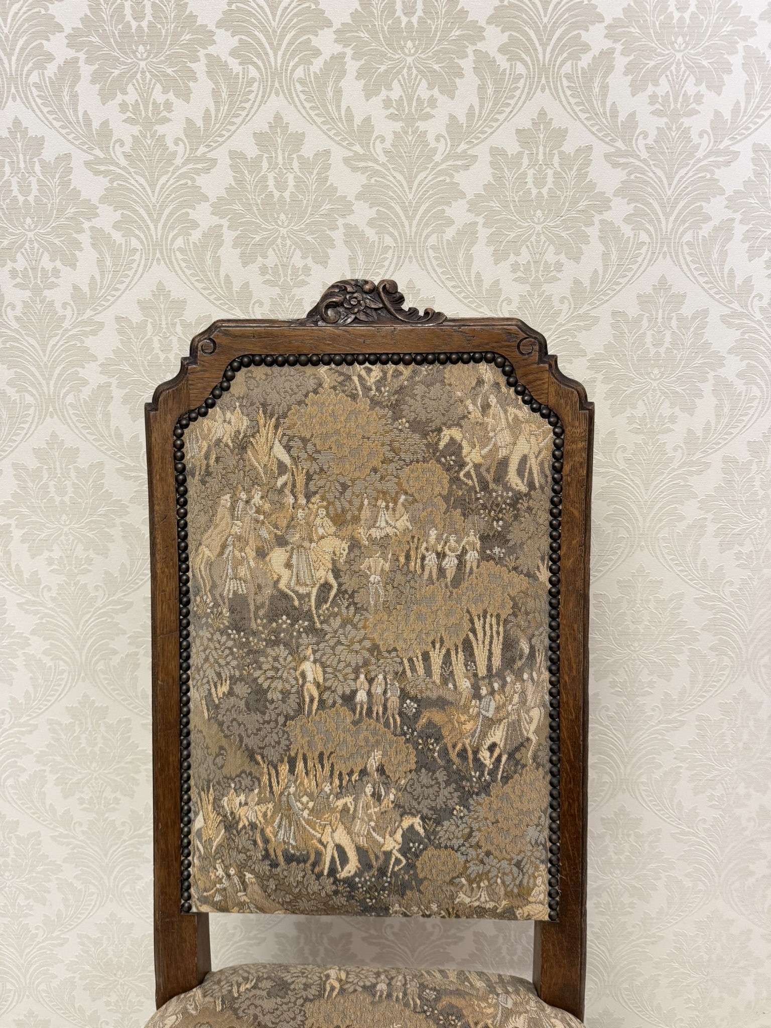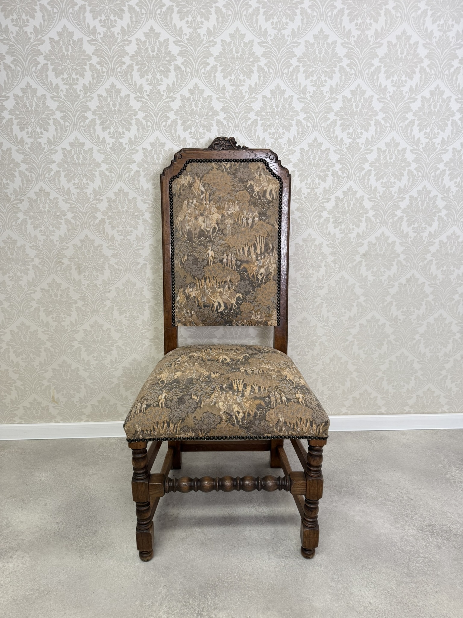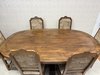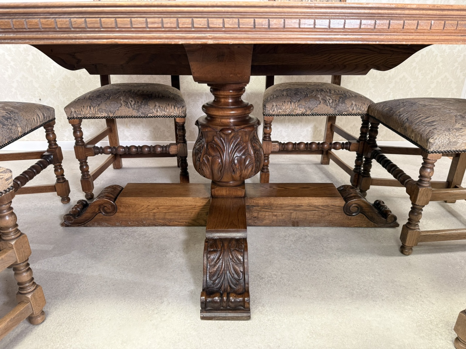 Jídelní souprava sestávající z velkého oválného stolu a 6 čalouněných židlí s vysokými opěradly. Stůl s výraznou centrální nohou s bohatou řezbou akantových listů a pevnou křížovou základnou. Židle mají dekorativně tvarovaná opěradla a čalounění s figurálními a loveckými motivy.24 570 Kč