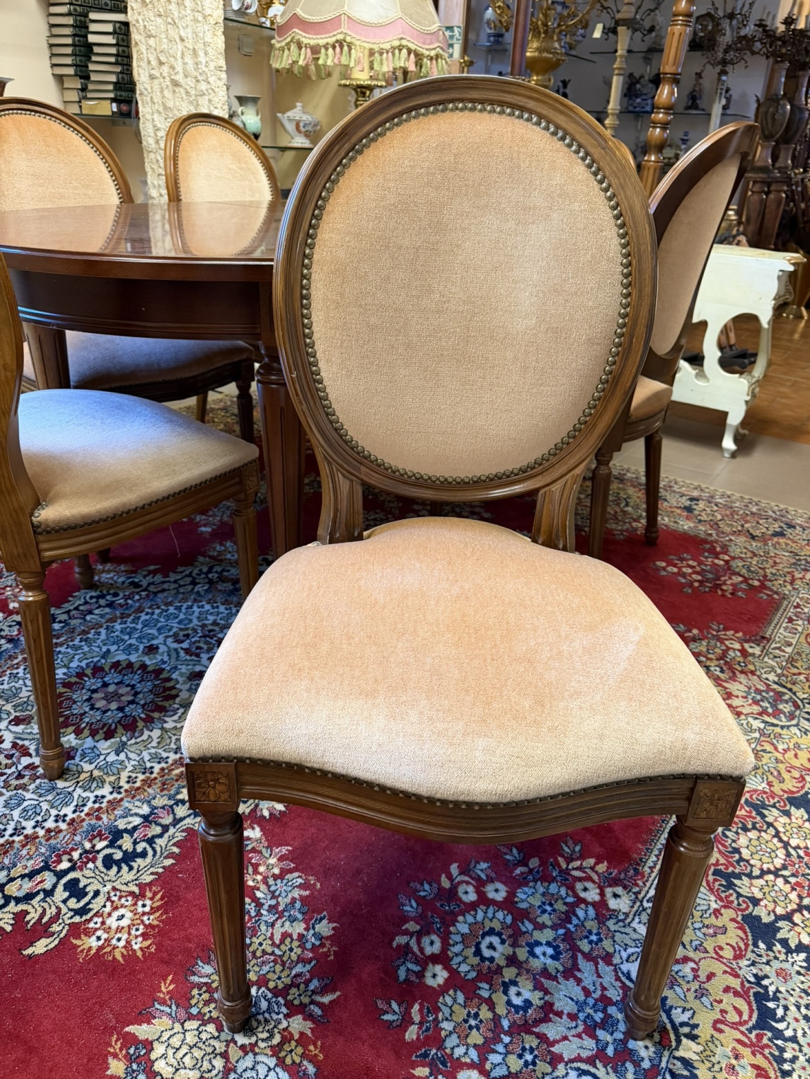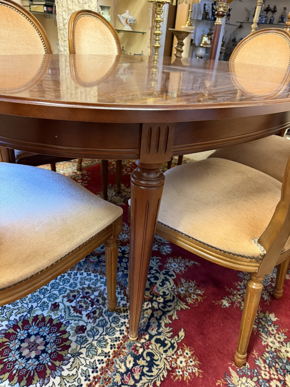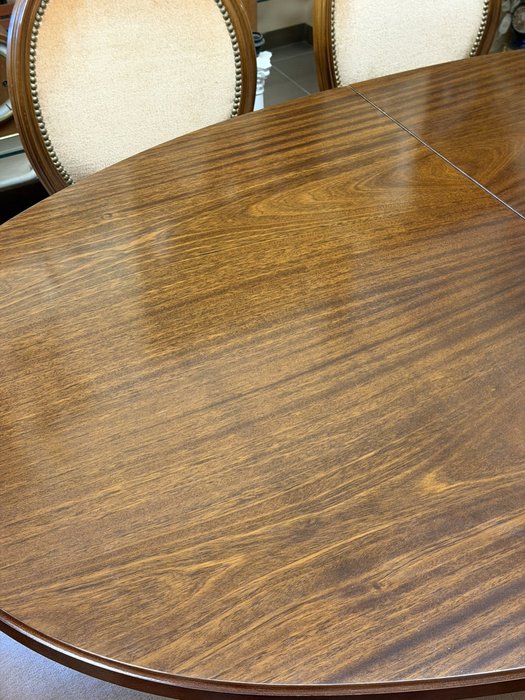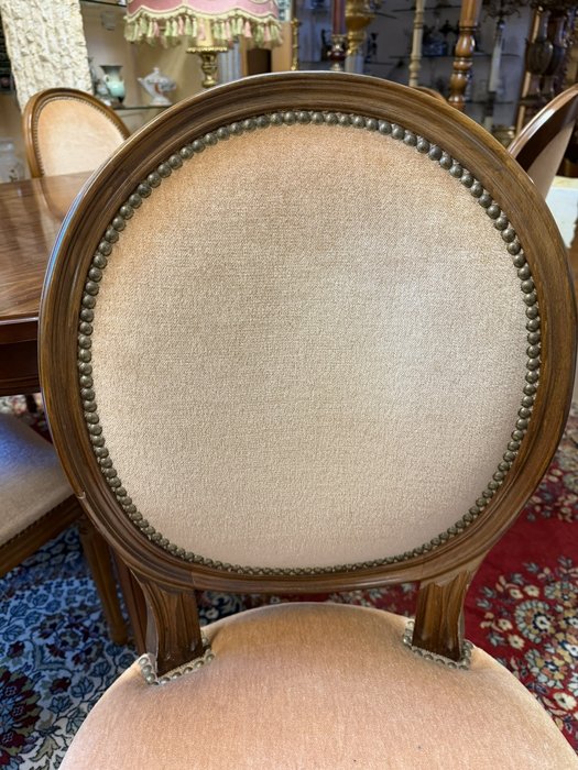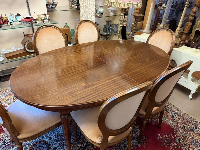 Sestava se skládá z elegantního oválného stolu s možností rozkladu a šesti ladících židlí s oválnými opěradly. Židle jsou čalouněné ve světlém sametovém potahu, lemovaném kovovými hřebíčky. Rámová konstrukce i nohy stolu a židlí nesou jednoduché, klasicistně inspirované řezby. Stůl má dýhovanou desku s jemnou kresbou dřeva.
