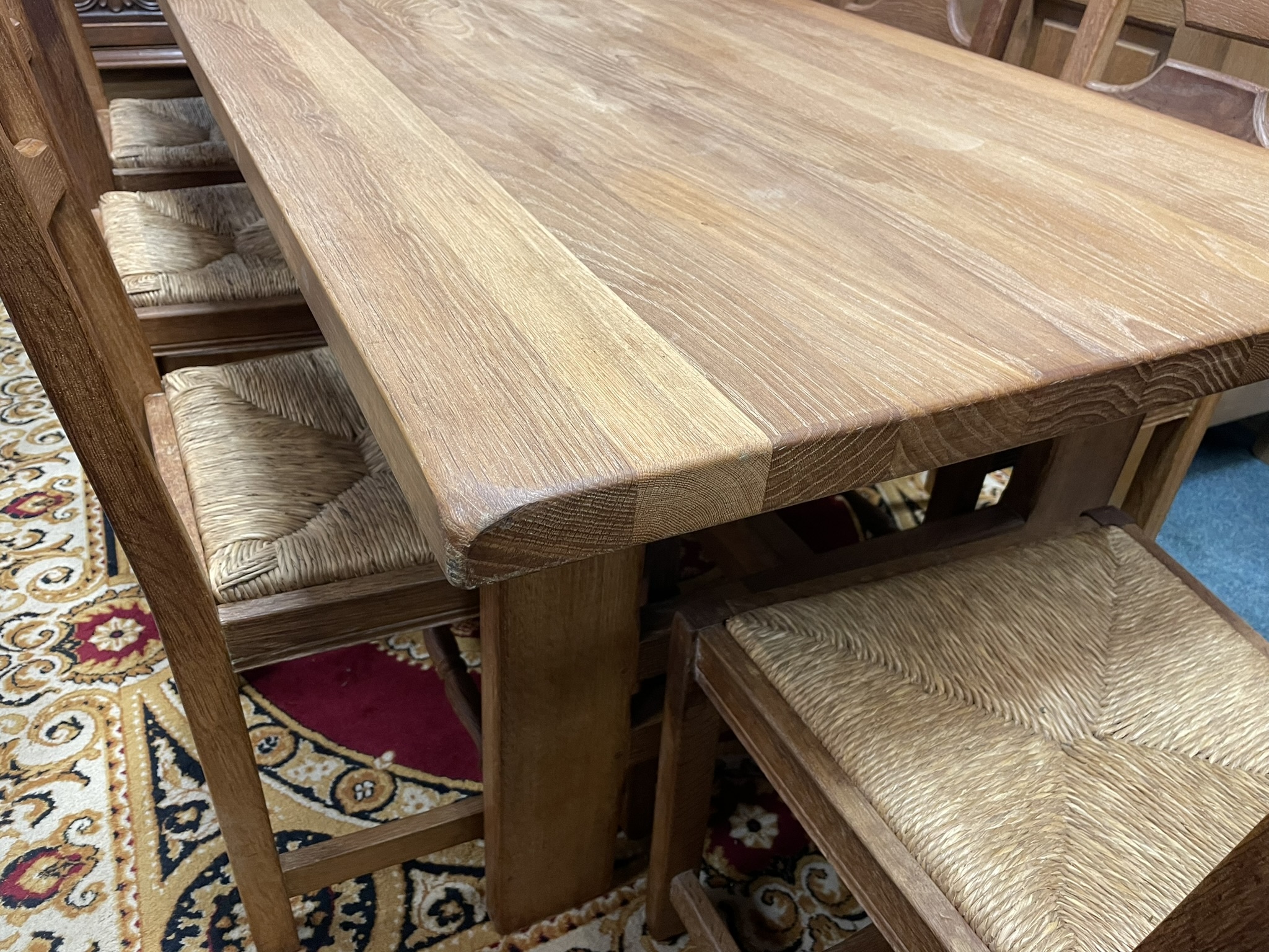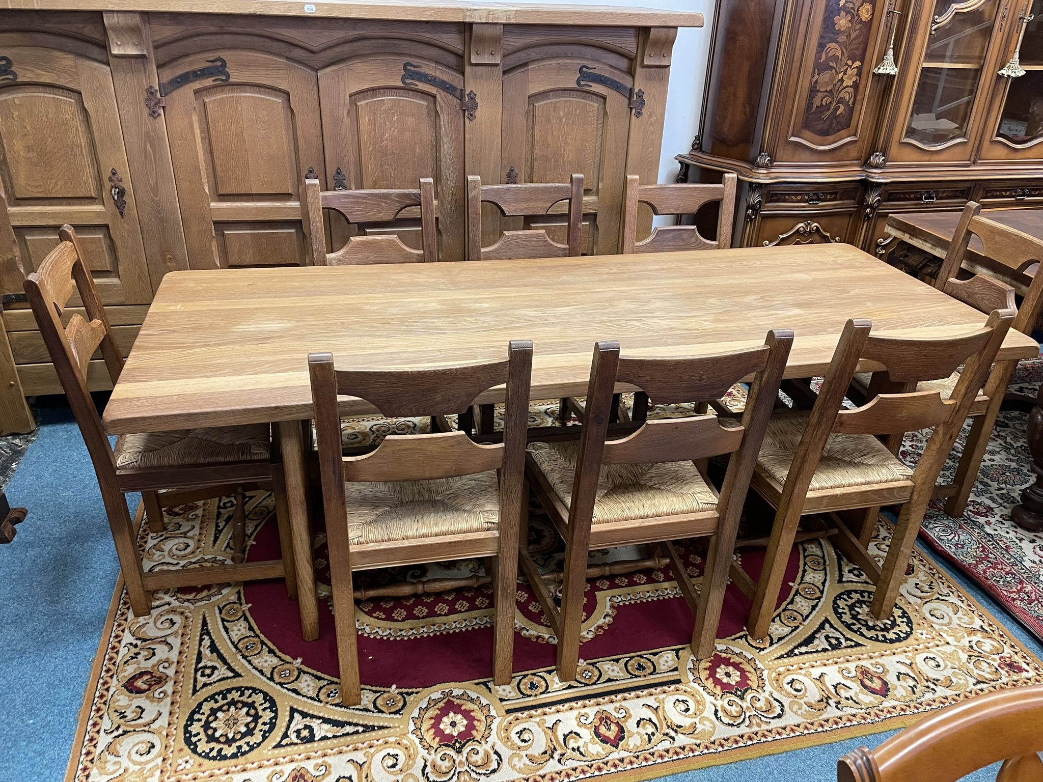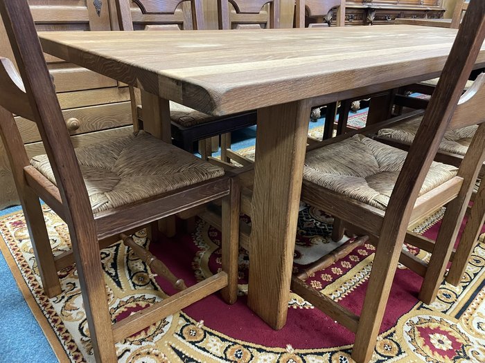 Reprezentativní jídelní set, tvořený oválným stolem a šesti čalouněnými židlemi. Deska stolu je zdobena květinovou intarzií ve středovém medailonu. Profilovaný okraj stolu doplňuje dekorativní kovový ornament. Dominantou je masivní středová podnož s výraznou řezbou akantových motivů a stabilní křížovou základnou. Šest stylových židlí s vyřezávanými opěráky harmonicky doplňuje celek. Stůl není rozkládací.