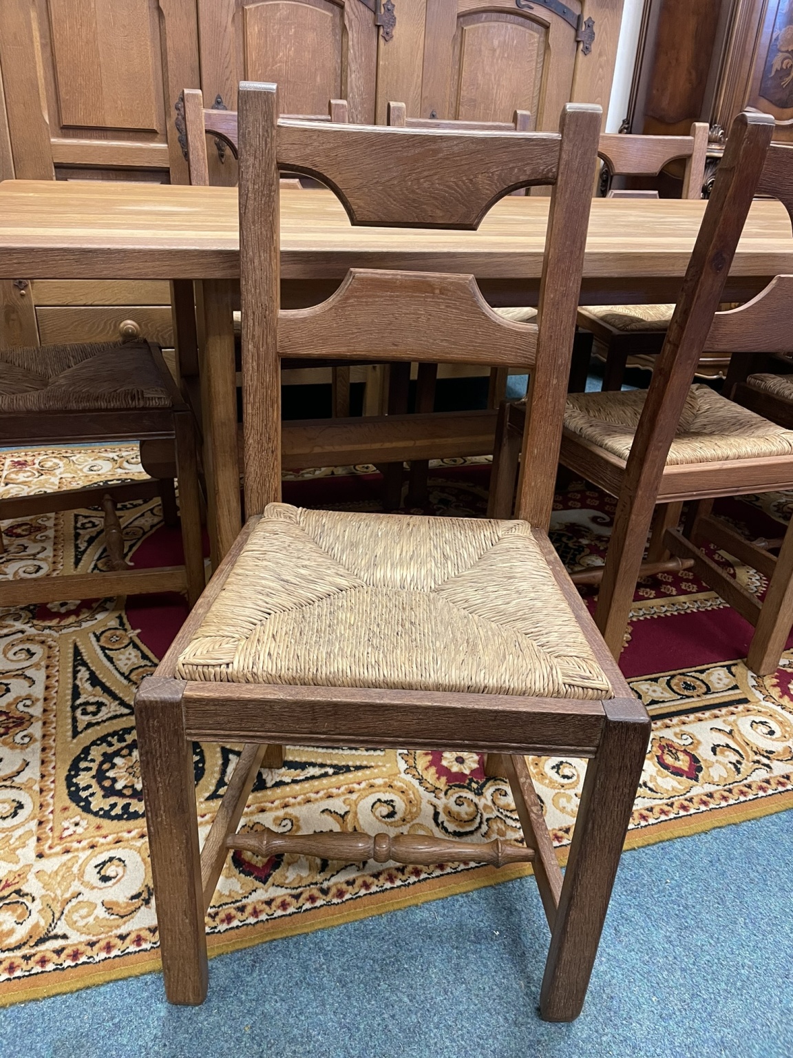 Jídelní sestava, tvořená elegantním oválným stolem s výraznou kresbou dřeva v teplém červenohnědém odstínu a šesti židlemi s vyřezávanými rámy, zdobenými zlacením. Židle mají čalounění v jemném modrozeleném odstínu, které kontrastuje s bílou a zlatou patinou rámů. Stůl není rozkládací.Jídelní stůl s čalouněnými židlemi