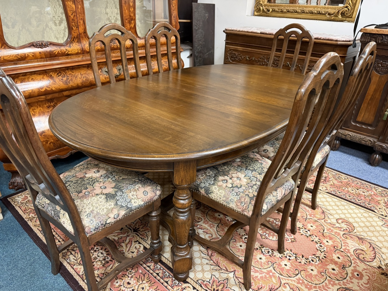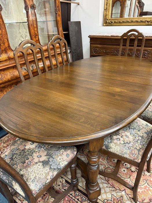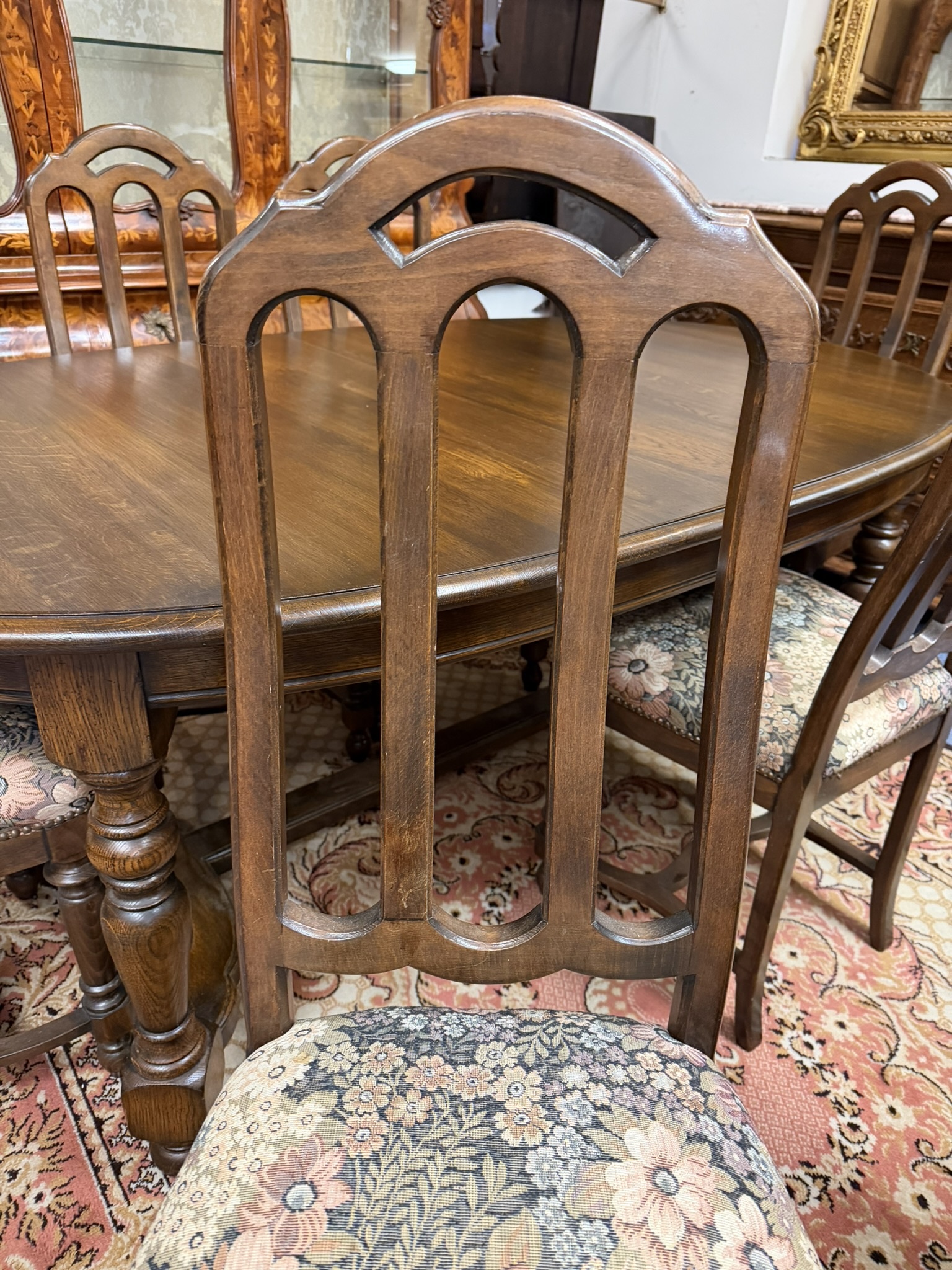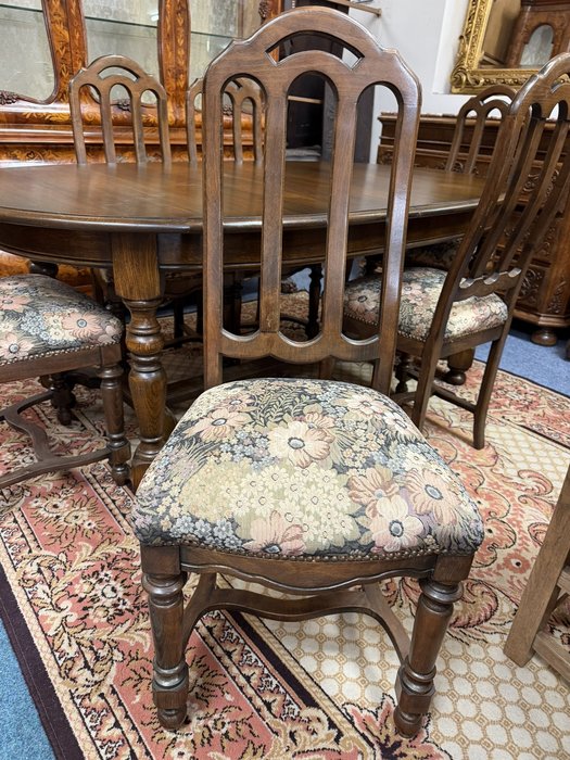 Jídelní set tvořený rozkládacím oválným stolem s šesti židlemi s členitými opěradly. Konstrukce působí elegantně a židle jsou zpevněny pevnými výztuhami. Čalounění s květinovým motivem dodává celému setu dekorativní vzhled.14 850 Kč