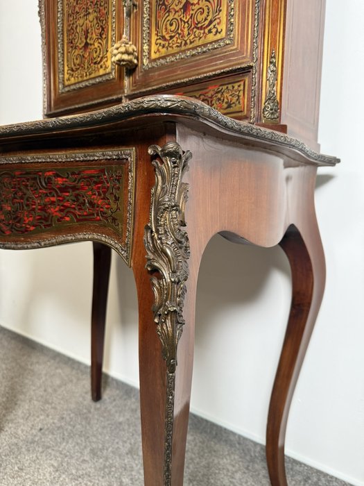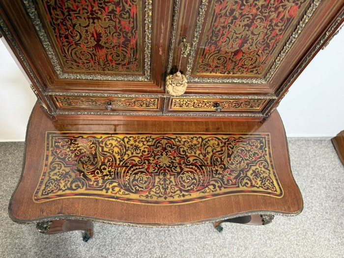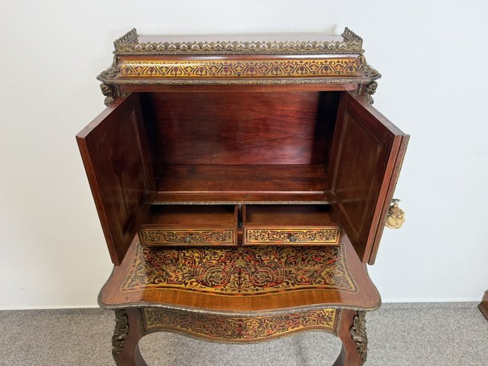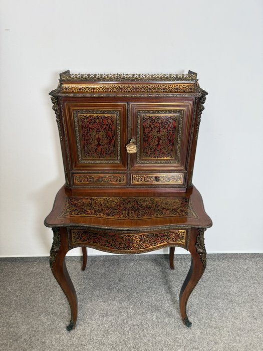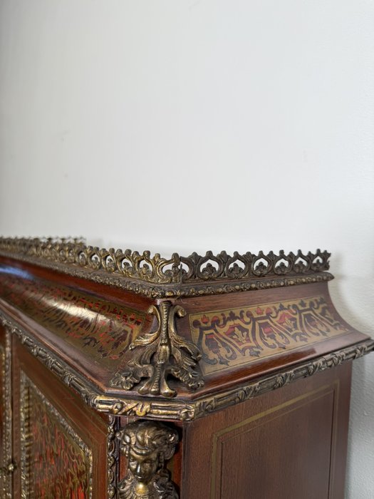 Reprezentativní kabinet s bohatou mosaznou intarzií typu boulle na dvířkách, zásuvce a horní části, podloženou červeným podkladem. Třírozměrné dekorativní aplikace z bronzu – včetně maskaronů, rohových ozdob a kovového zábradlí – podtrhují slavnostní výraz.38 960 Kč