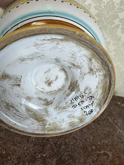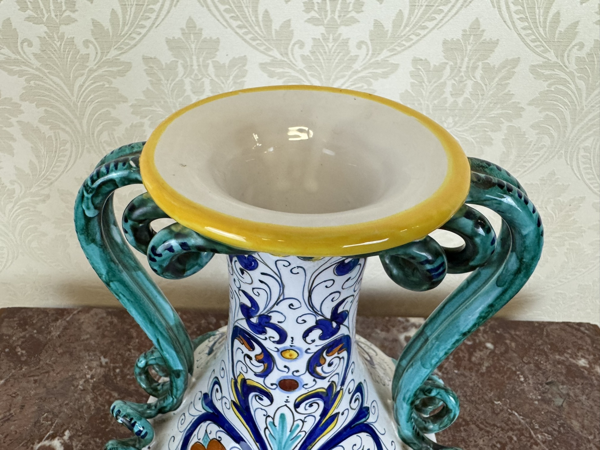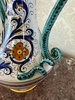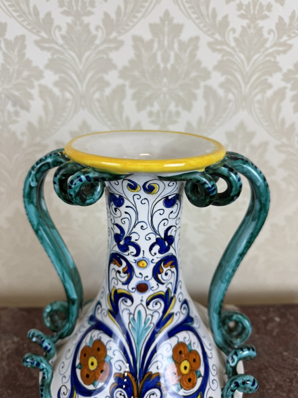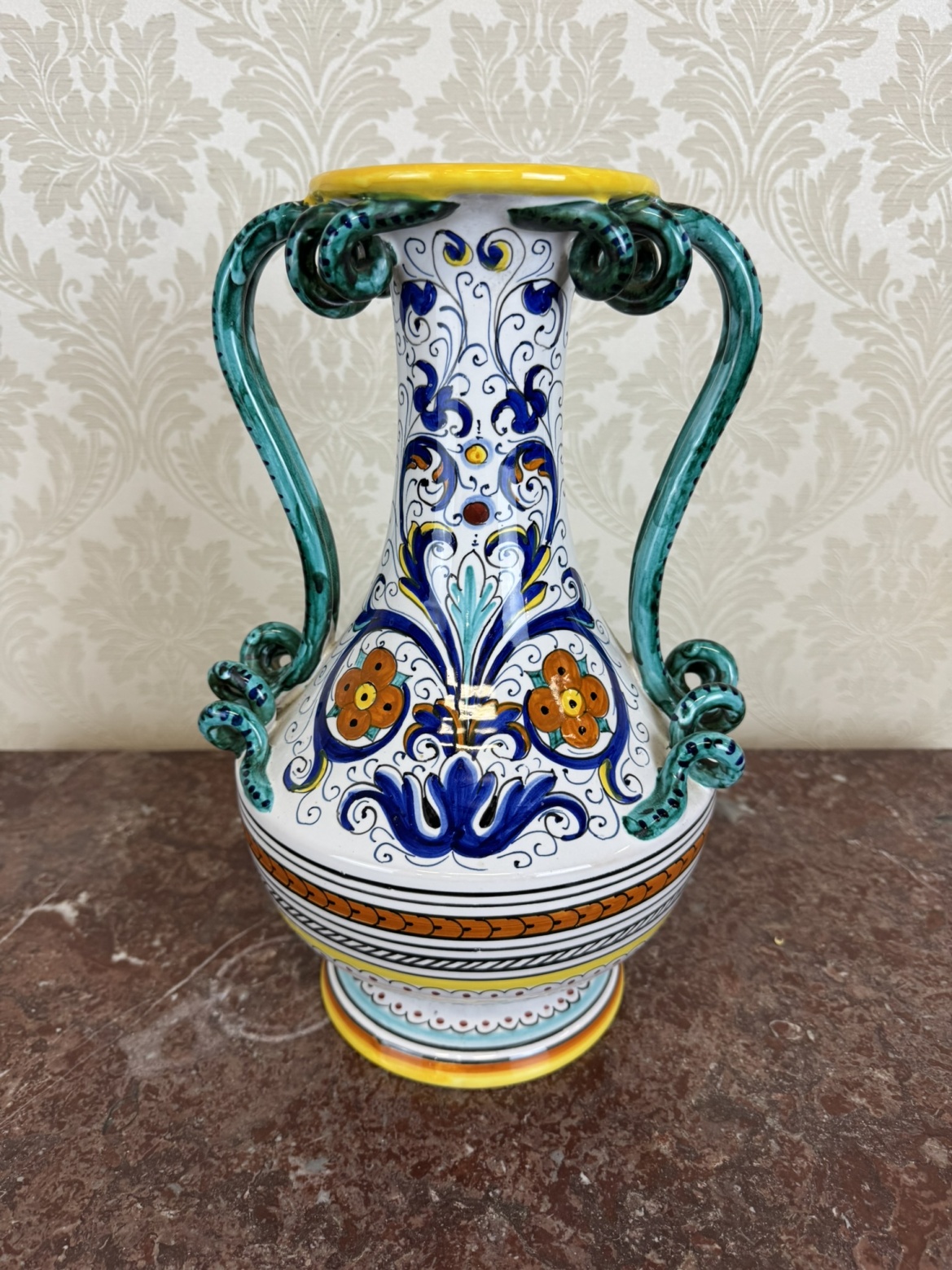 Keramická váza má bílé glazované tělo zdobené modrým, oranžovým a žlutým malovaným ornamentem s rostlinnými motivy. Po stranách se zvedají dvě zelené kroucené ucha, které se v horní části připojují k žlutě lemovanému hrdlu.1 480 Kč