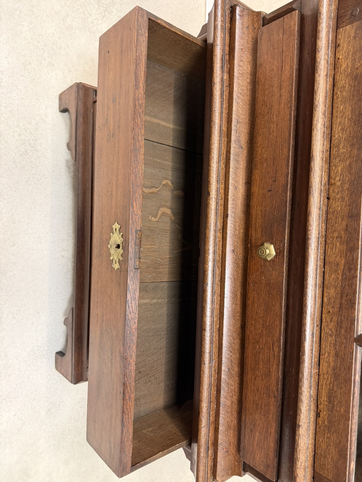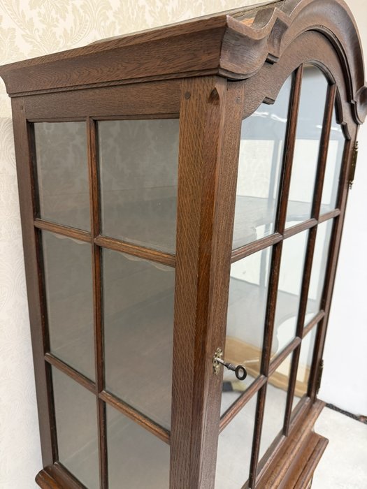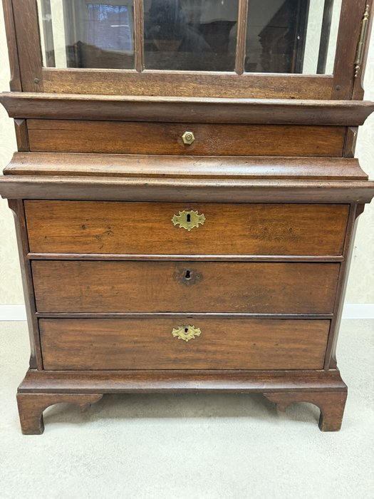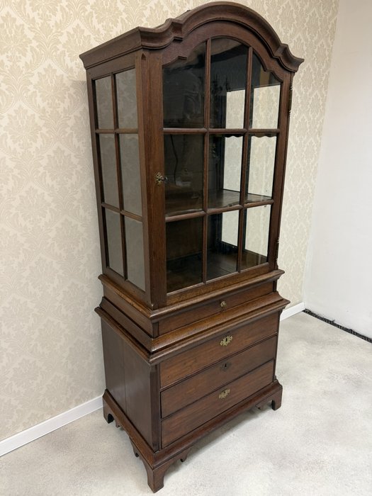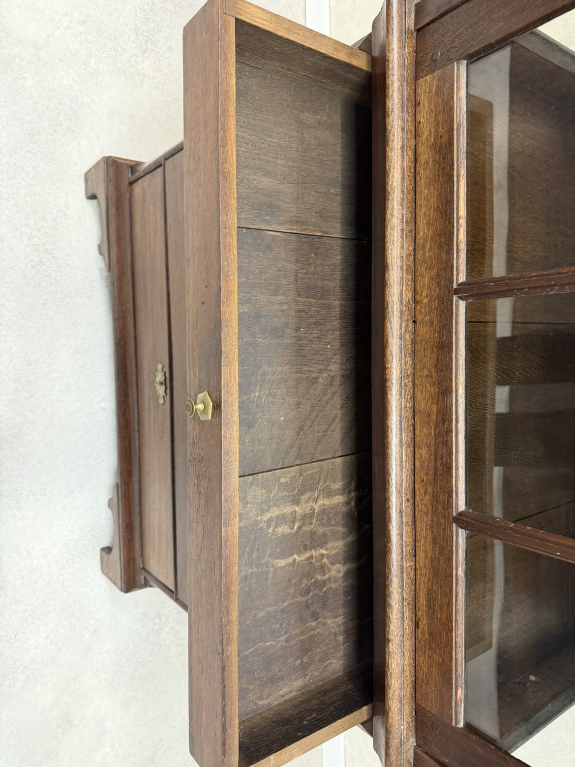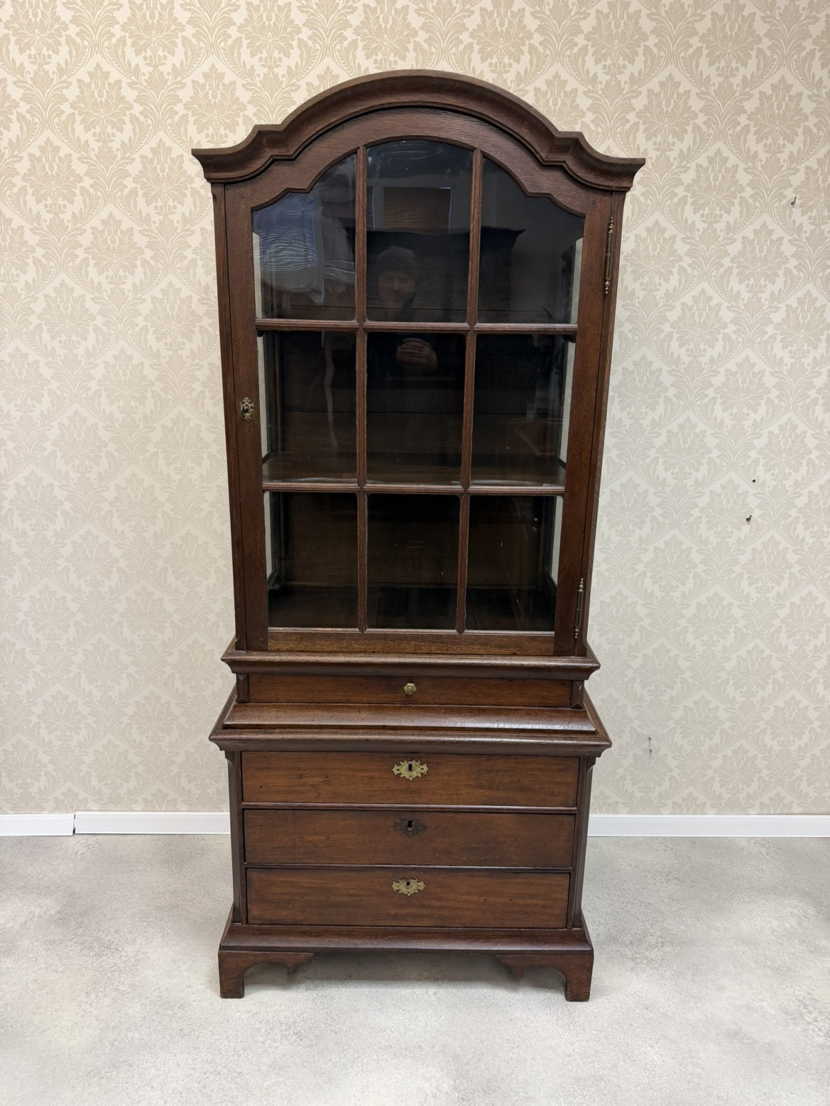 Knihovna s horní prosklenou částí a profilovaným nástavcem. Vnitřní police jsou tvarovány s lehkými oblouky. Spodní část tvoří zásuvky s mosaznými úchyty a profilovaným předělem. Vhodná pro uložení knih nebo dekorací.10 850 Kč