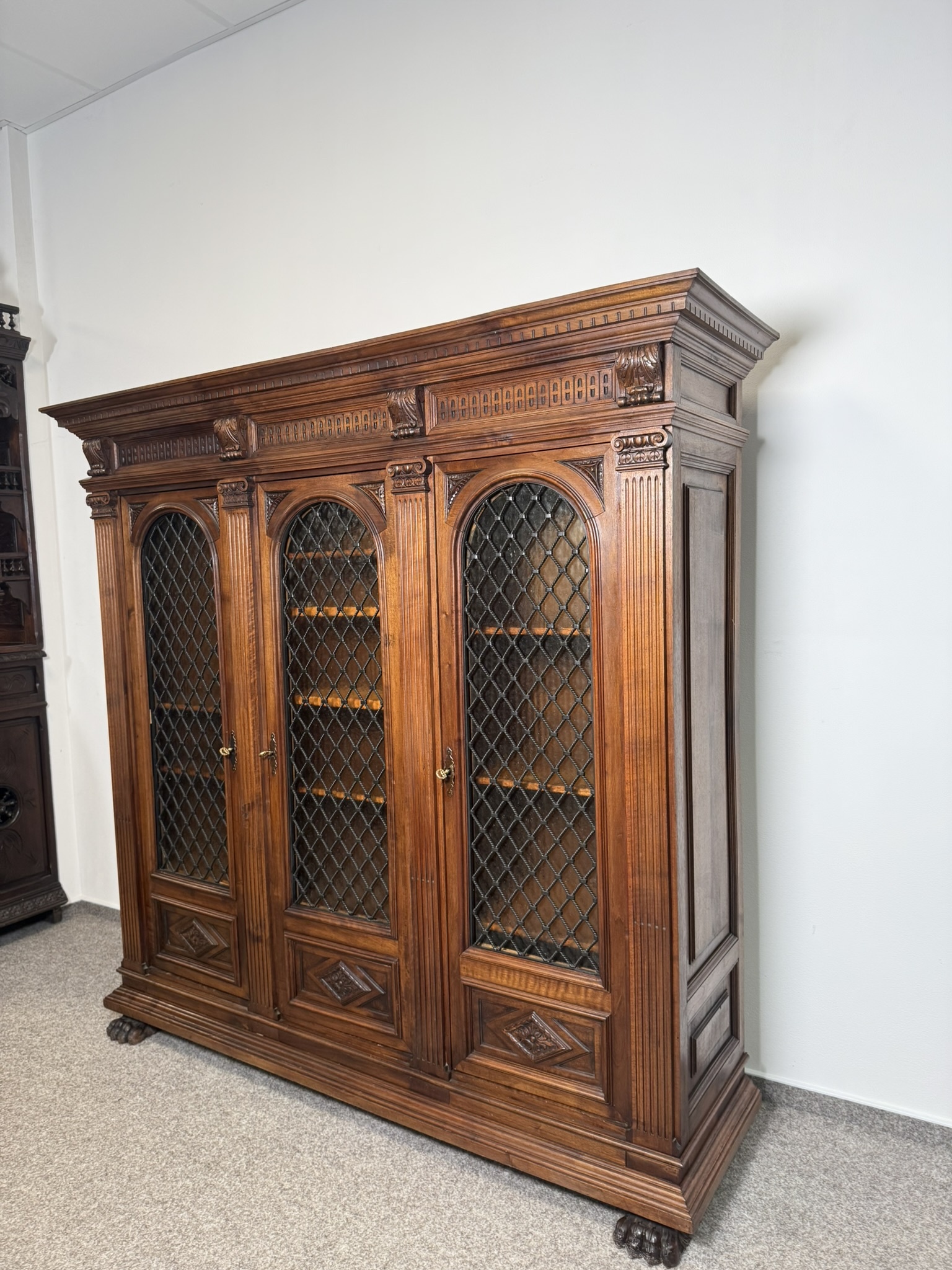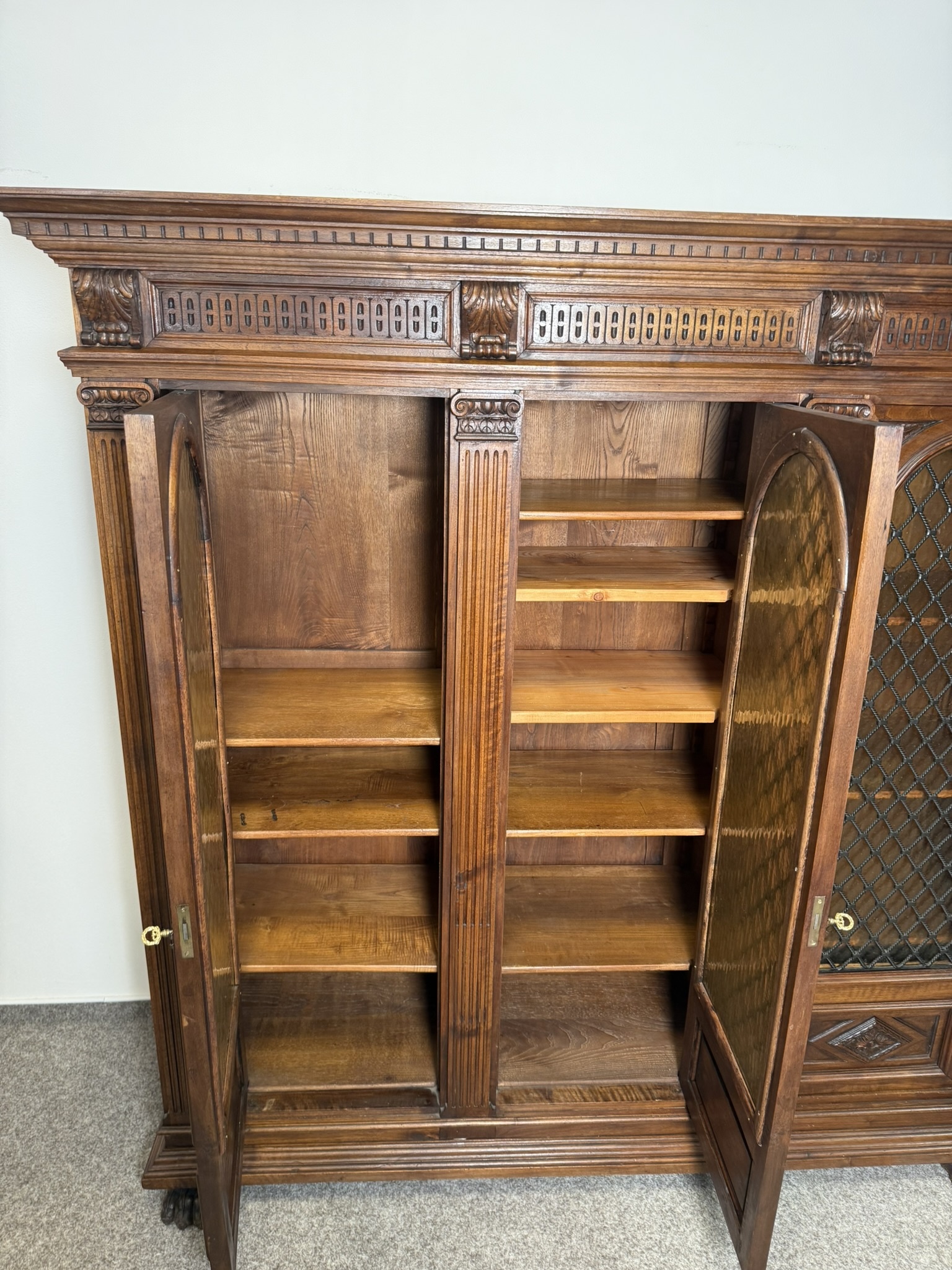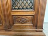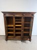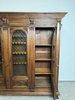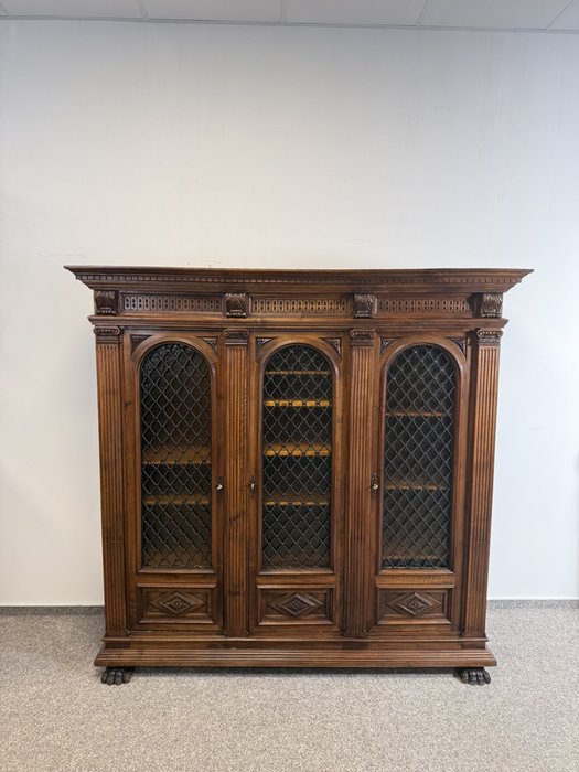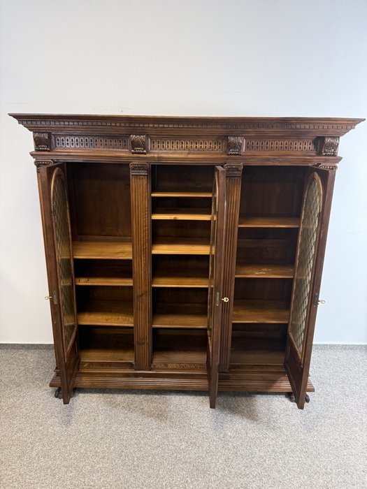 Třídveřová knihovna z tmavého dřeva s prosklenými dveřmi členěnými dekorativní mřížkou. Horní profilovaná římsa zdobená řezbou, pilastry se svislým profilováním a hlavicemi. Vnitřní prostor je rozdělen do několika polic pro uložení knih.23 630 Kč