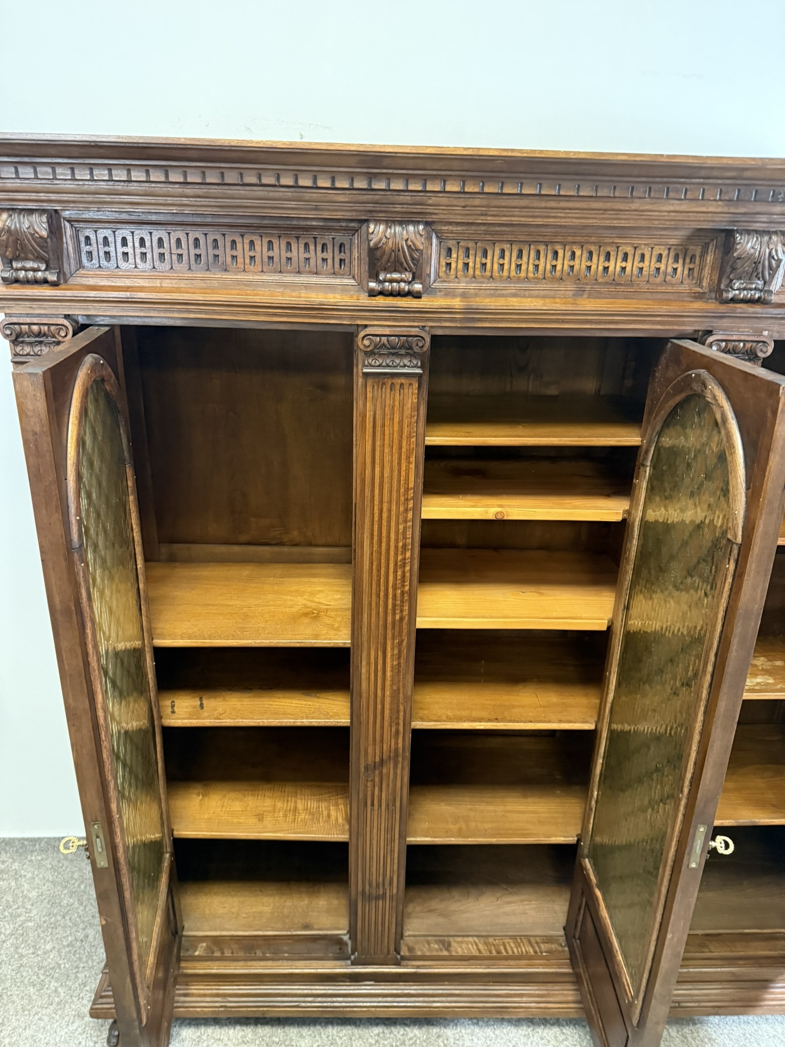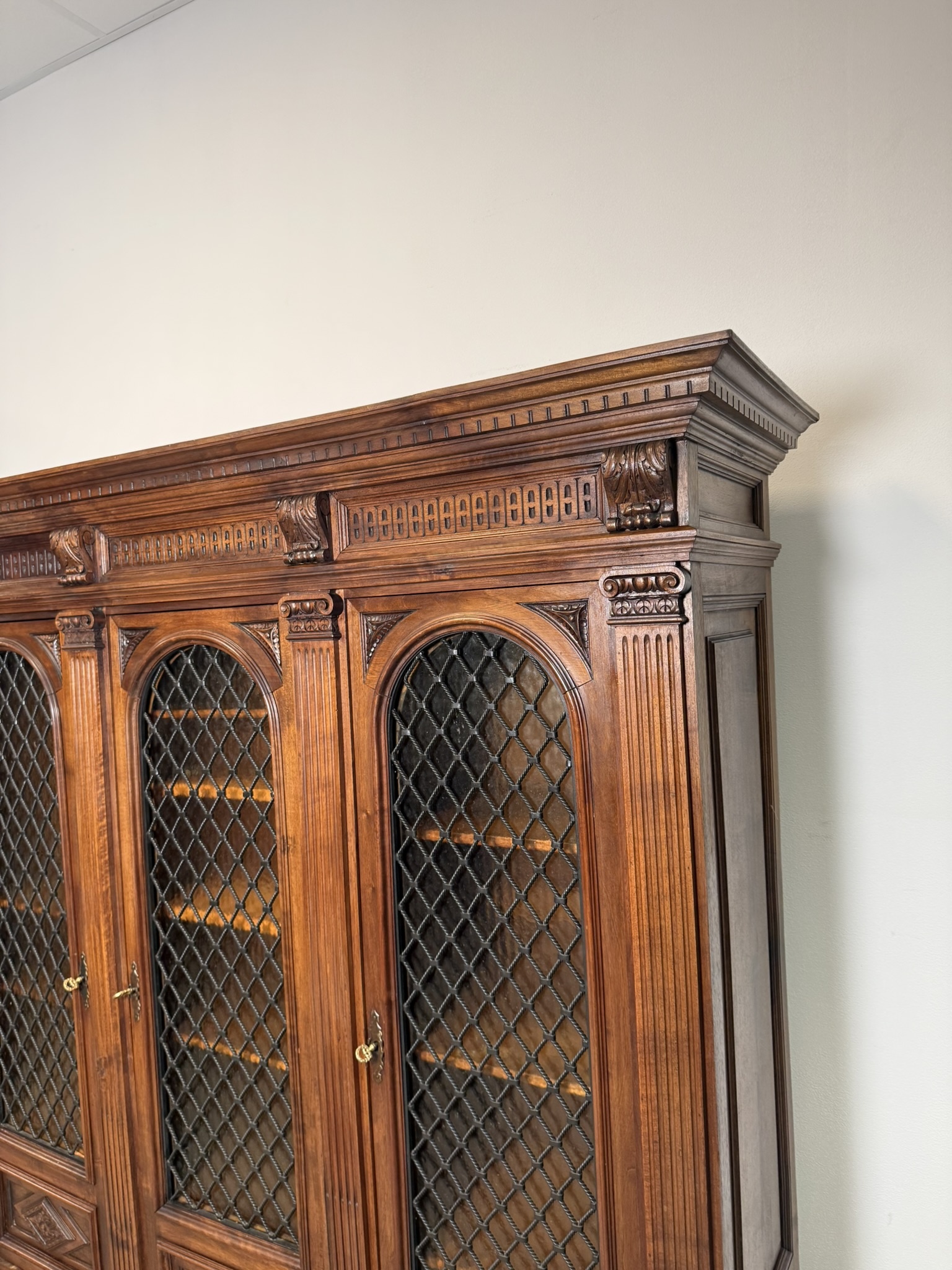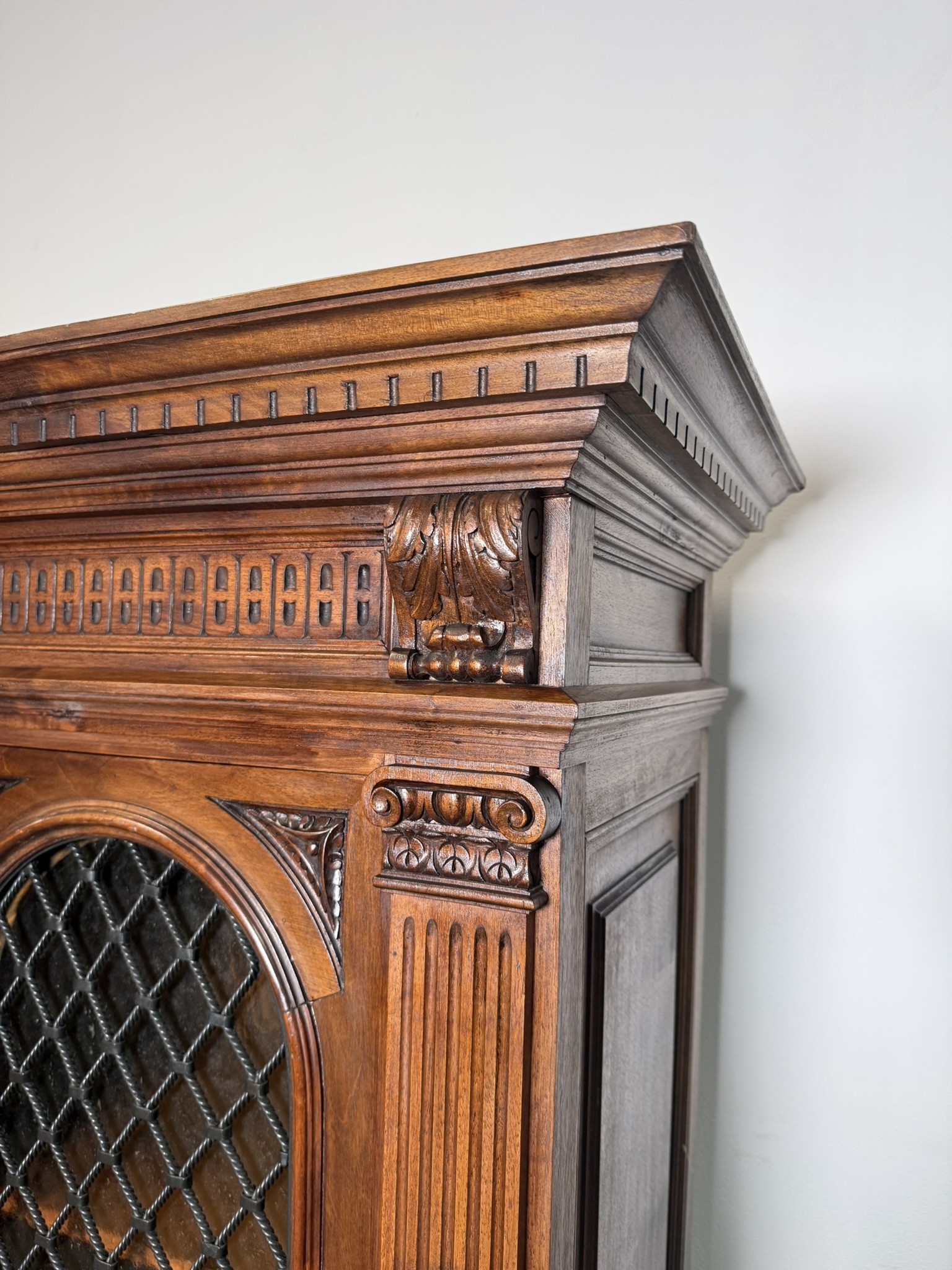 Třídveřová knihovna z tmavého dřeva s prosklenými dveřmi členěnými dekorativní mřížkou. Horní profilovaná římsa zdobená řezbou, pilastry se svislým profilováním a hlavicemi. Vnitřní prostor je rozdělen do několika polic pro uložení knih.23 630 Kč