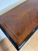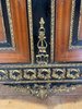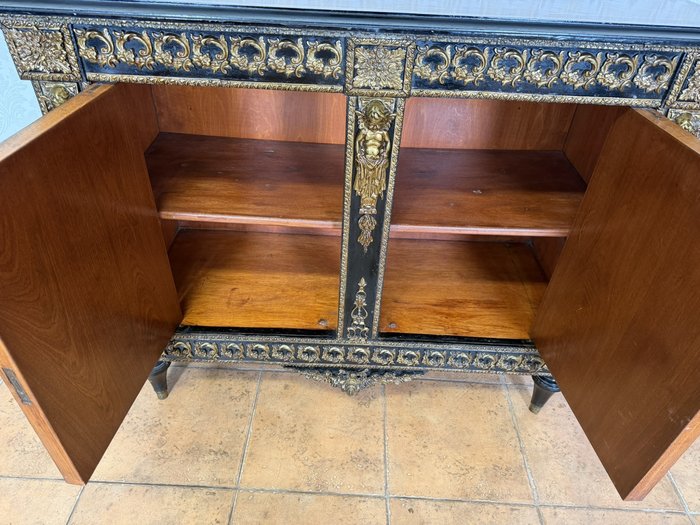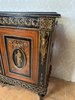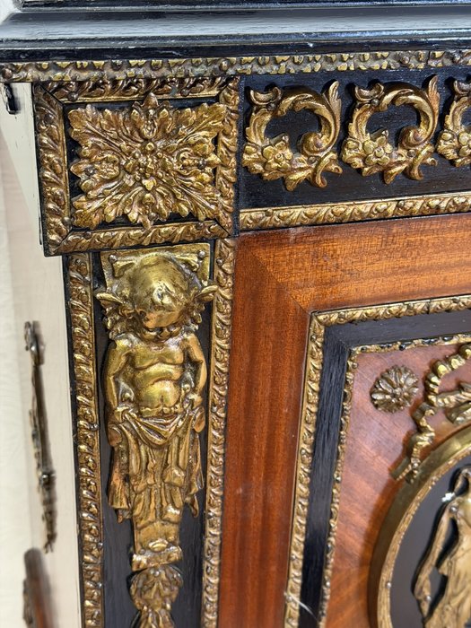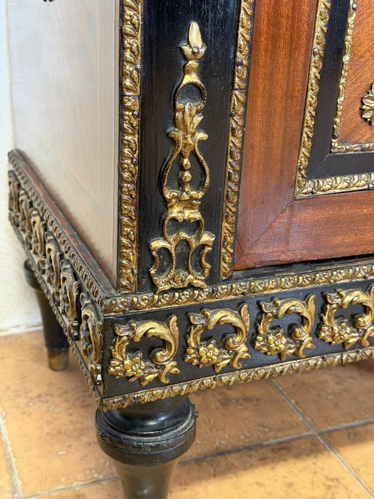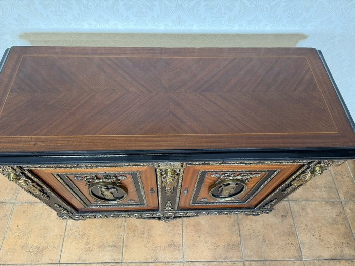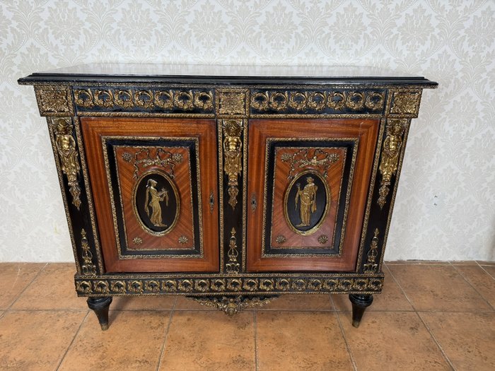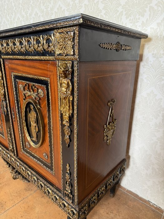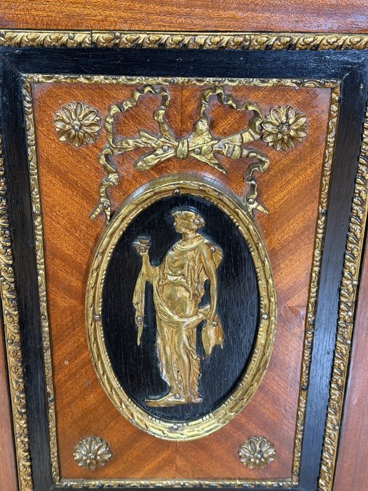 Elegantní komoda, pocházející z Francie, zaujme bohatou výzdobou a kvalitním řemeslným zpracováním. Korpus je dýhován ušlechtilým dřevem s výraznou kresbou, doplněn kontrastními černě mořenými prvky. Čela dveří zdobí medailony s figurálními motivy, inspirovanými antikou, typickými pro francouzský neoklasicismus. Bohaté bronzové aplikace, girlandy a ornamentální pásy podtrhují luxusní charakter nábytku.
