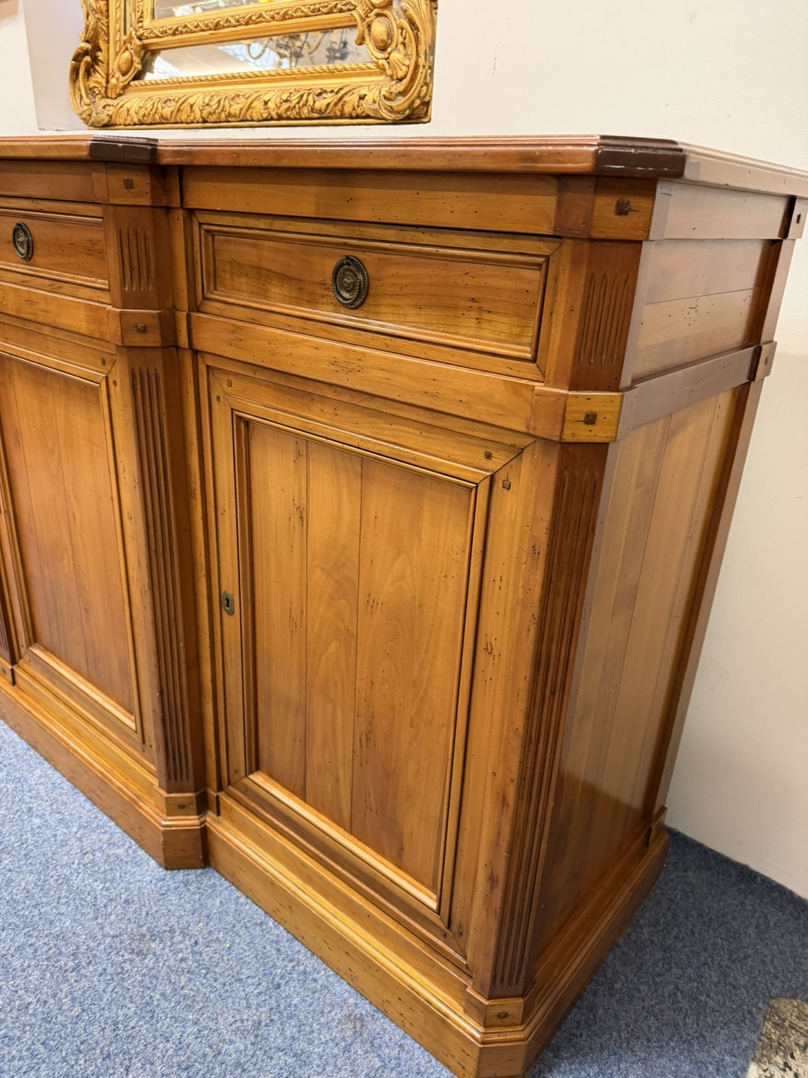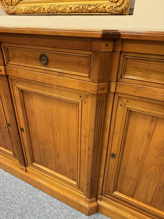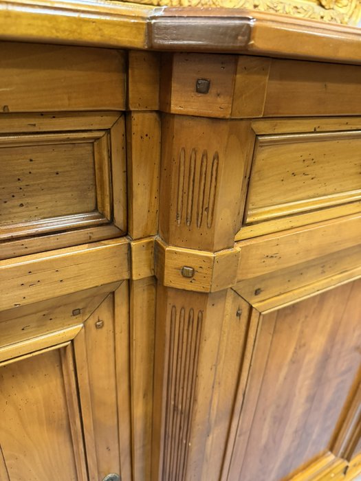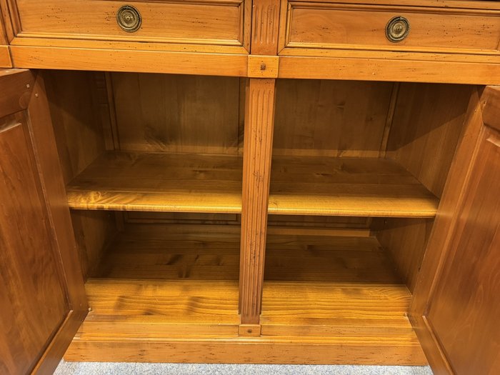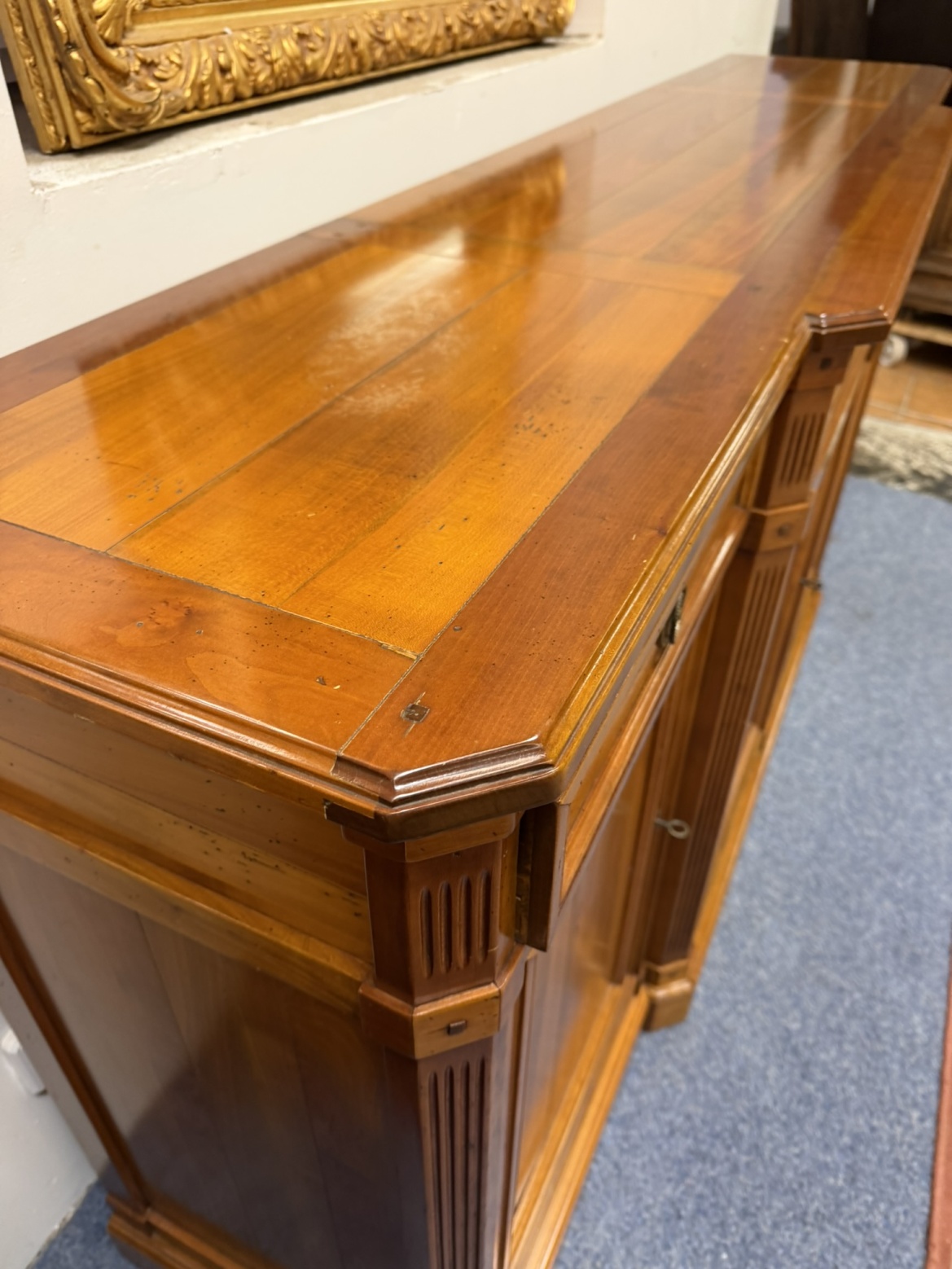 Komoda z třešňového masivu s kazetovými dvířky a zásuvkami, doplněná svislým ozdobným dělením a členěním. Teplý odstín dřeva zvýrazňuje kresbu a precizní truhlářské zpracování. Nabízí dostatek úložného prostoru. Mosazné úchytky s decentní patinou harmonicky ladí s celkovým pojetím.15 650 Kč